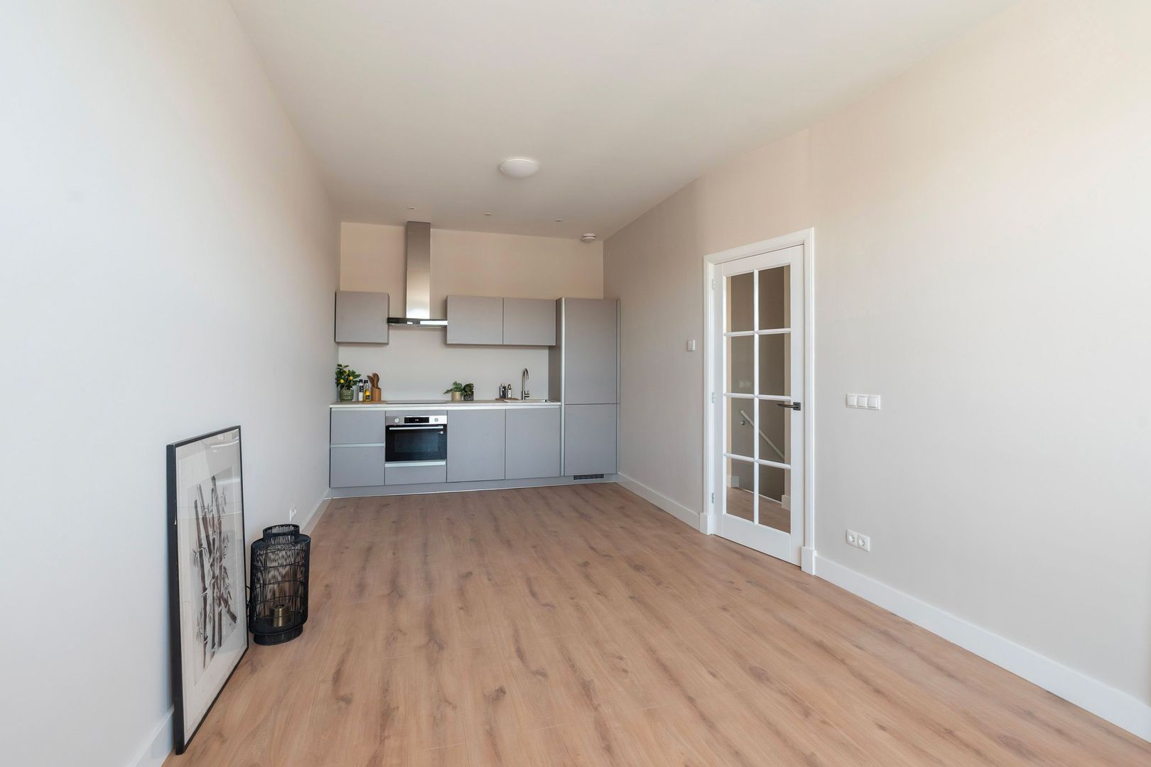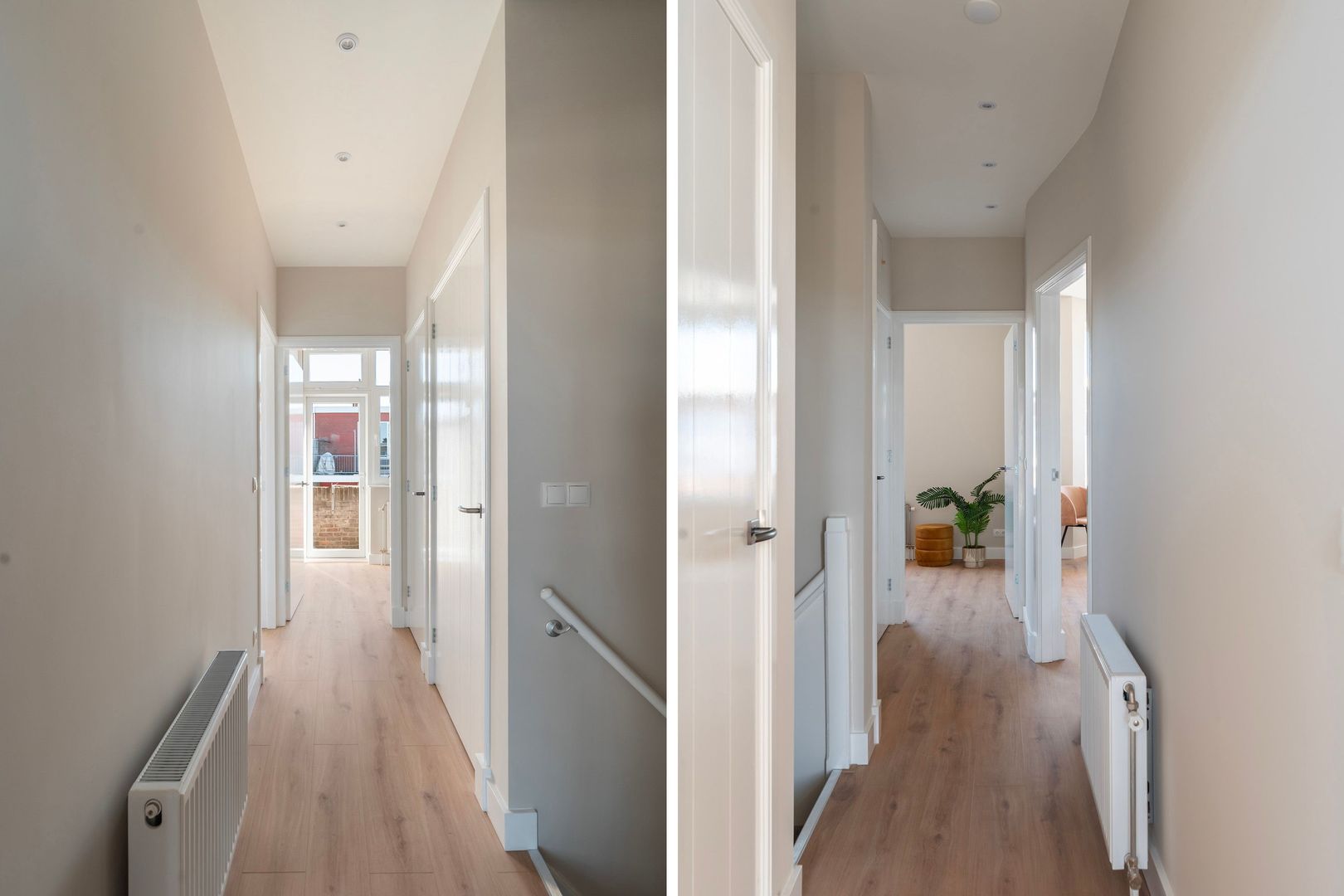 Woningentree via open portiek; hal met meterkast en binnentrap naar de overloop op de 2e etage; vaste kast; vaste kast met de aansluiting voor de wasmachine; woonkamer met een sfeervolle erker en een fraaie moderne open keuken voorzien van een inductiekookplaat, afzuigkap, oven, koel-vriescombinatie en een vaatwasser; 1e slaapkamer aan de voorzijde; 2e slaapkamer aan de achterzijde; 3e slaapkamer aan de achterzijde met toegang tot het balkon; moderne badkamer met inloopdouche en wastafelmeubel; modern separaat toilet (wandcloset) met fonteintje;