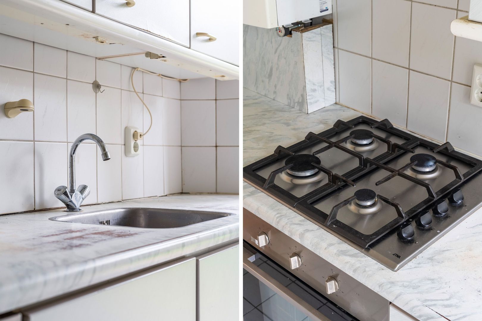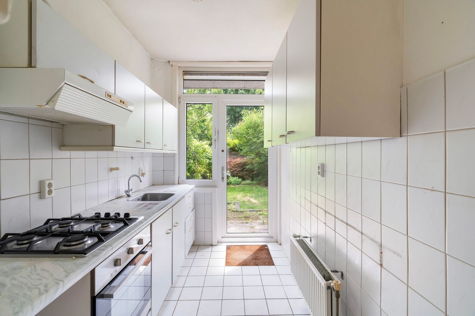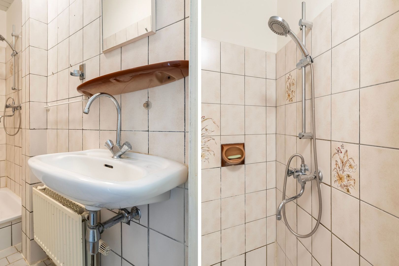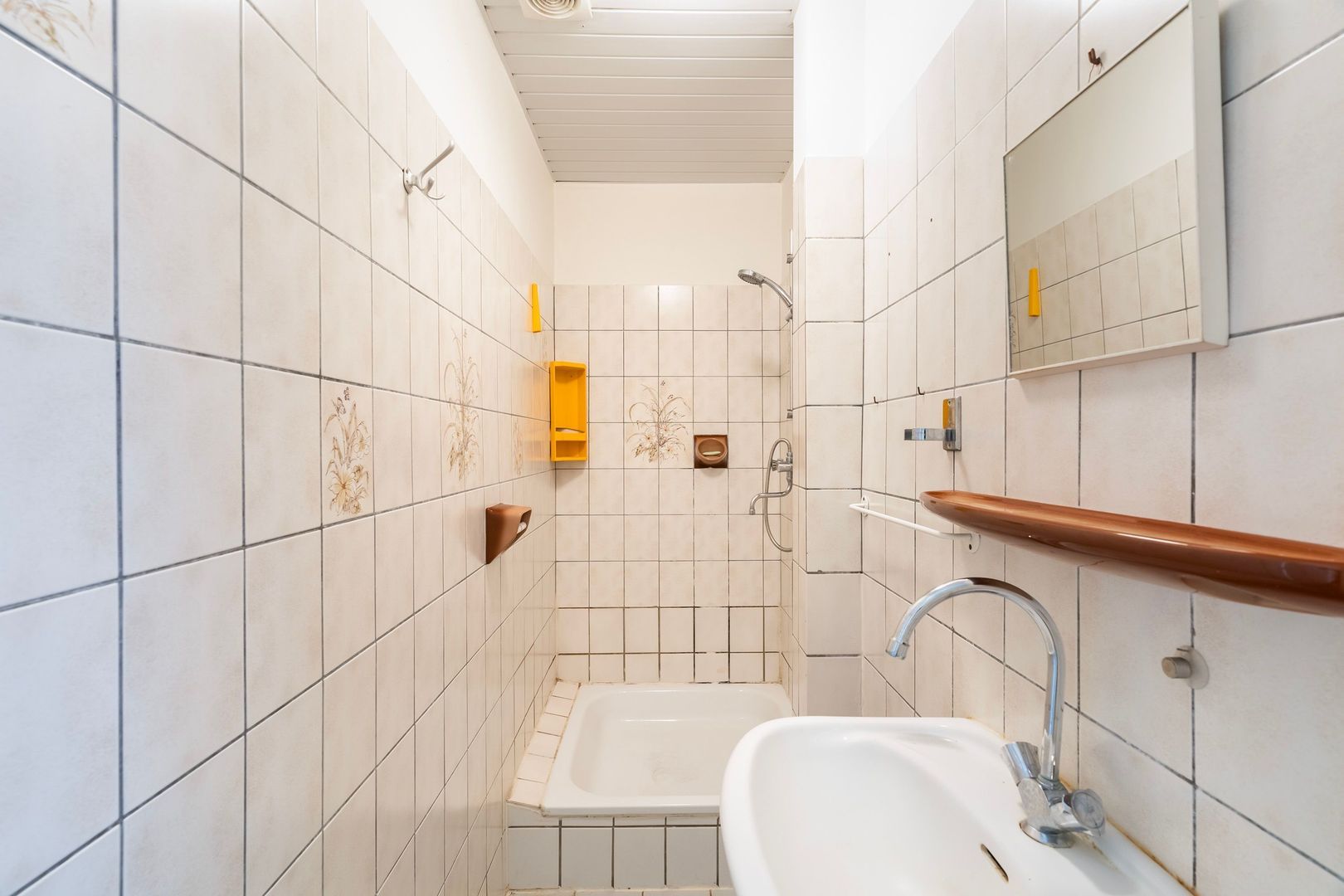 badkamer met douche en wastafel; gesloten keuken met eenvoudig keukenblok en deur naar de achtertuin; achtertuin op het zuiden, van bijna 11,5 meter diep, met schuur.