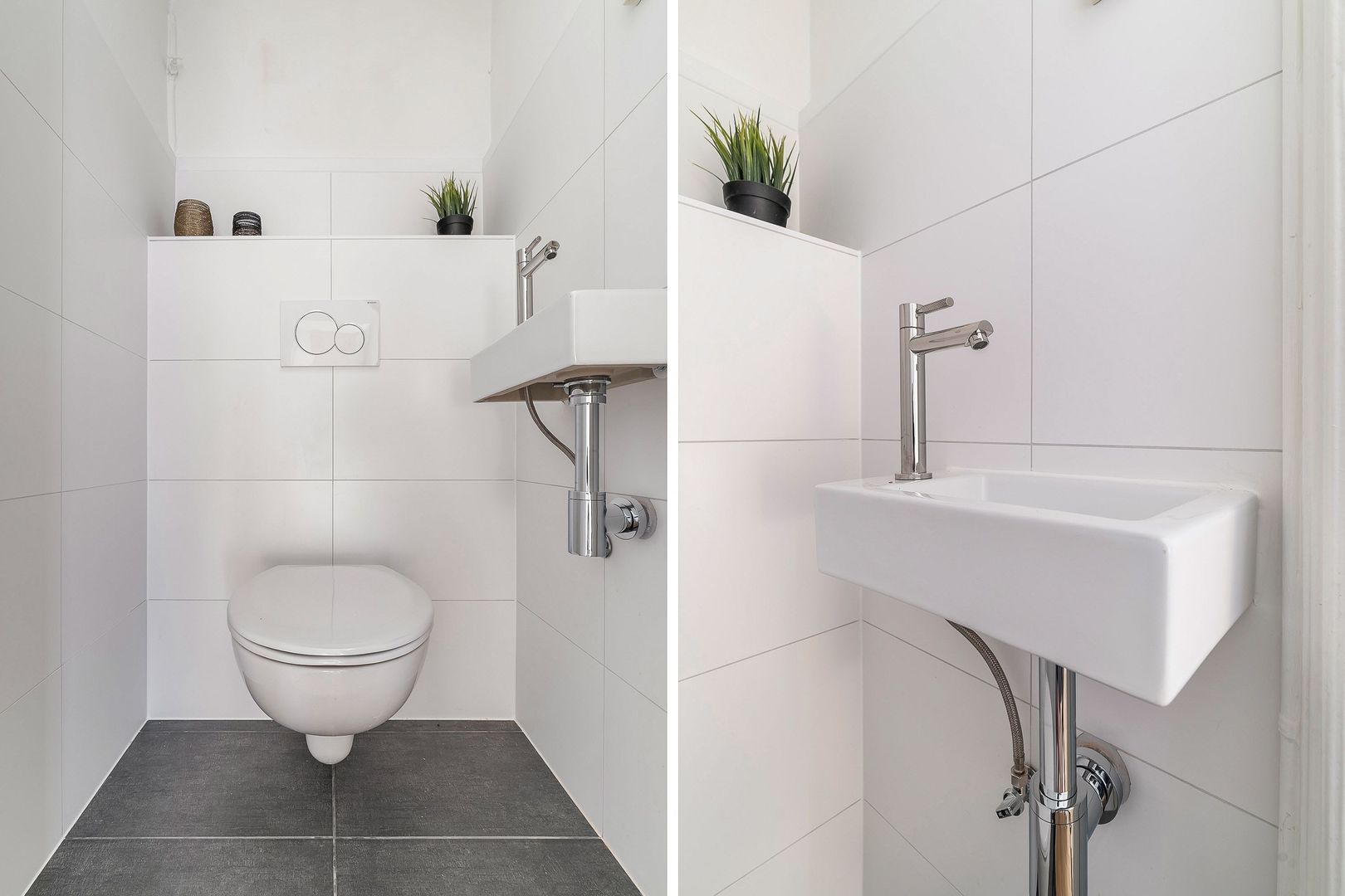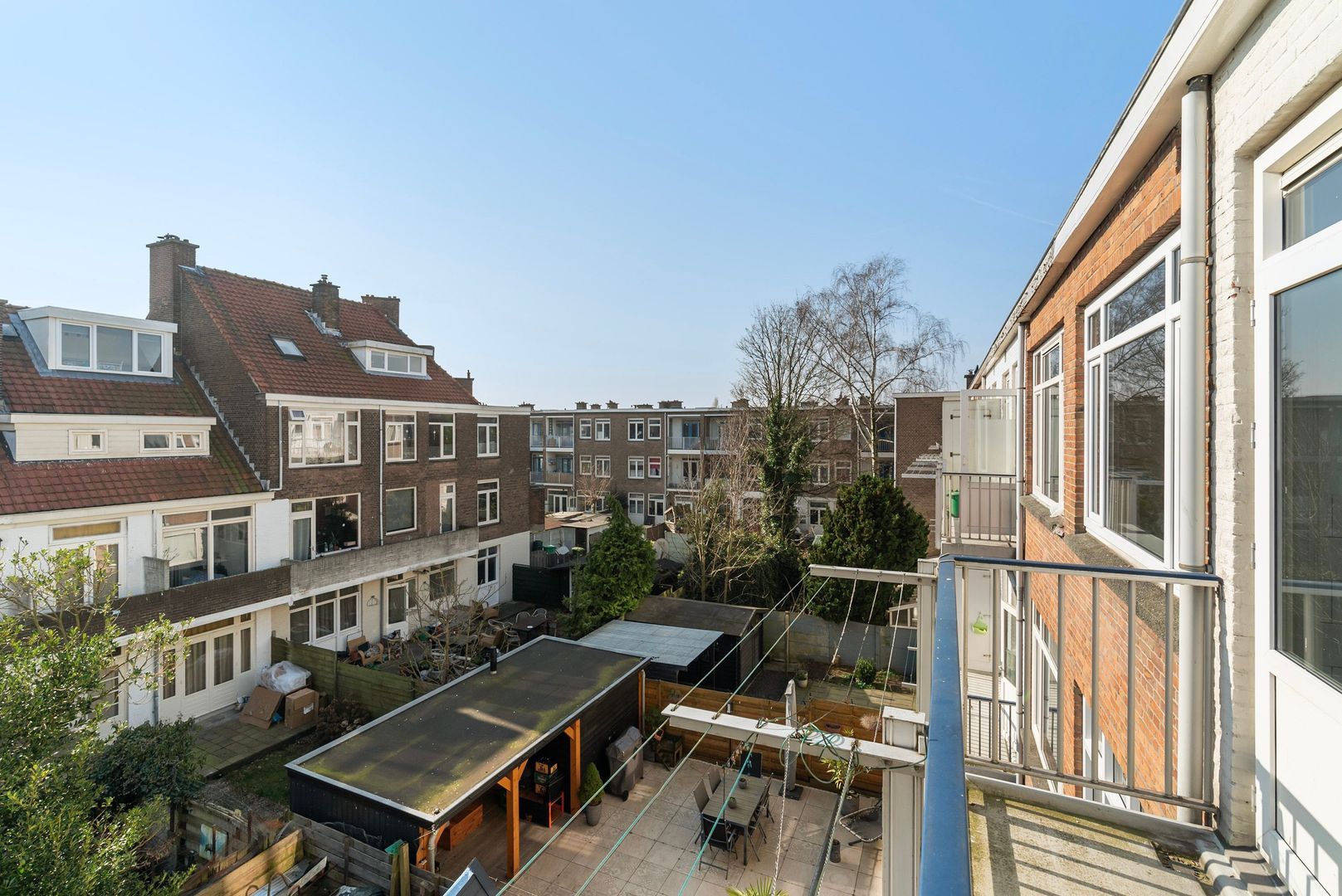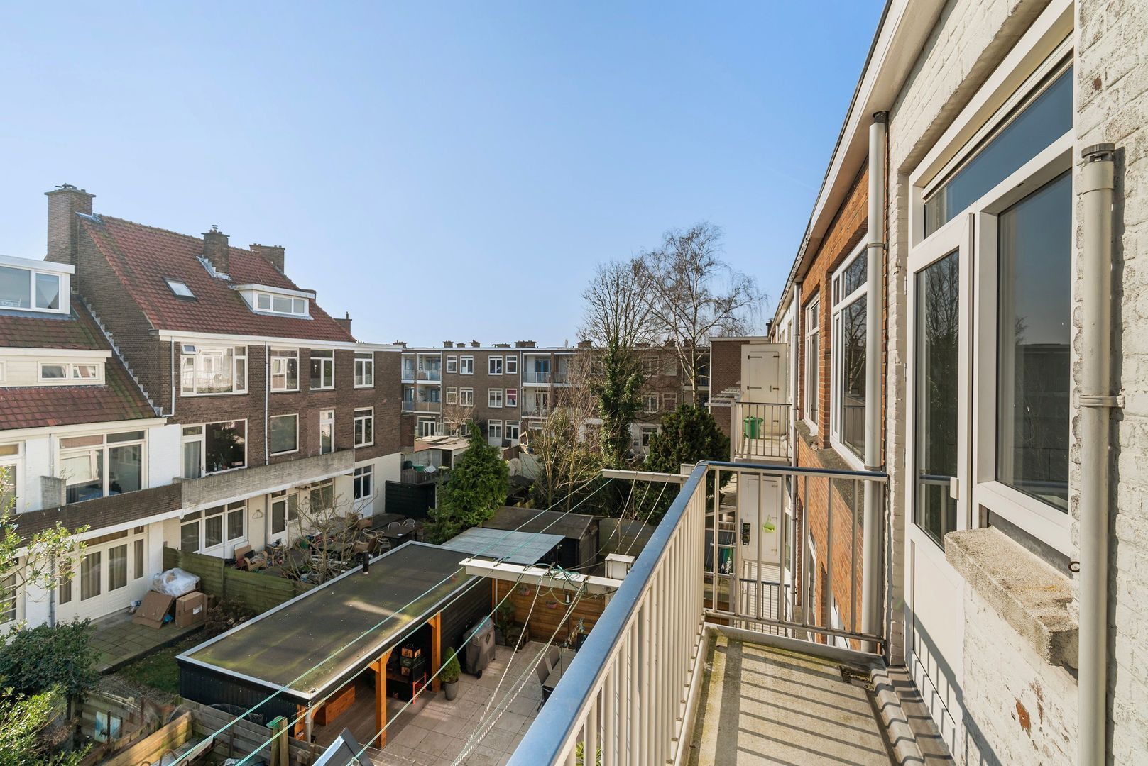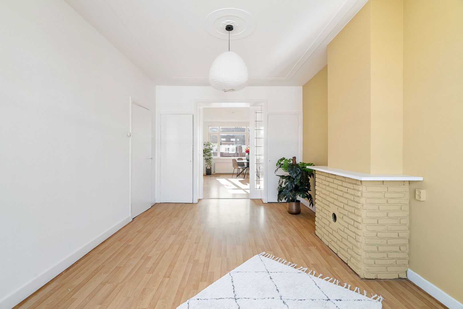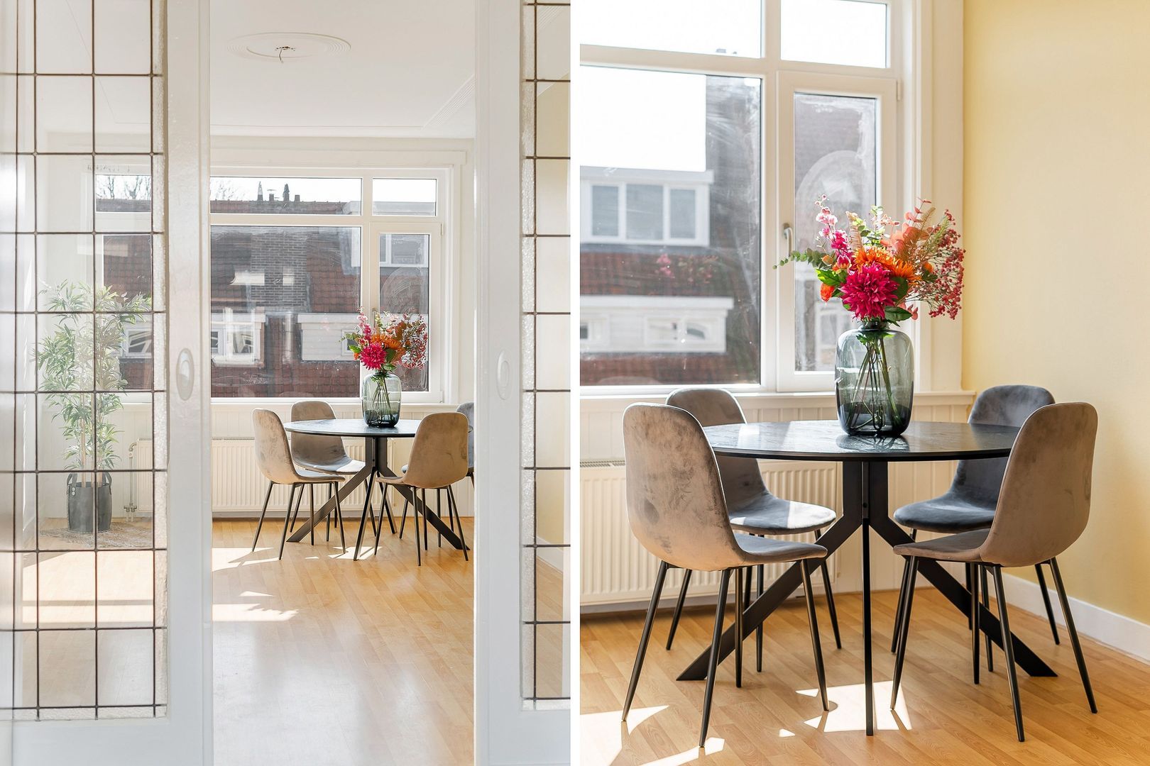 Entree op de 1e etage via open portiek. Hal met bergruimte/garderobe en trap naar de 2e etage; overloop met afgesloten trapgat en dakkoepel; vernieuwd toilet. 2 Kamers ensuite waarvan de brede voor(woon)kamer ca. 5.10x3.52 met erkerkozijn en de achterkamer ca. 5.27x3.13 is. De kamers zijn gescheiden door een schuifseparatie met glas in lood ramen en met kastruimte. Beide kamers hebben nog het licht geornamenteerde plafond en beide een schouw. Royale voorzijkamer ca. 3.22x3.61 met bergkast; achterzijkamer ca 3.48x1.96 met deur naar balkon. Keurige brede keuken ca. 2.58x1.88 met ingebouwde oven, gaskookplaat, vaatwasser en opstelplaats voor koelkast; Bovenkastjes met opstelplaats cv ketel; via keuken eveneens toegang tot het balkon. Keurige royale nieuwe badkamer (ca 2.02x2.57/1.51met inloopdouche, wastafelmeubel en opstelplaats voor wasmachine/droger. Balkon op het zuiden georiënteerd.
