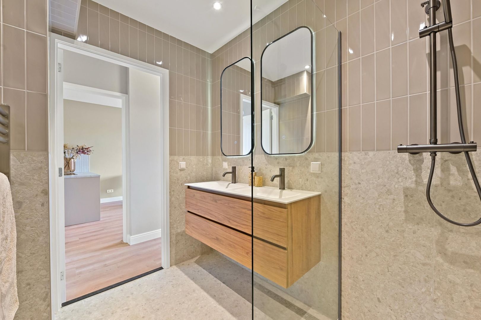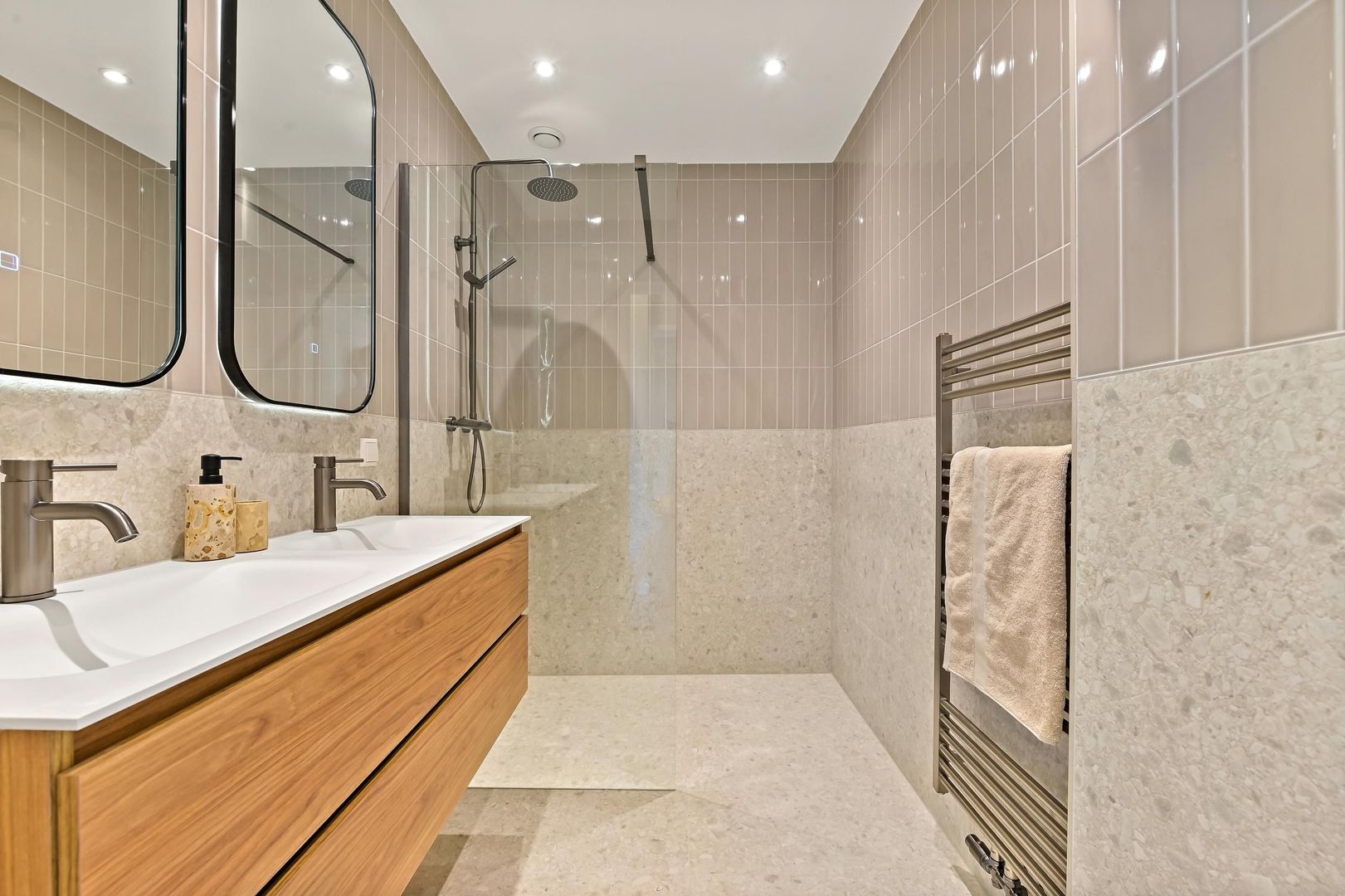 De luxe badkamer ca. 1.65x2.36 beschikt over een inloopdouche, designradiator en een modern wastafelmeubel.