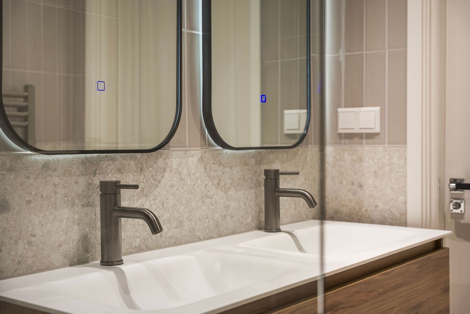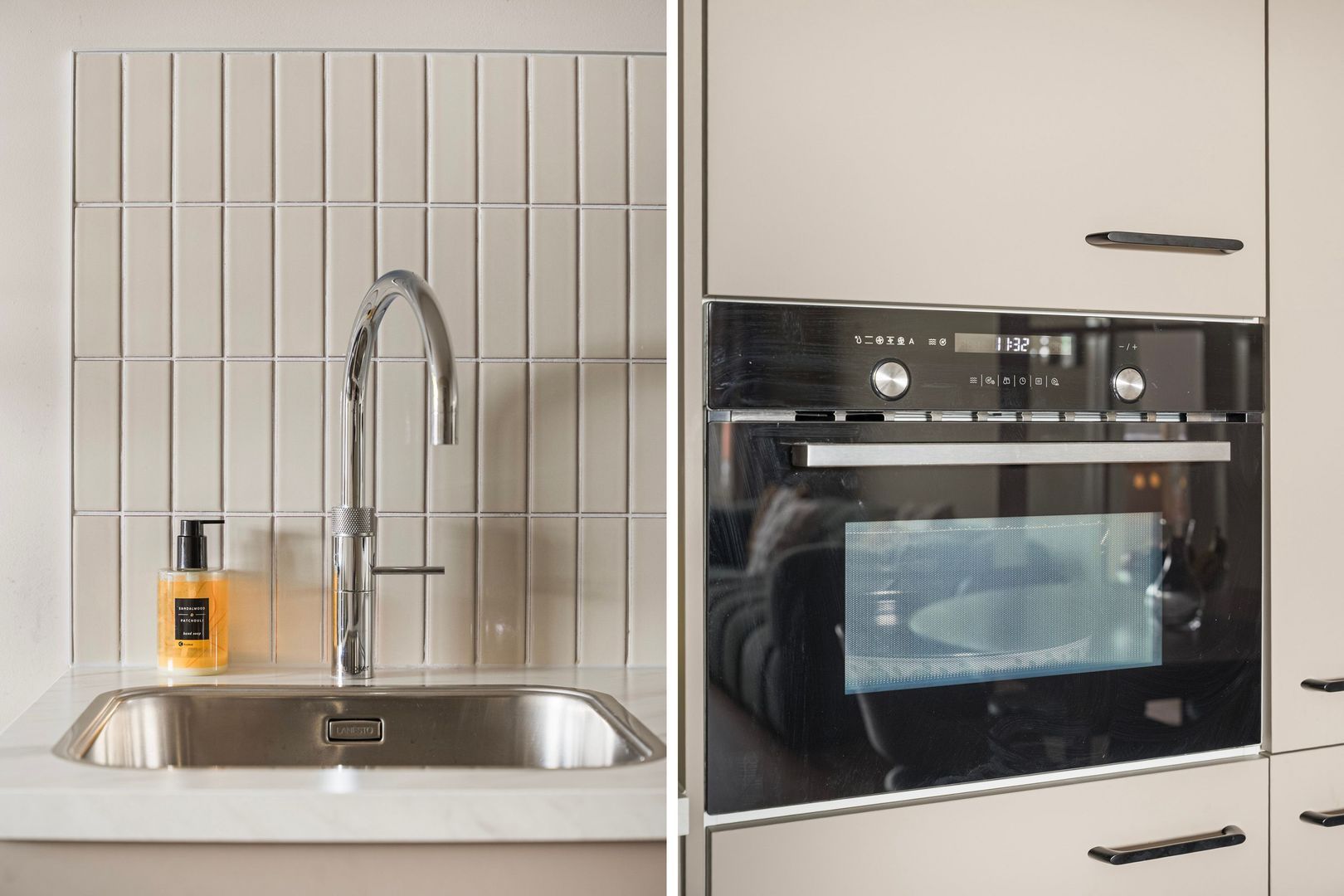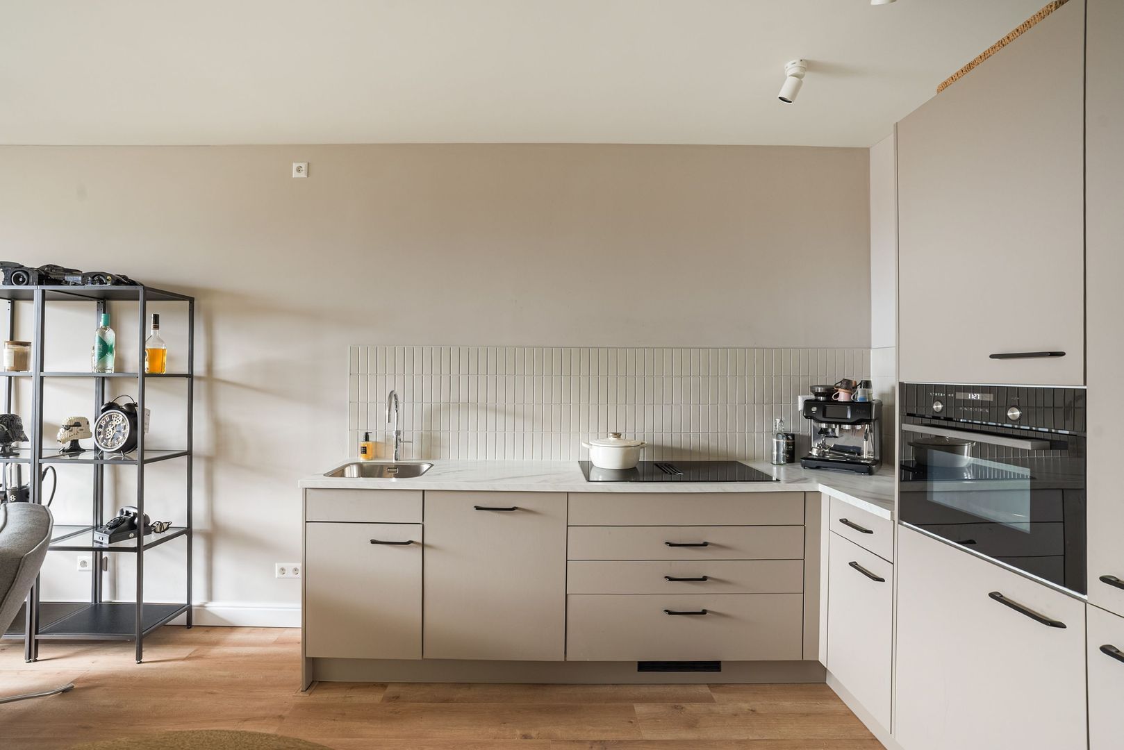 Entree van het appartement via de hal met toegang tot een kast (K), separaat toilet en de overige vertrekken. De ruime woonkamer (21,4 m², H=2,8 m) biedt volop ruimte voor wonen en eten en is voorzien van grote raampartijen die zorgen voor veel natuurlijk licht. Aansluitend bevindt zich de open keuken (5,5 m², H=2,8 m), uitgerust met een inductiekookplaat, afzuigkap, combi-oven, koelkast, vriezer en vaatwasser. De luxe badkamer (3,3 m², H=2,8 m) beschikt over een inloopdouche, designradiator en een modern wastafelmeubel. Separaat toilet met fonteintje.