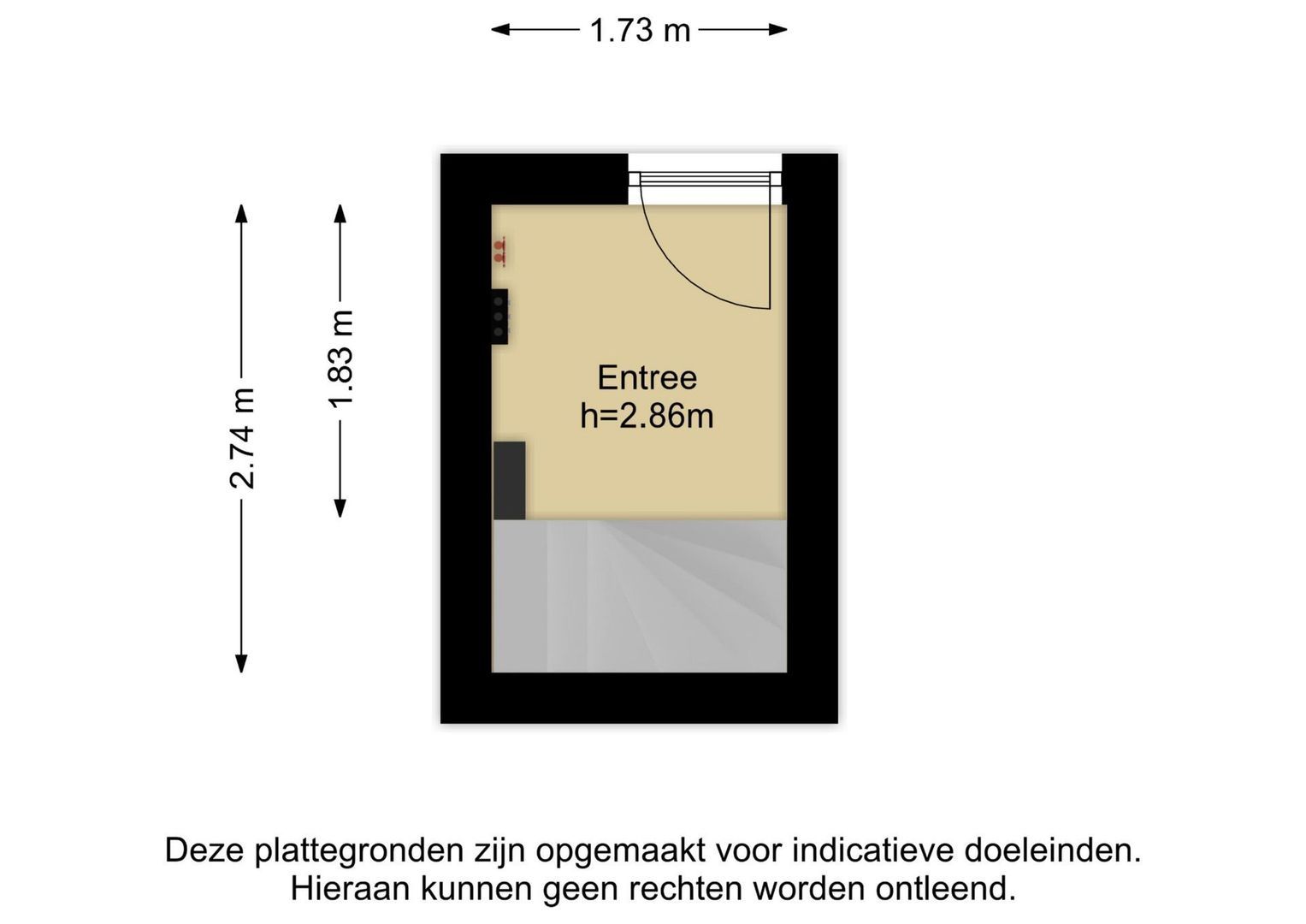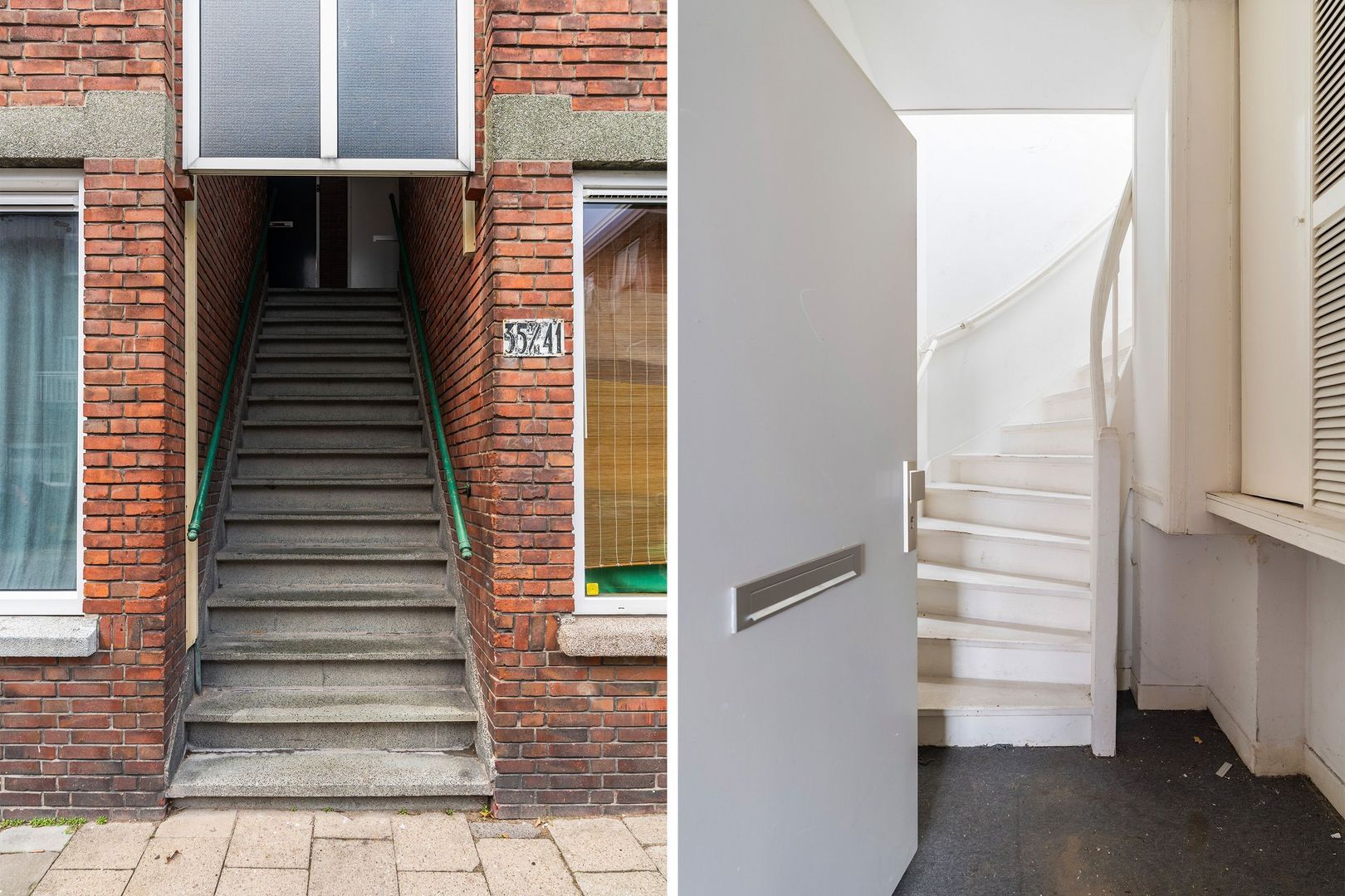 Eigen entree via open portiek naar de hal met binnentrap naar de woning op de eerste verdieping. .