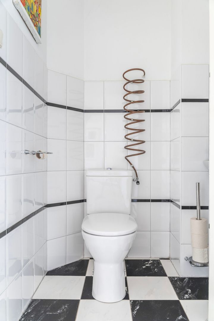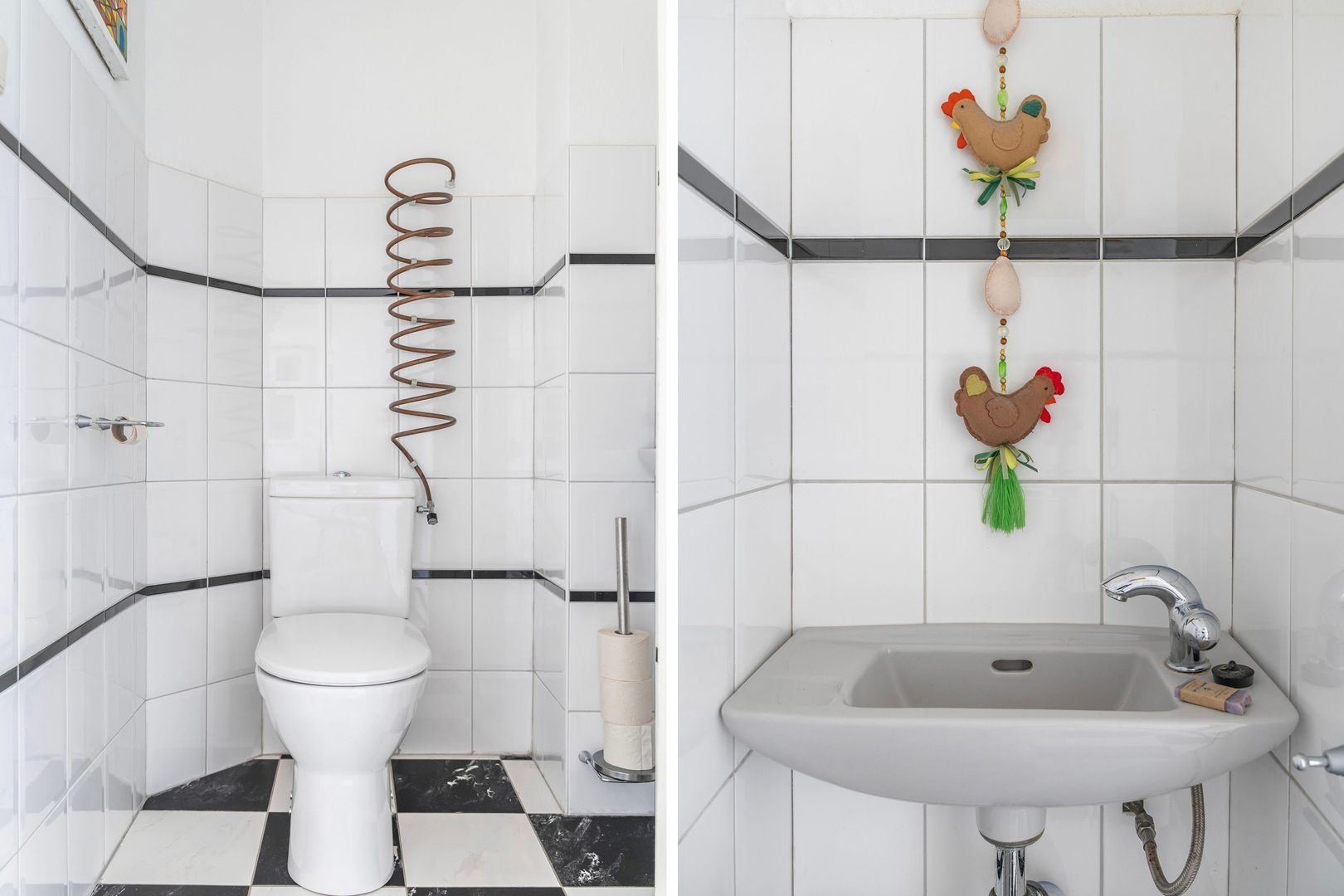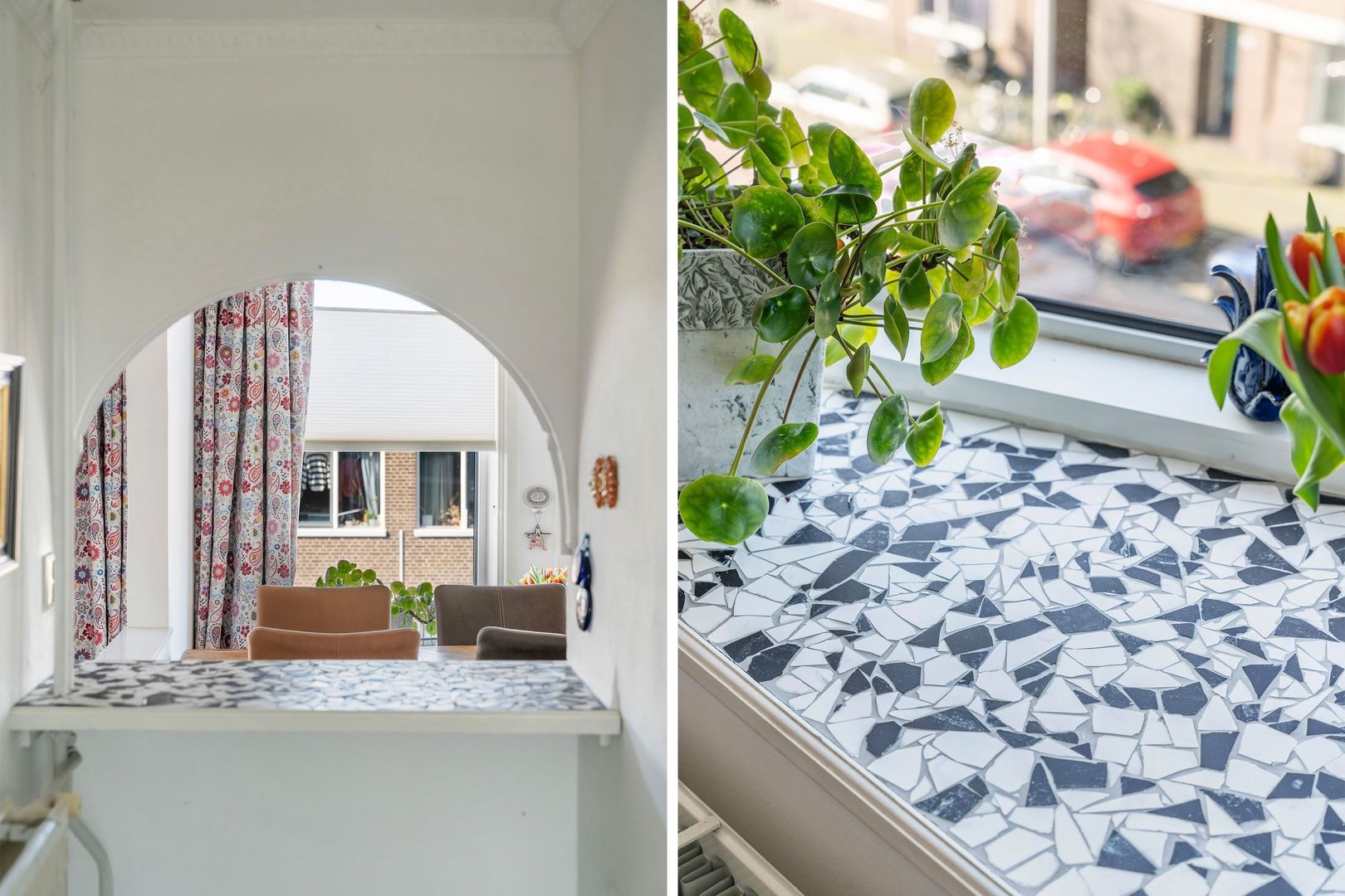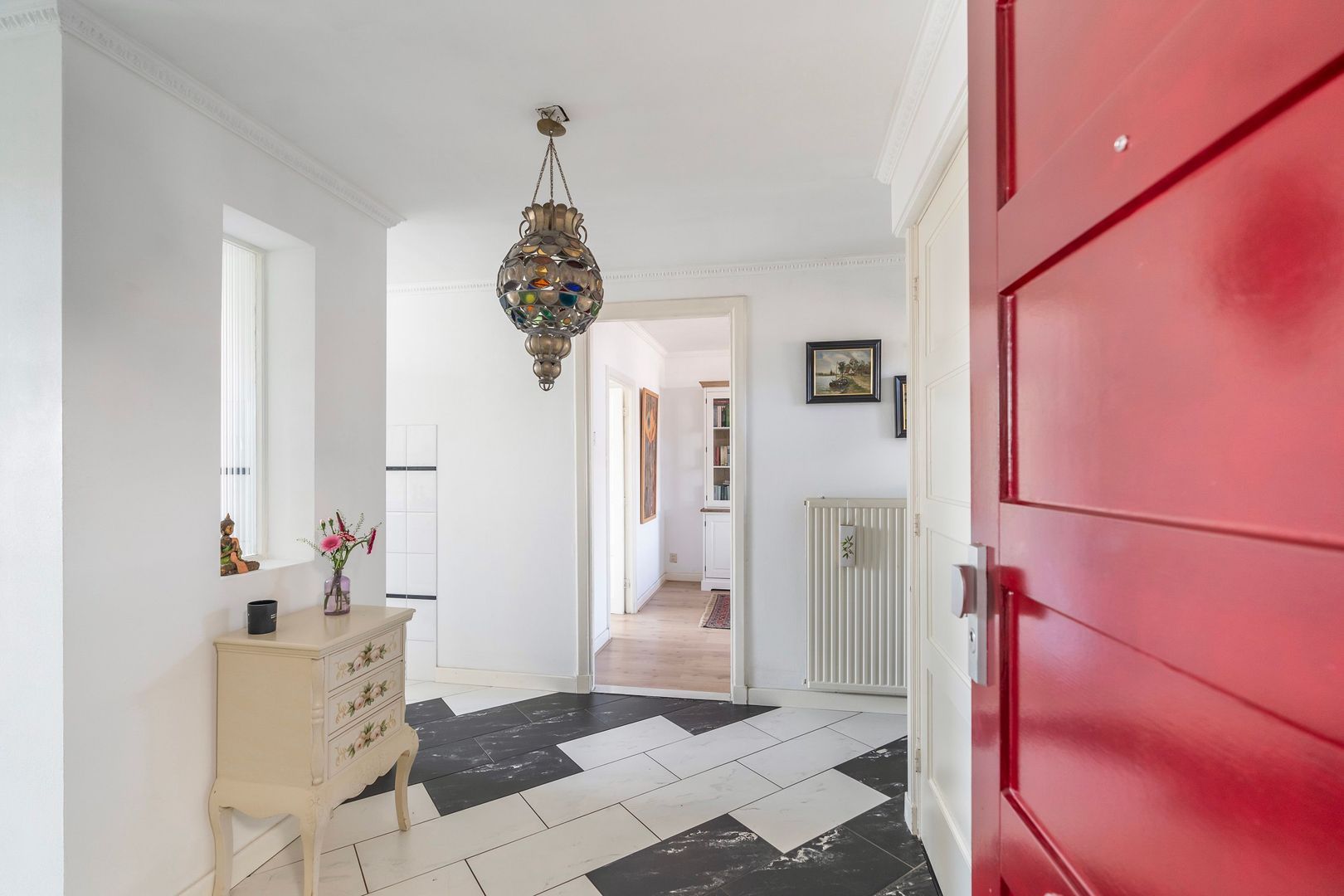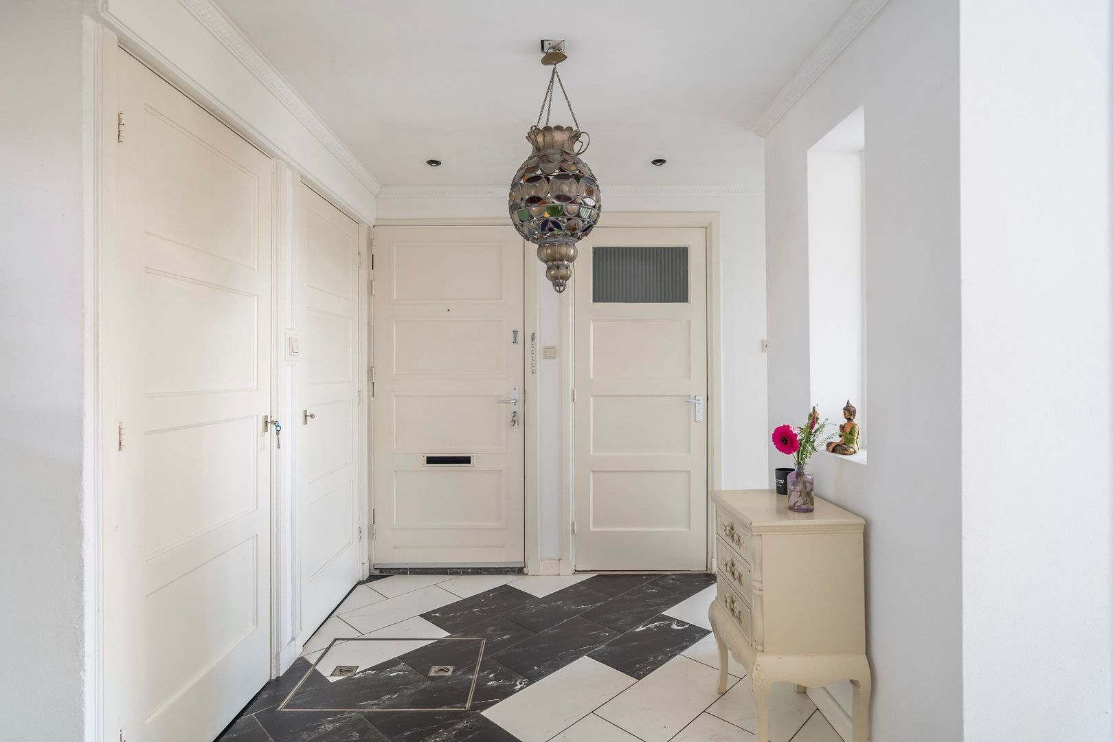Entree in open portiek op de 2e verdieping; entree; hal met zwart-wit plavuizenvloer; garderobekast; meterkast met 6 groepen en een aardlekschakelaar.