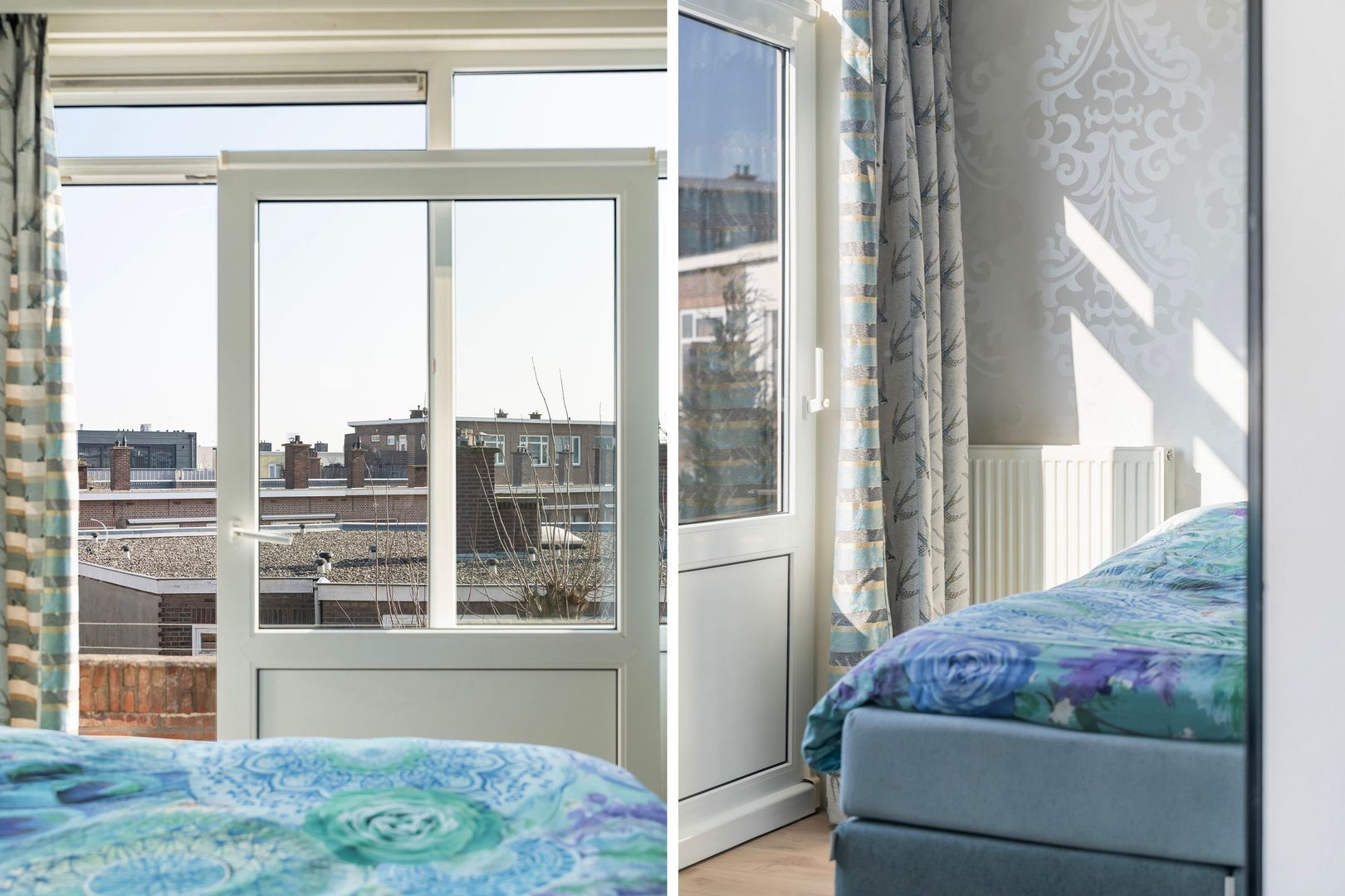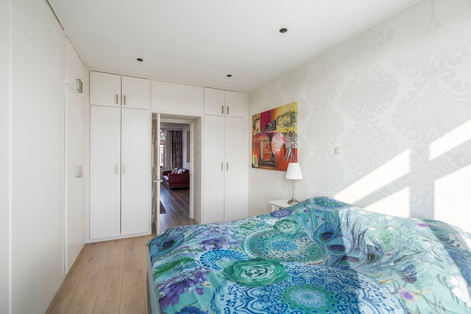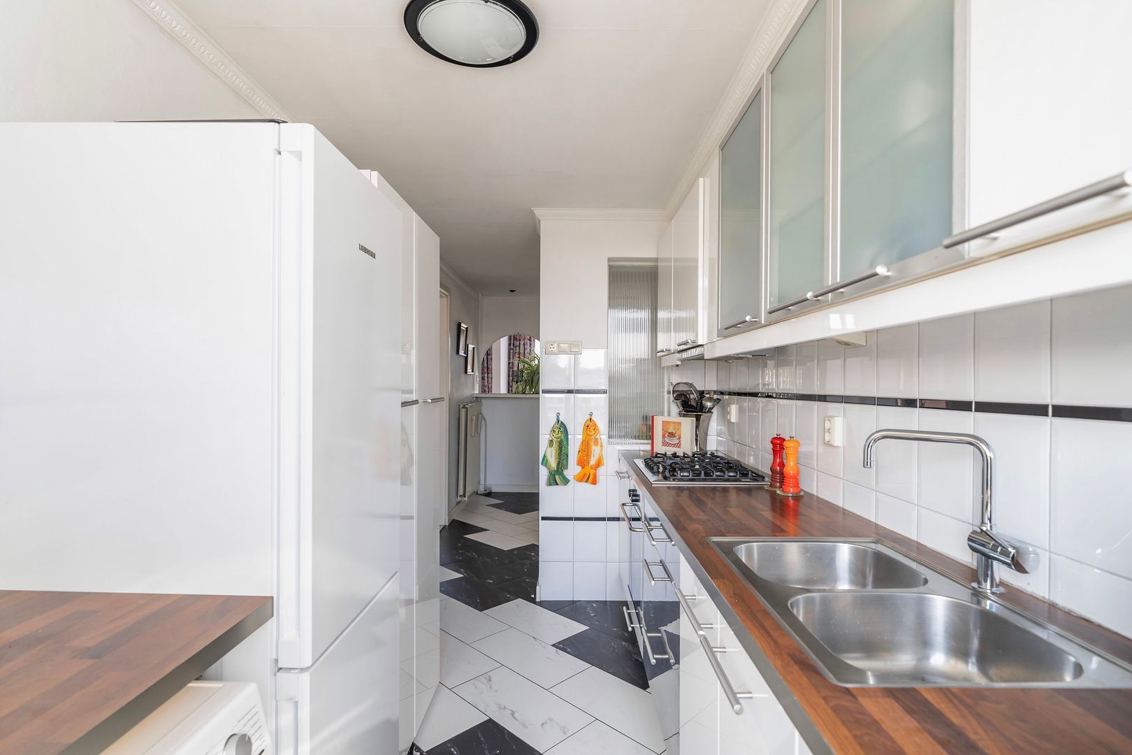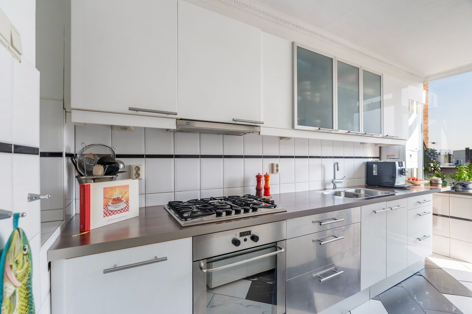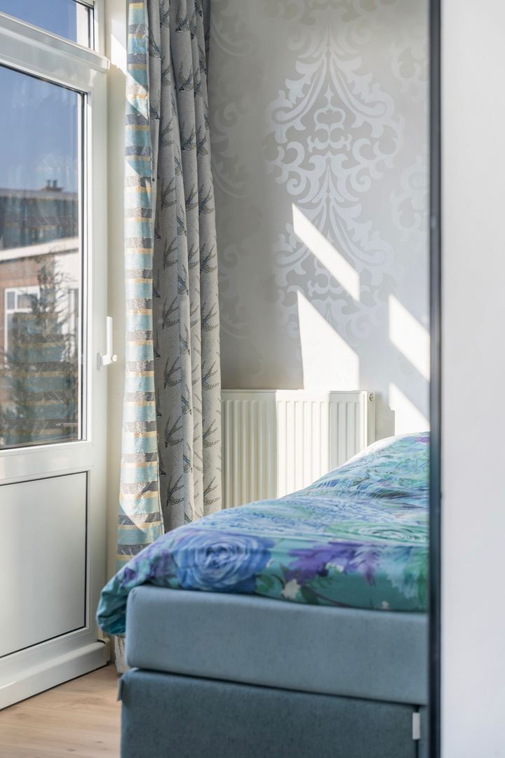 De zeer lichte woon-/eetkamer is gelegen over de volle breedte van de woning aan de voorzijde en heeft hierdoor veel zon- en lichtinval; doorloop naar de eetkamer met toegang tot het zonnige voorbalkon op het zuidwesten georiënteerd. Royale keuken aan de achterzijde in een L-opstelling met dubbele spoelbak, witte en RVS kastfronten, 5-pits gaskookplaat, vlakscherm afzuigkap; vanuit de keuken is er ook toegang tot het achterbalkon met ochtendzon. Aan de achterzijde is de hoofdslaapkamer gelegen met een vaste kasten. Via een kunststof schuifpui toegang tot het royale achterbalkon met ochtendzon; 2e slaapkamer aan de achterzijde; het toilet is ruim van afmeting met duoblok en fonteintje; moderne badkamer voorzien van douche en wastafel, alles in zwart-witte kleurstelling.