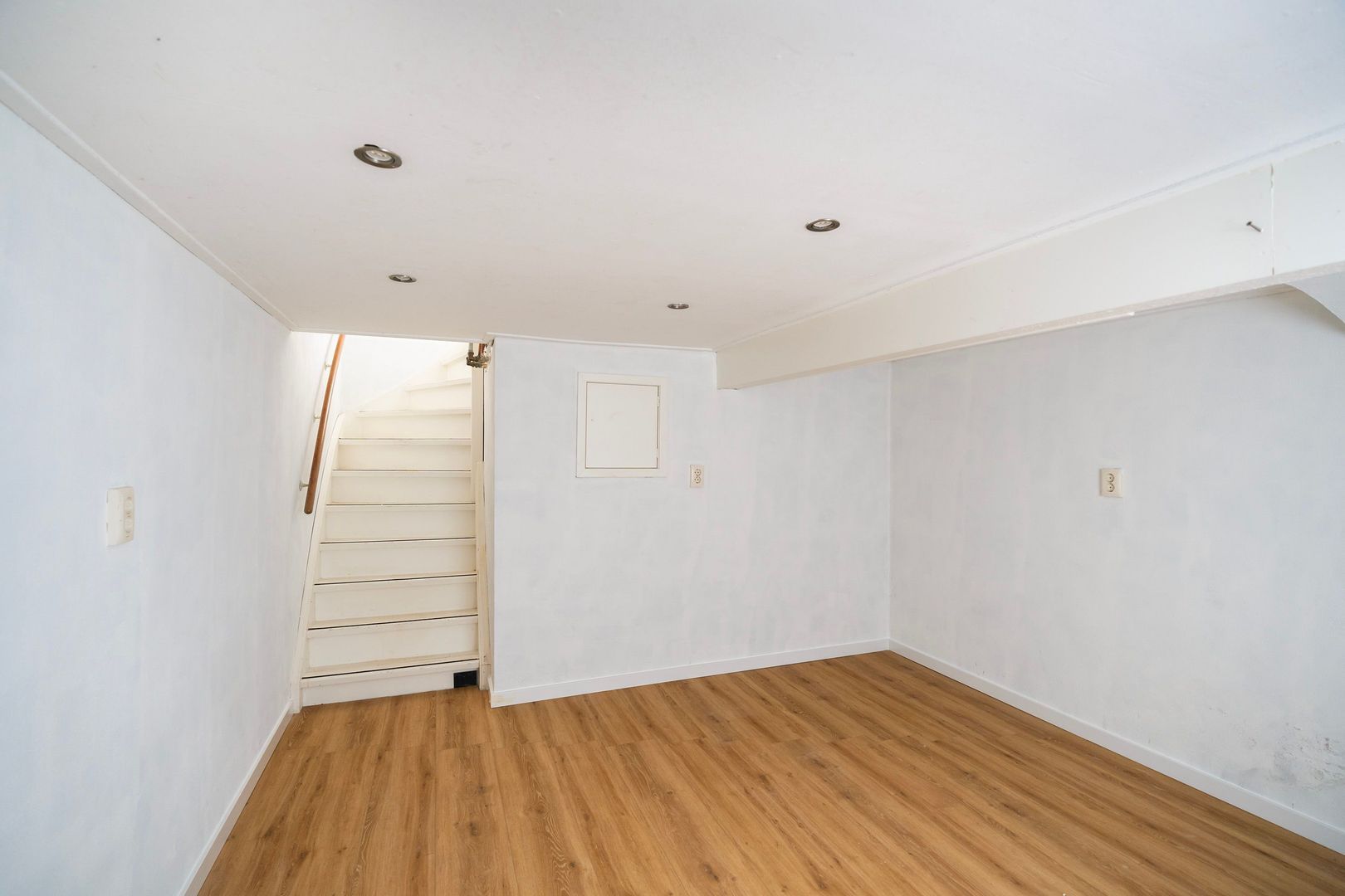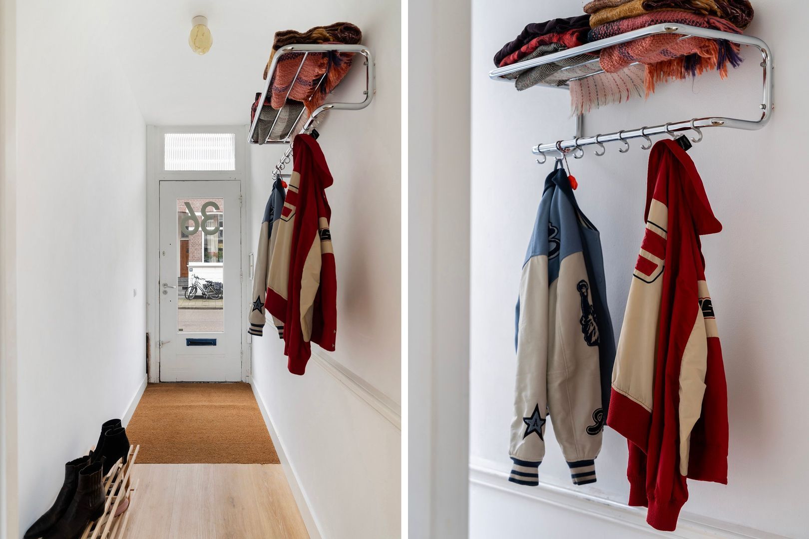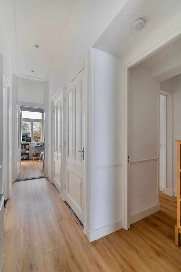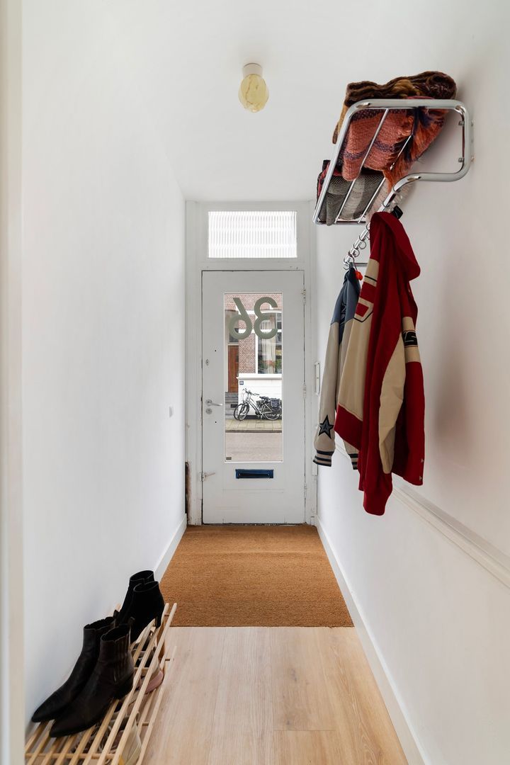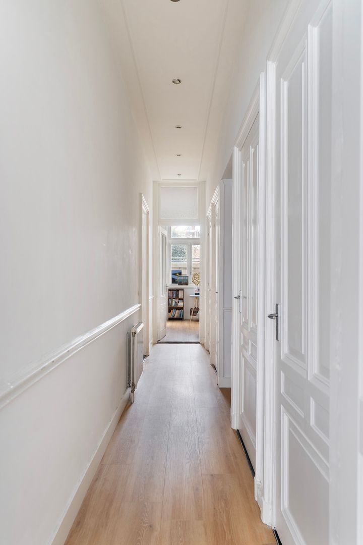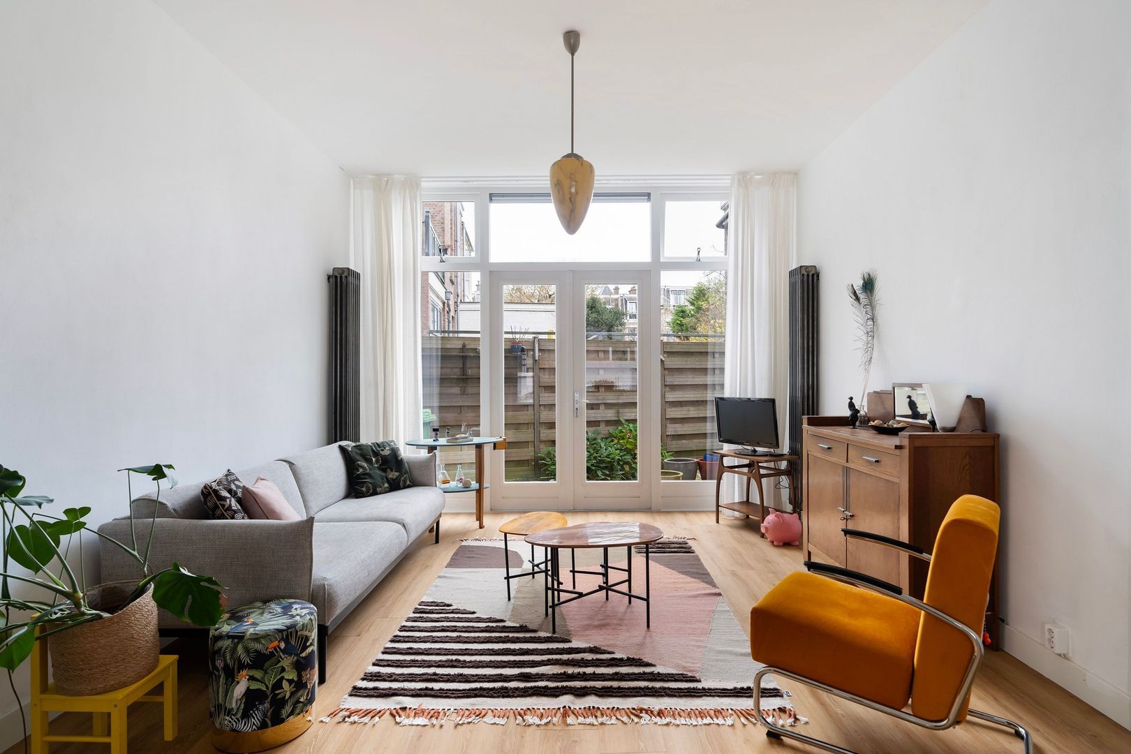 Entree aan de straatzijde. Halletje. De riante woonkamer is ca 12 meter diep en heeft een breedte van meer dan 4 meter en heeft openslaande deuren naar de achtertuin. Aan de voorzijde is de open keuken (2024) geïnstalleerd met een groot kook-werkeiland met apparatuur. Het grote raamkozijn aan de voorzijde geeft veel licht naar binnen. Vanuit de woonkamer toegang tot de gang met bergruimten, toilet, en trap naar het souterrain. Via de gang toegang tot 2 slaapkamers aan de achterzijde ca. 3.78x2.24 en ca. 3.78x2.11. Moderne badkamer (2024) met retro tegelwerk, inloopdouche en wastafel. Souterrain ca. 3.41x3.75 met koekoek voor lichtinval en nieuw kozijn met dubbel glas. Smalle beschutte achtertuin/plaats op het Noord-Westen over de volle breedte ca. 9x1.20/3.