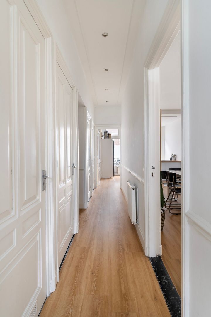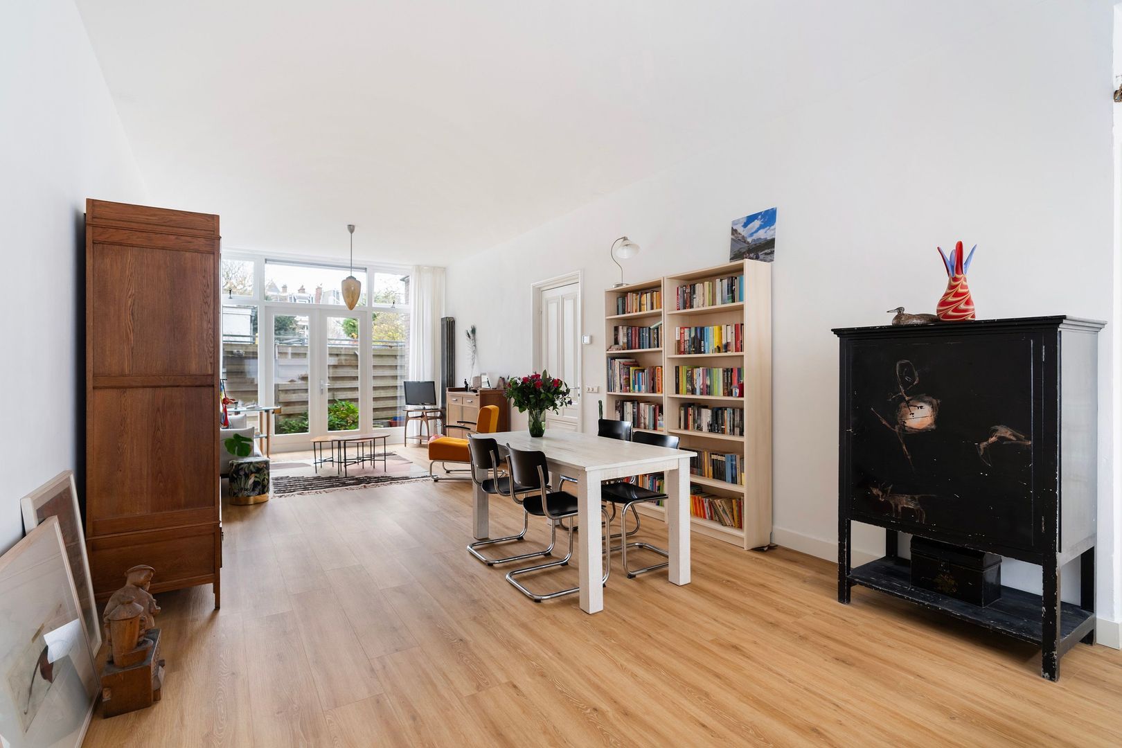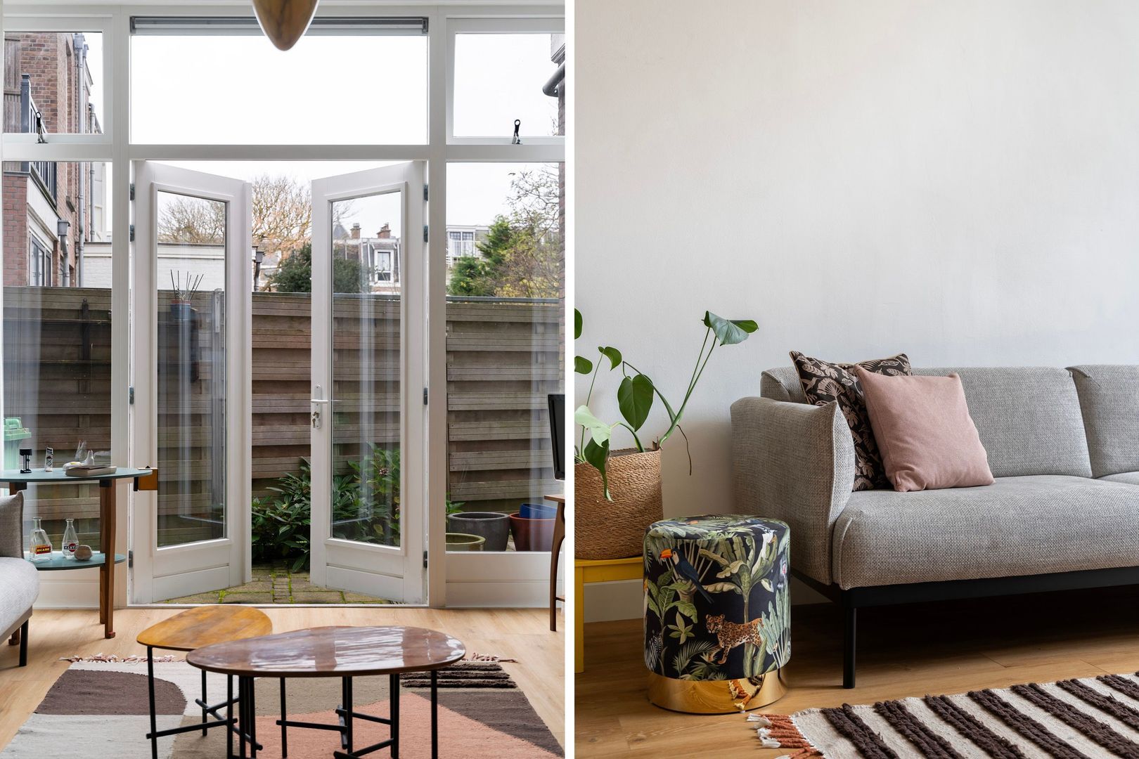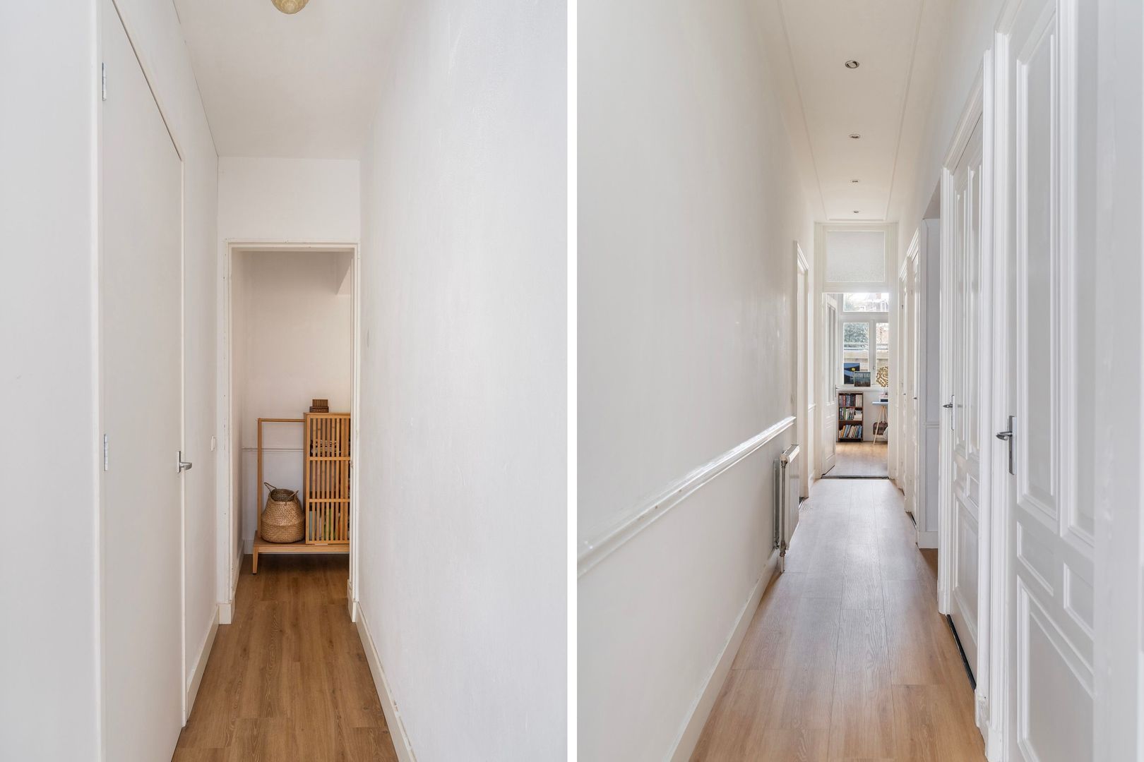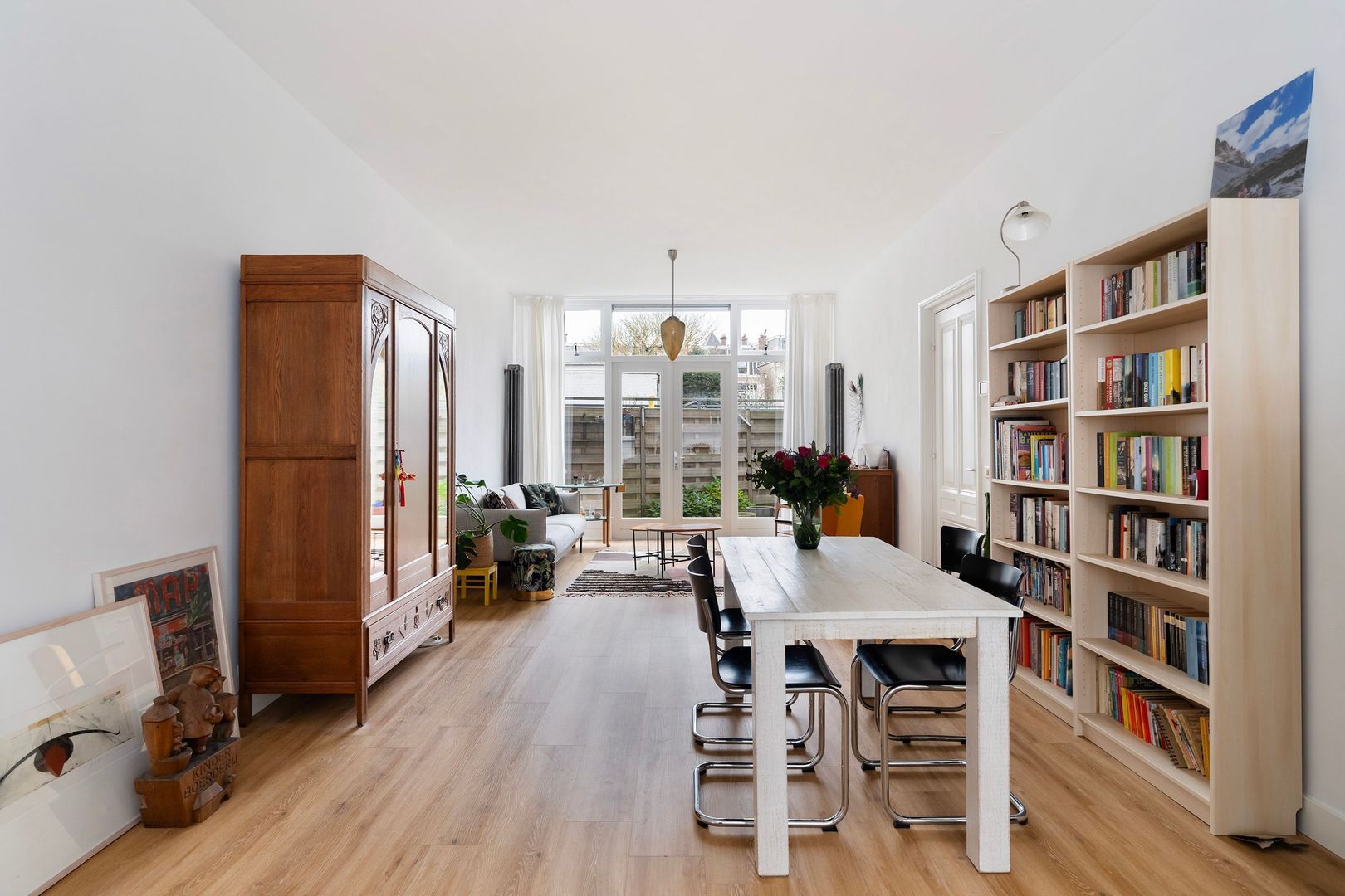 Entree aan de straatzijde. Halletje. De riante woonkamer is ca 12 meter diep en heeft een breedte van meer dan 4 meter en heeft openslaande deuren naar de achtertuin. Aan de voorzijde is de open keuken (2024) geïnstalleerd met een groot kook-werkeiland met apparatuur. Het grote raamkozijn aan de voorzijde geeft veel licht naar binnen. Vanuit de woonkamer toegang tot de gang met bergruimten, toilet, en trap naar het souterrain. Via de gang toegang tot 2 slaapkamers aan de achterzijde ca. 3.78x2.24 en ca. 3.78x2.11. Moderne badkamer (2024) met retro tegelwerk, inloopdouche en wastafel. Souterrain ca. 3.41x3.75 met koekoek voor lichtinval en nieuw kozijn met dubbel glas. Smalle beschutte achtertuin/plaats op het Noord-Westen over de volle breedte ca. 9x1.20/3.