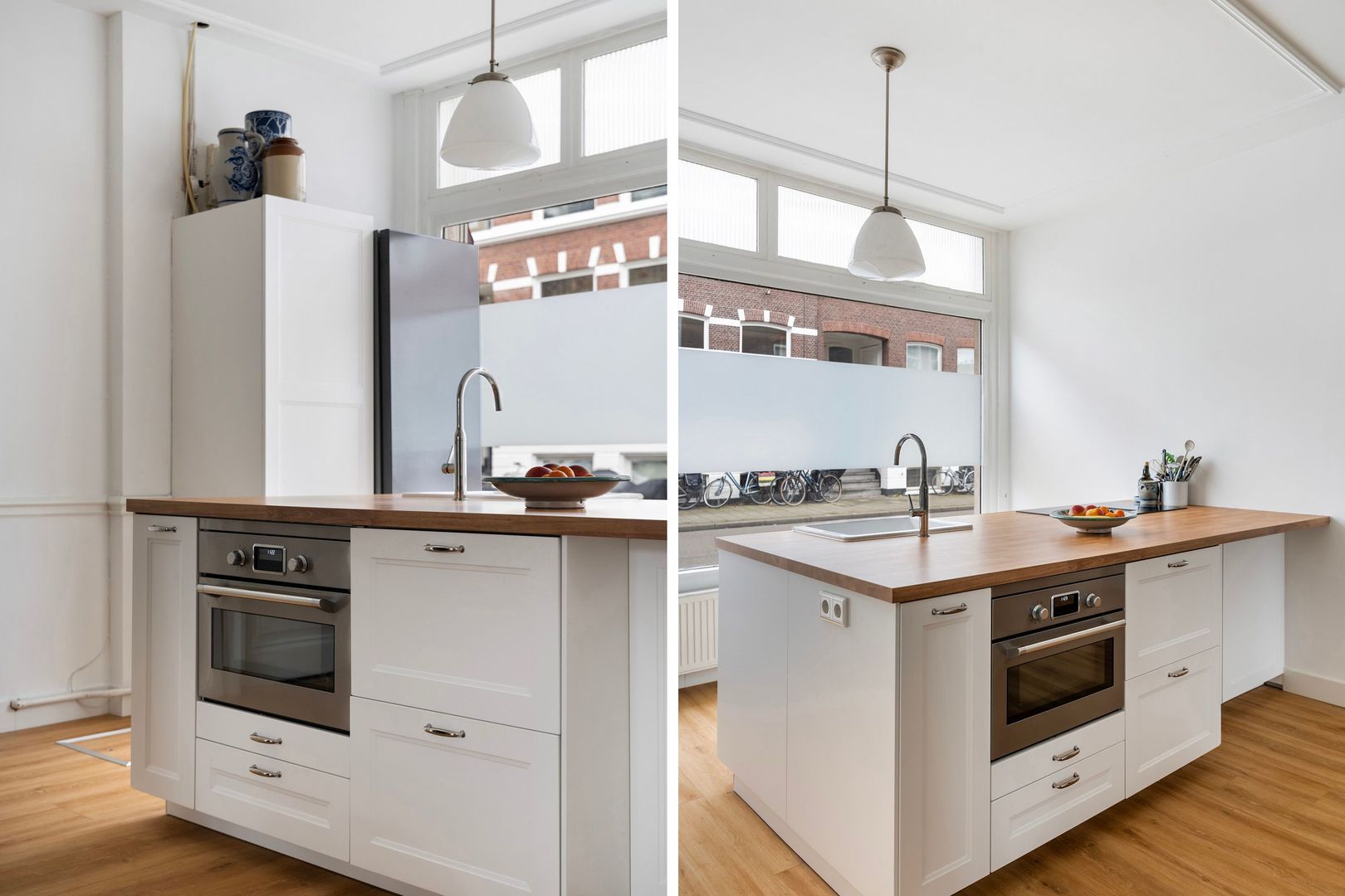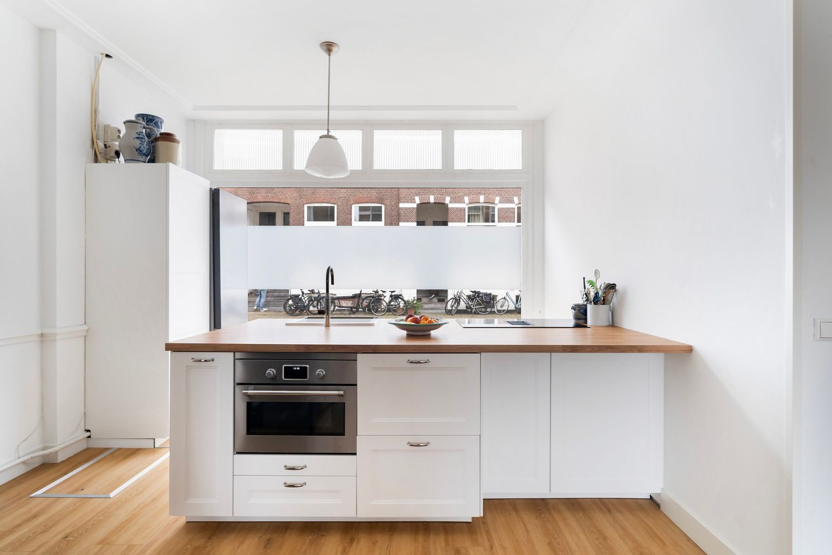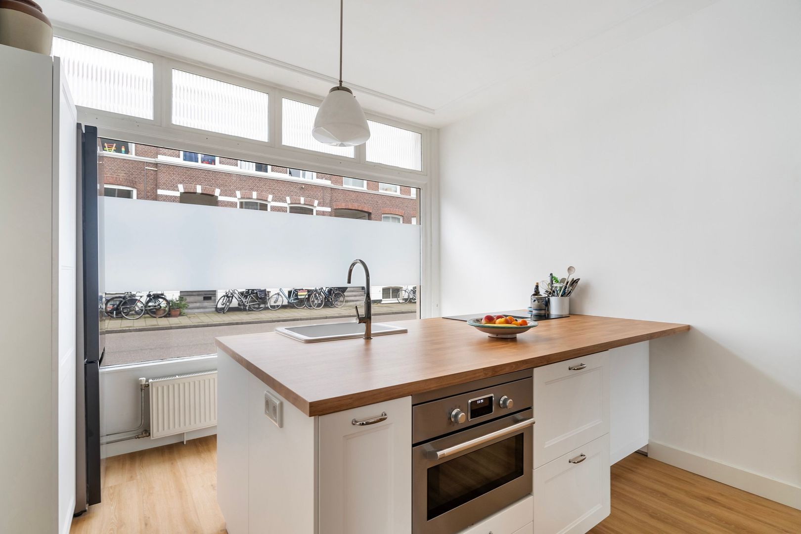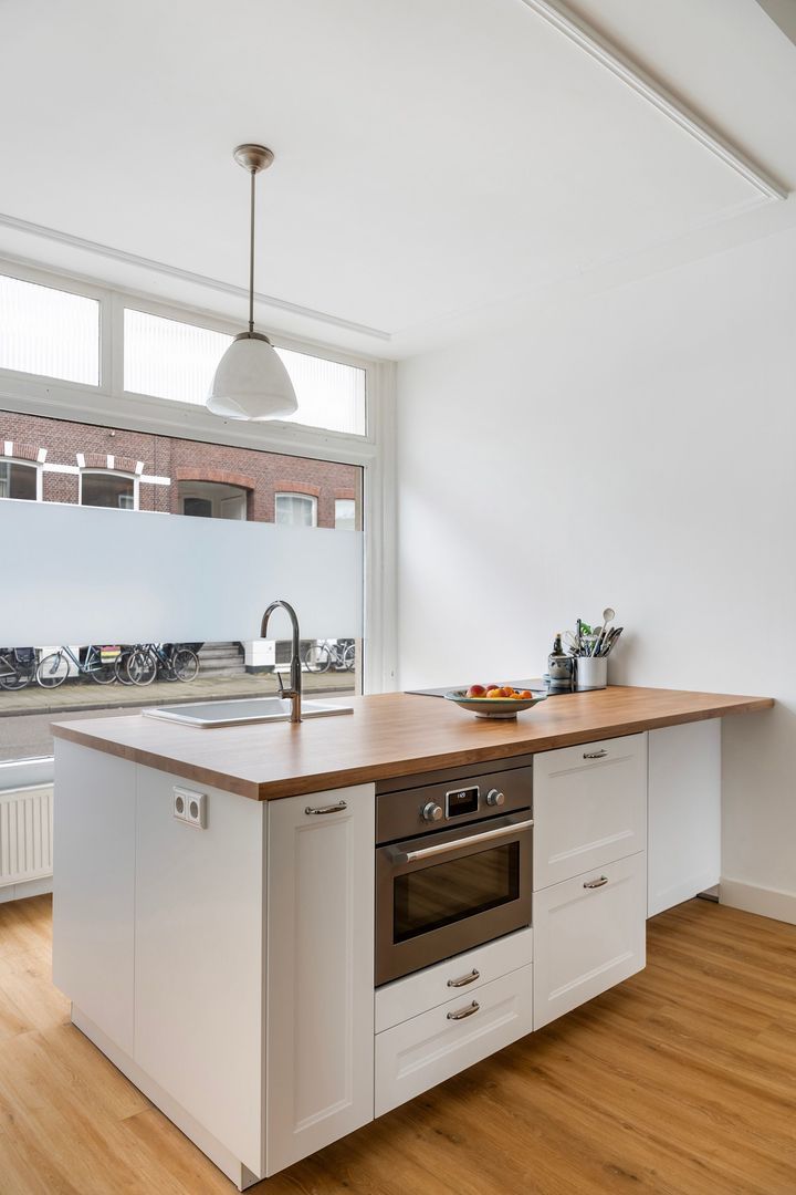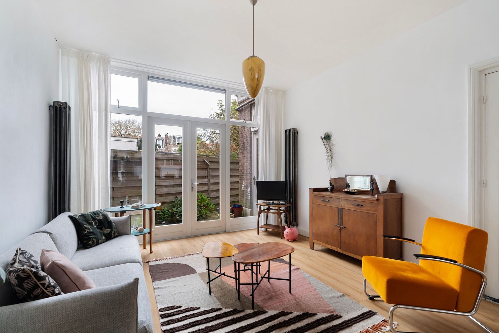 Entree aan de straatzijde. Halletje. De riante woonkamer is ca 12 meter diep en heeft een breedte van meer dan 4 meter en heeft openslaande deuren naar de achtertuin. Aan de voorzijde is de open keuken (2024) geïnstalleerd met een groot kook-werkeiland met apparatuur. Het grote raamkozijn aan de voorzijde geeft veel licht naar binnen. Vanuit de woonkamer toegang tot de gang met bergruimten, toilet, en trap naar het souterrain. Via de gang toegang tot 2 slaapkamers aan de achterzijde ca. 3.78x2.24 en ca. 3.78x2.11. Moderne badkamer (2024) met retro tegelwerk, inloopdouche en wastafel. Souterrain ca. 3.41x3.75 met koekoek voor lichtinval en nieuw kozijn met dubbel glas. Smalle beschutte achtertuin/plaats op het Noord-Westen over de volle breedte ca. 9x1.20/3.