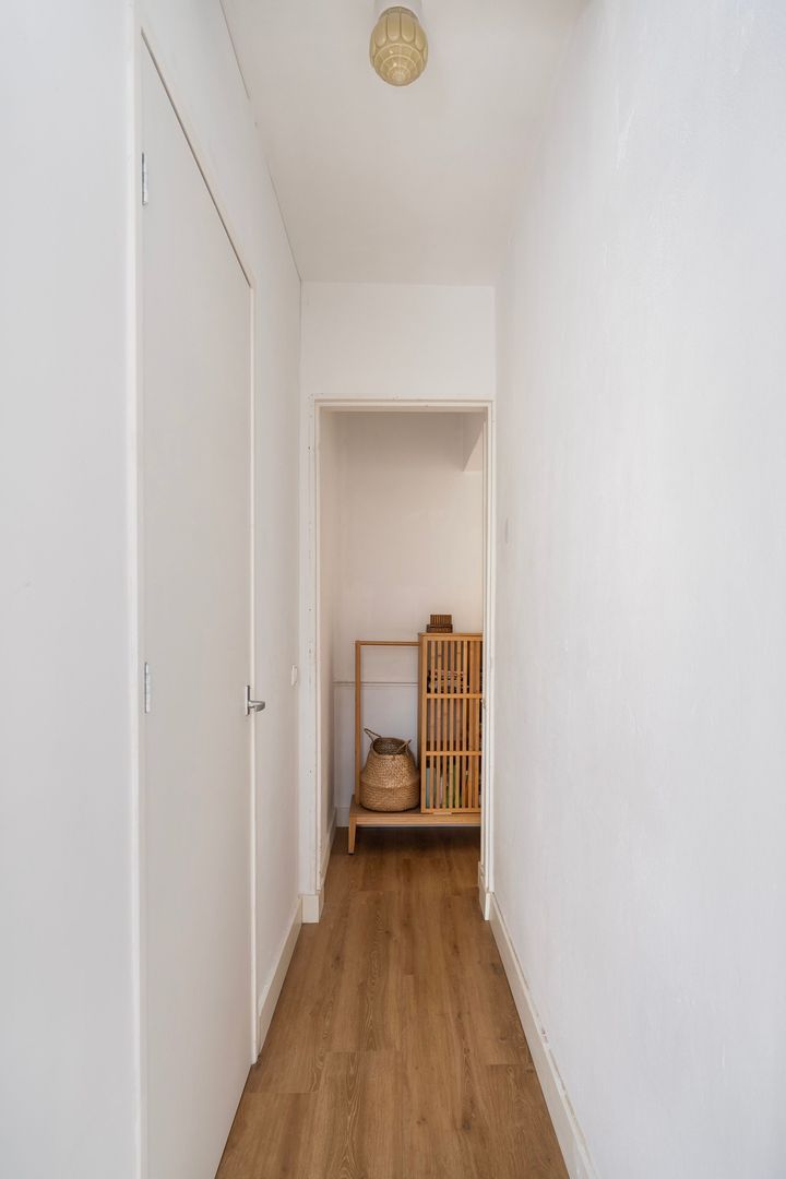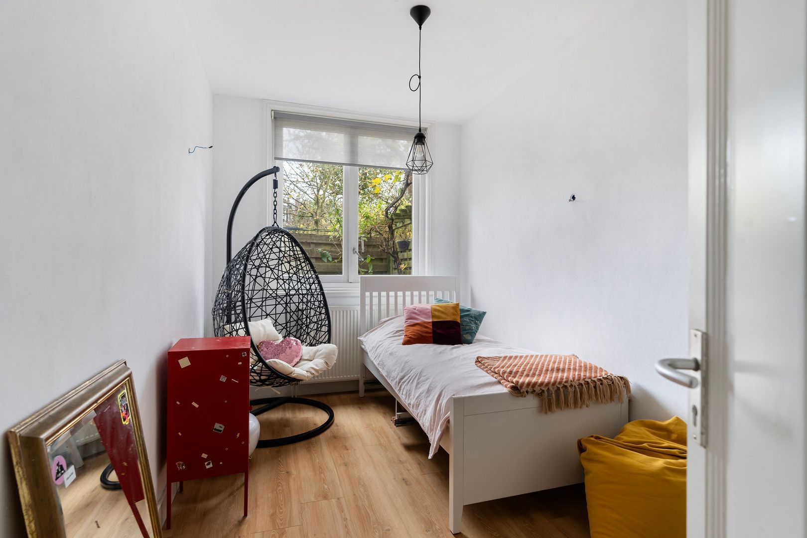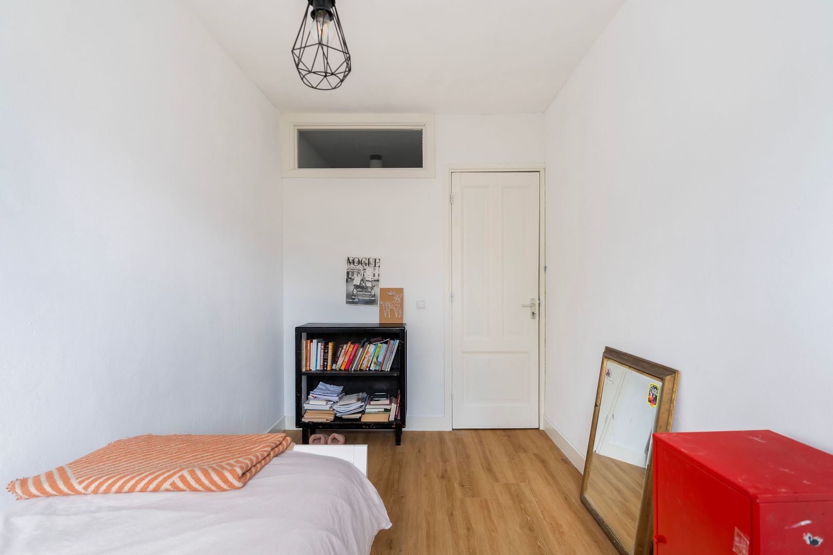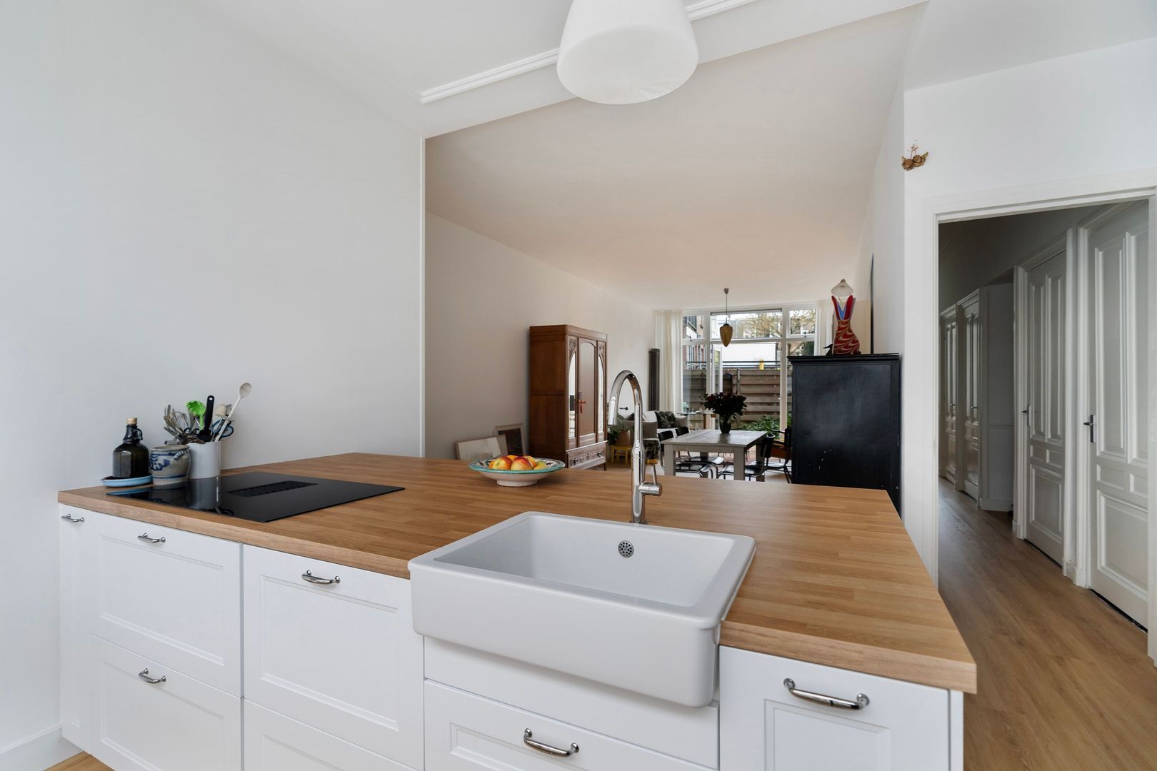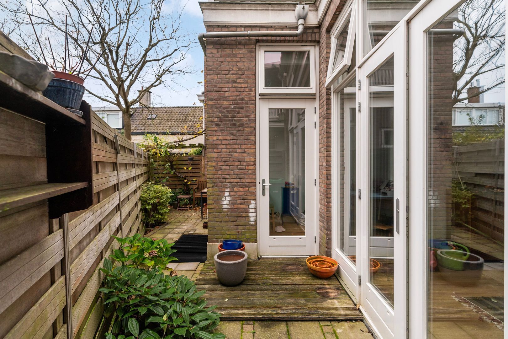 Entree aan de straatzijde. Halletje. De riante woonkamer is ca 12 meter diep en heeft een breedte van meer dan 4 meter en heeft openslaande deuren naar de achtertuin. Aan de voorzijde is de open keuken (2024) geïnstalleerd met een groot kook-werkeiland met apparatuur. Het grote raamkozijn aan de voorzijde geeft veel licht naar binnen. Vanuit de woonkamer toegang tot de gang met bergruimten, toilet, en trap naar het souterrain. Via de gang toegang tot 2 slaapkamers aan de achterzijde ca. 3.78x2.24 en ca. 3.78x2.11. Moderne badkamer (2024) met retro tegelwerk, inloopdouche en wastafel. Souterrain ca. 3.41x3.75 met koekoek voor lichtinval en nieuw kozijn met dubbel glas. Smalle beschutte achtertuin/plaats op het Noord-Westen over de volle breedte ca. 9x1.20/3.