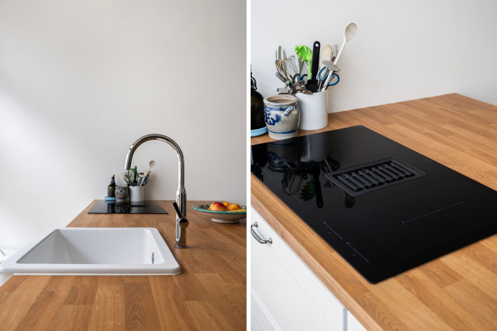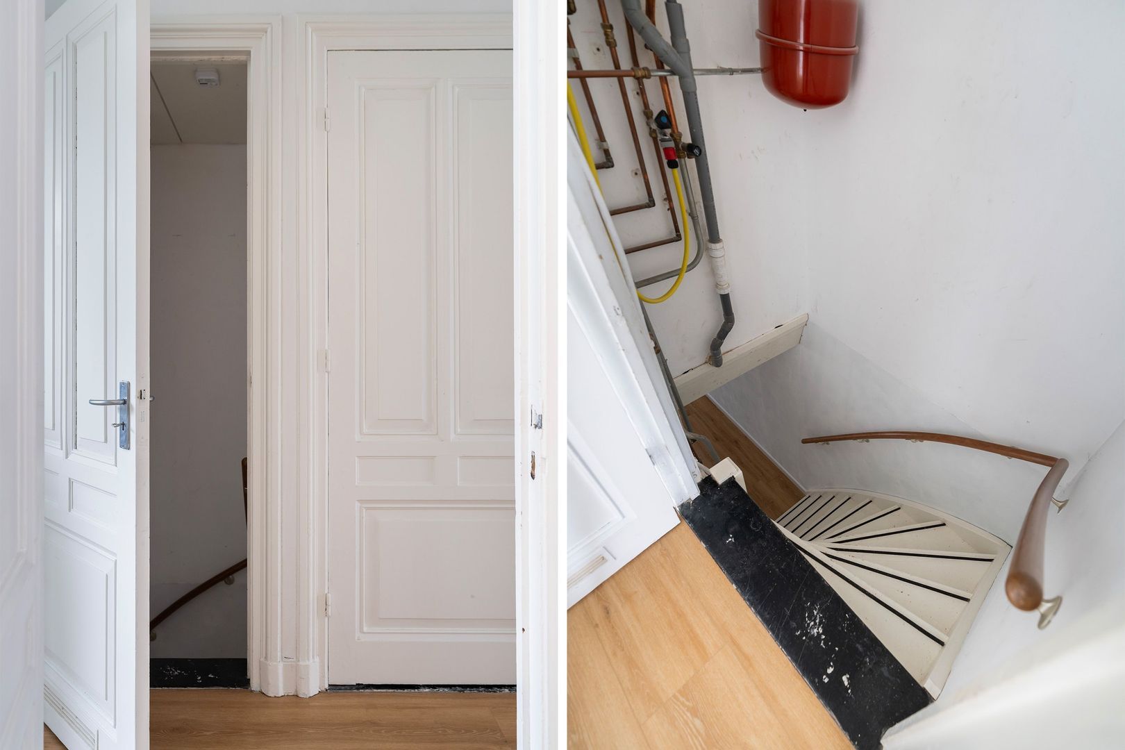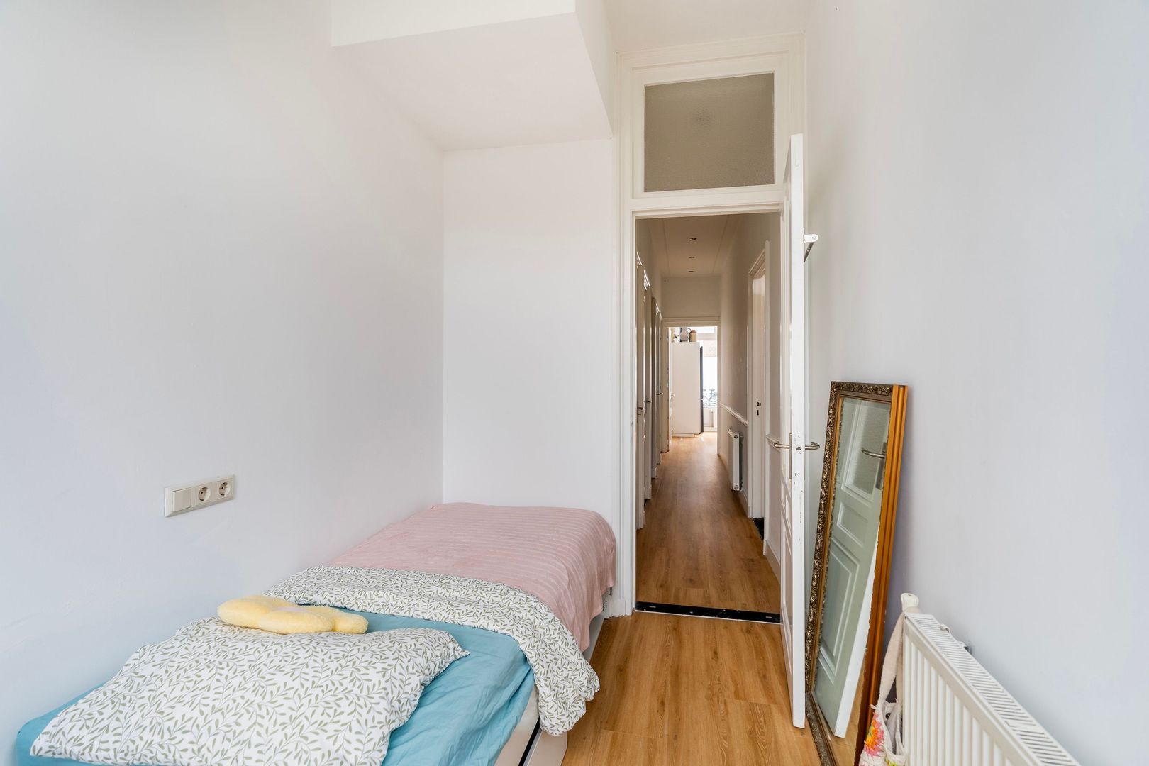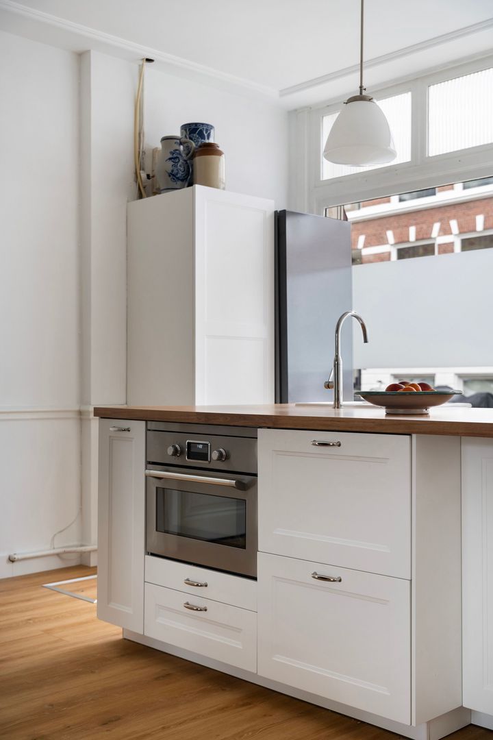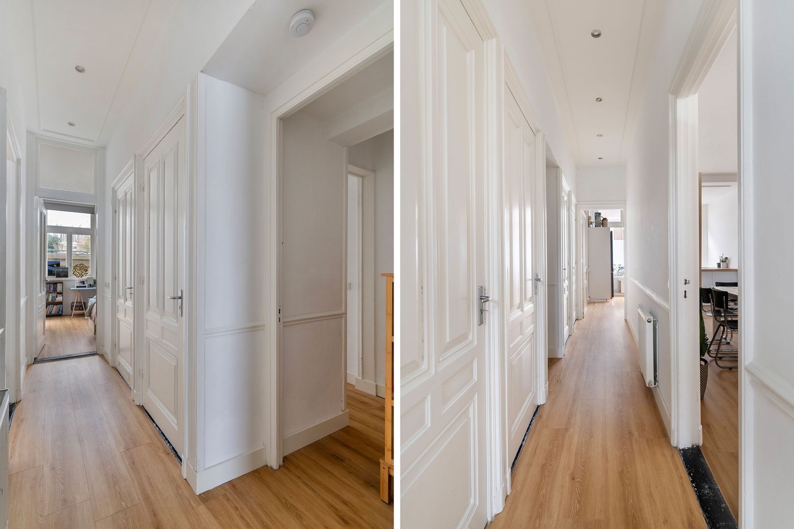 Entree aan de straatzijde. Halletje. De riante woonkamer is ca 12 meter diep en heeft een breedte van meer dan 4 meter en heeft openslaande deuren naar de achtertuin. Aan de voorzijde is de open keuken (2024) geïnstalleerd met een groot kook-werkeiland met apparatuur. Het grote raamkozijn aan de voorzijde geeft veel licht naar binnen. Vanuit de woonkamer toegang tot de gang met bergruimten, toilet, en trap naar het souterrain. Via de gang toegang tot 2 slaapkamers aan de achterzijde ca. 3.78x2.24 en ca. 3.78x2.11. Moderne badkamer (2024) met retro tegelwerk, inloopdouche en wastafel. Souterrain ca. 3.41x3.75 met koekoek voor lichtinval en nieuw kozijn met dubbel glas. Smalle beschutte achtertuin/plaats op het Noord-Westen over de volle breedte ca. 9x1.20/3.