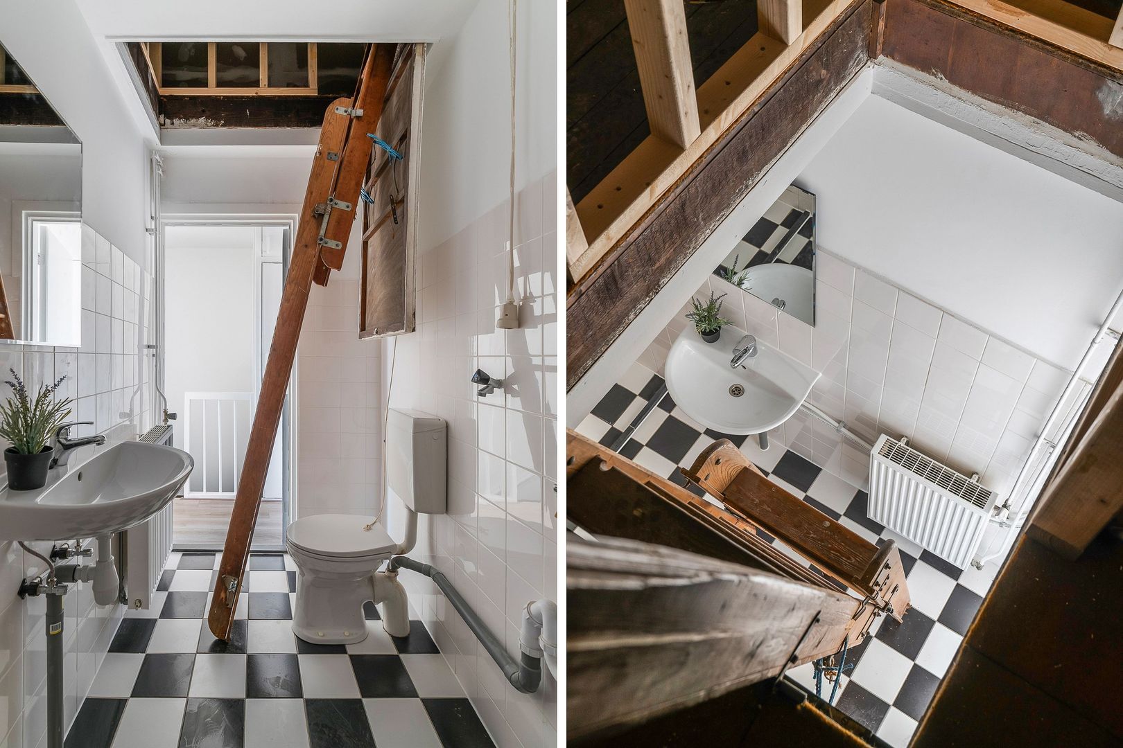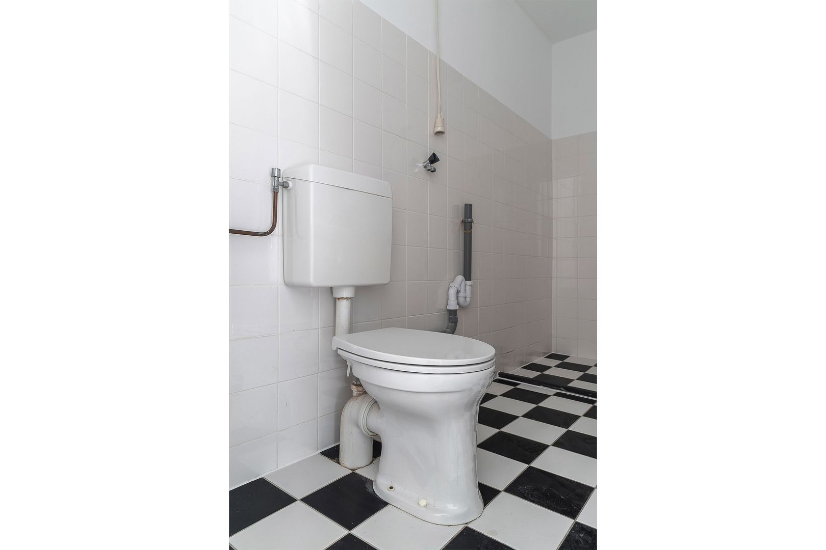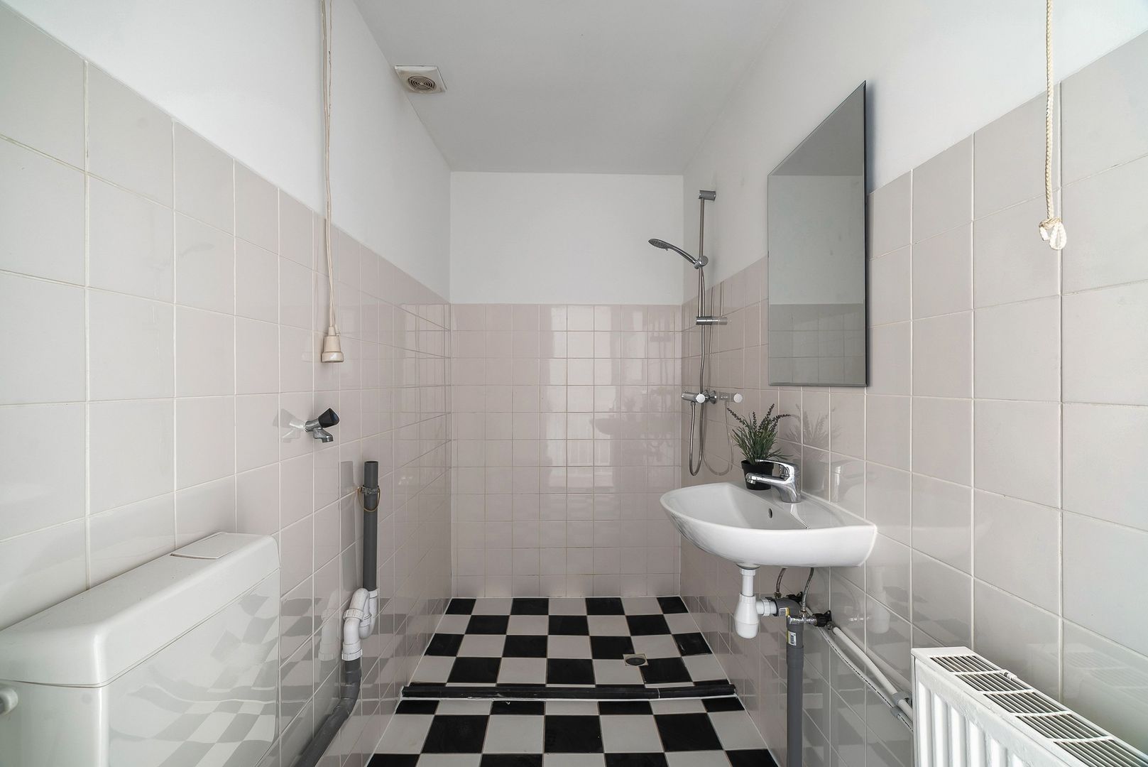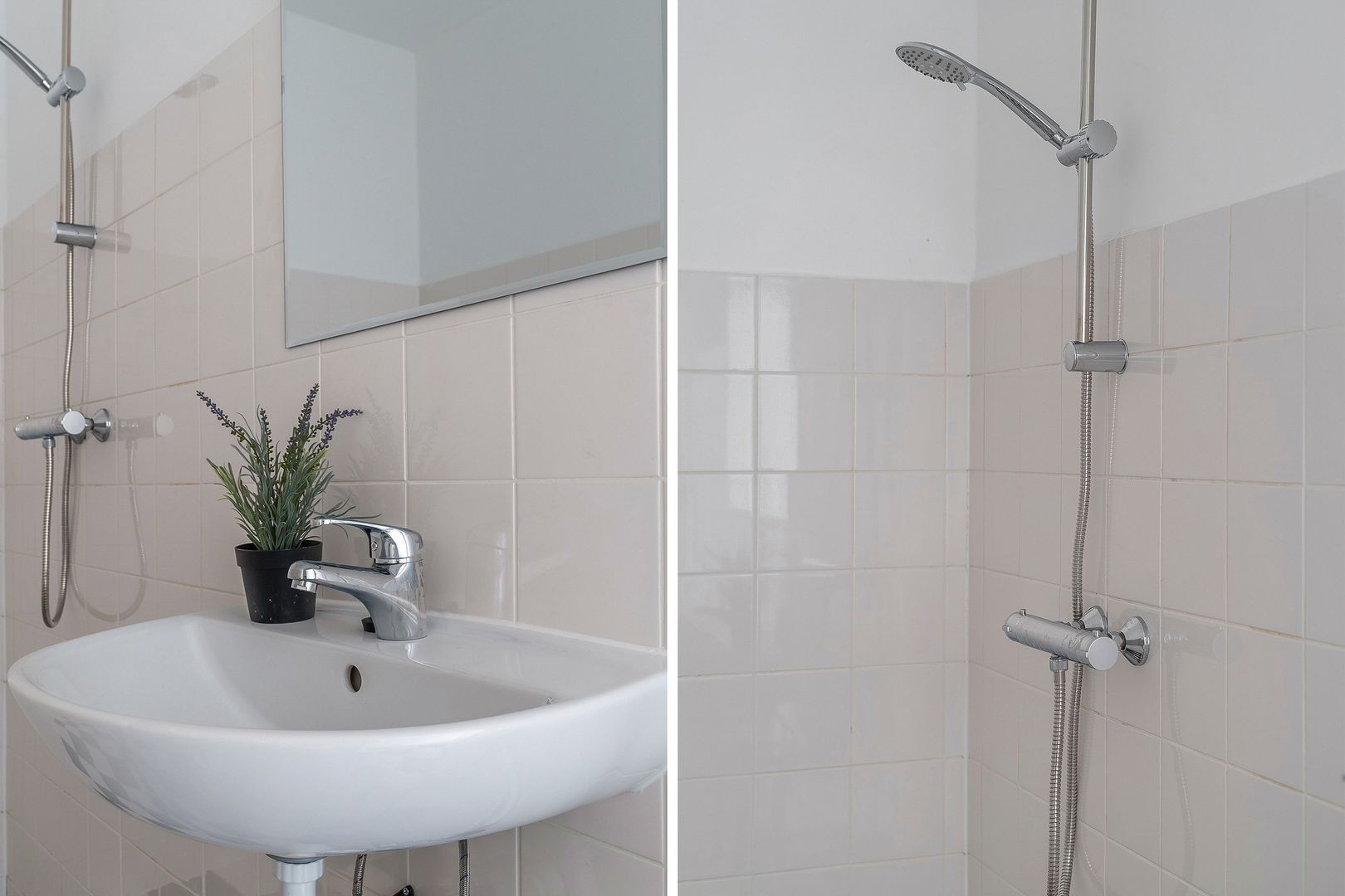 . De badkamer (ca. 1.38 m x 2.84 m) is compact maar efficiënt ingedeeld en voorzien van een douche, wastafel en toilet.