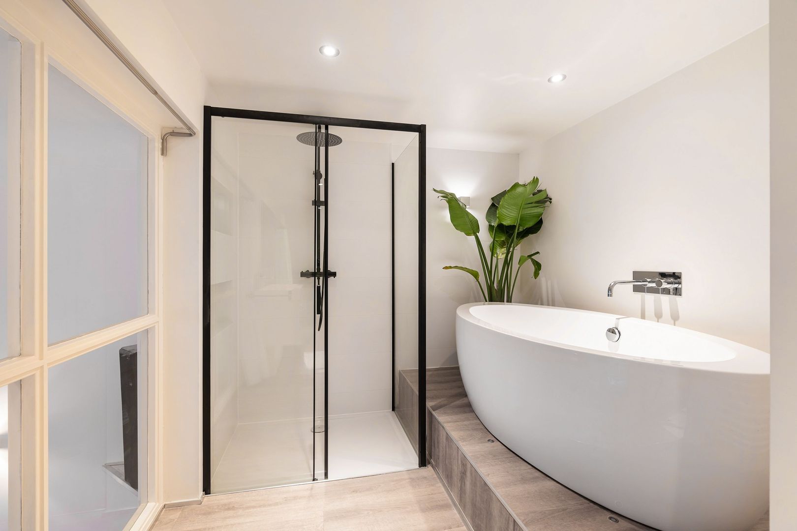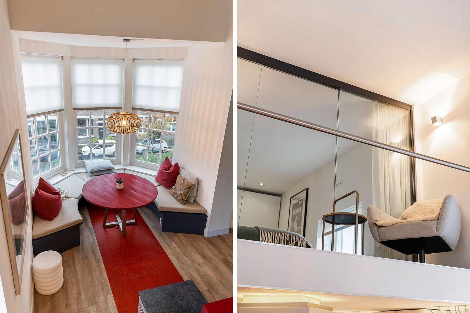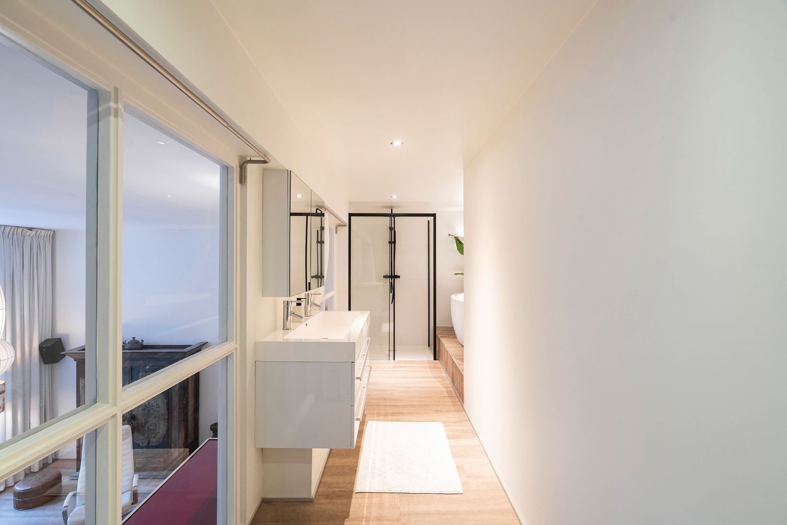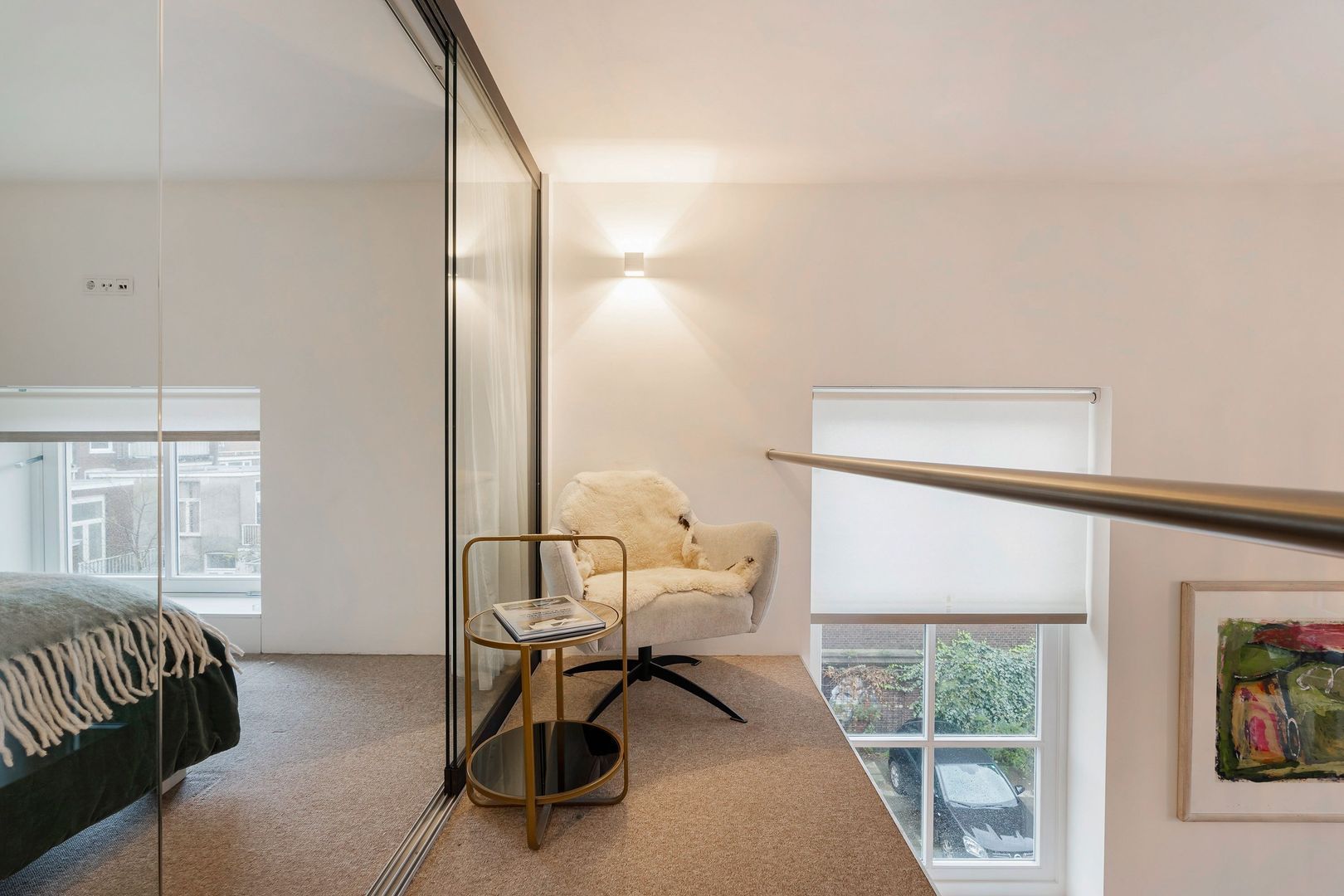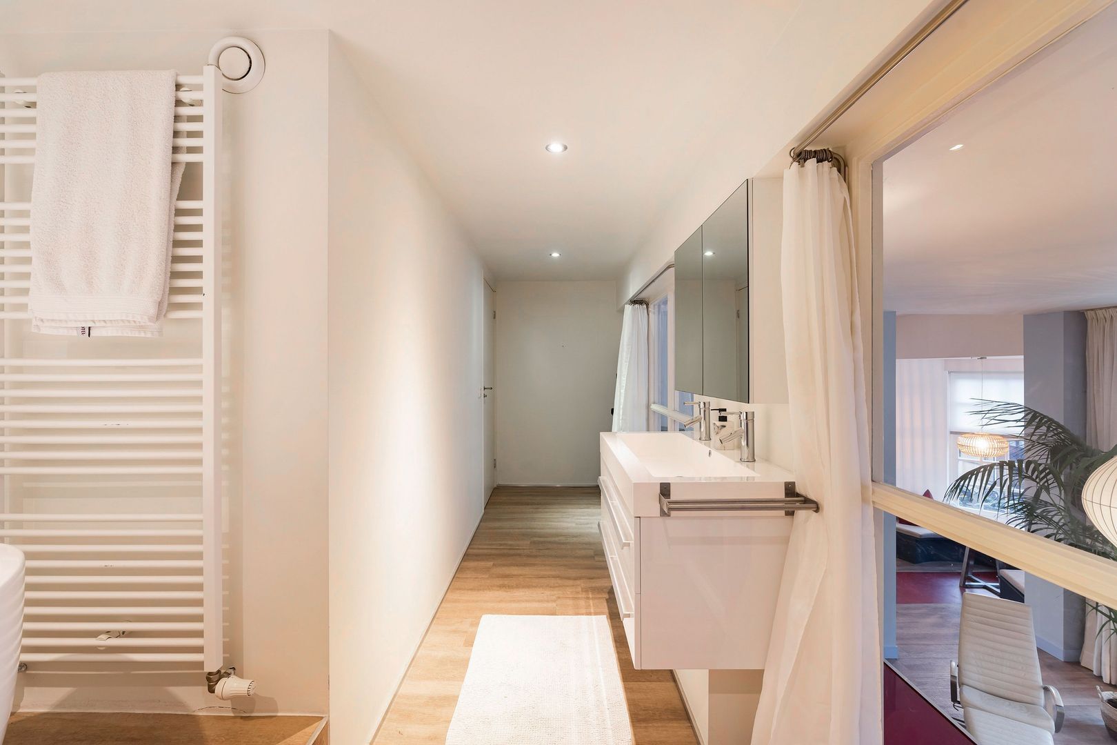 Vanuit de garderoberuimte met oorspronkelijk tegelwerk gaat de trap naar de bovenliggende etage; overloop, 2 slaapkamers waarvan 1 met zicht op de woonkamer en met schuifpui naar een inpandig balkon, toilet, fraaie badkamer met dubbele wastafel, inloopdouche, vrijstaand bad en grote raampartij met zicht op woonkamer.