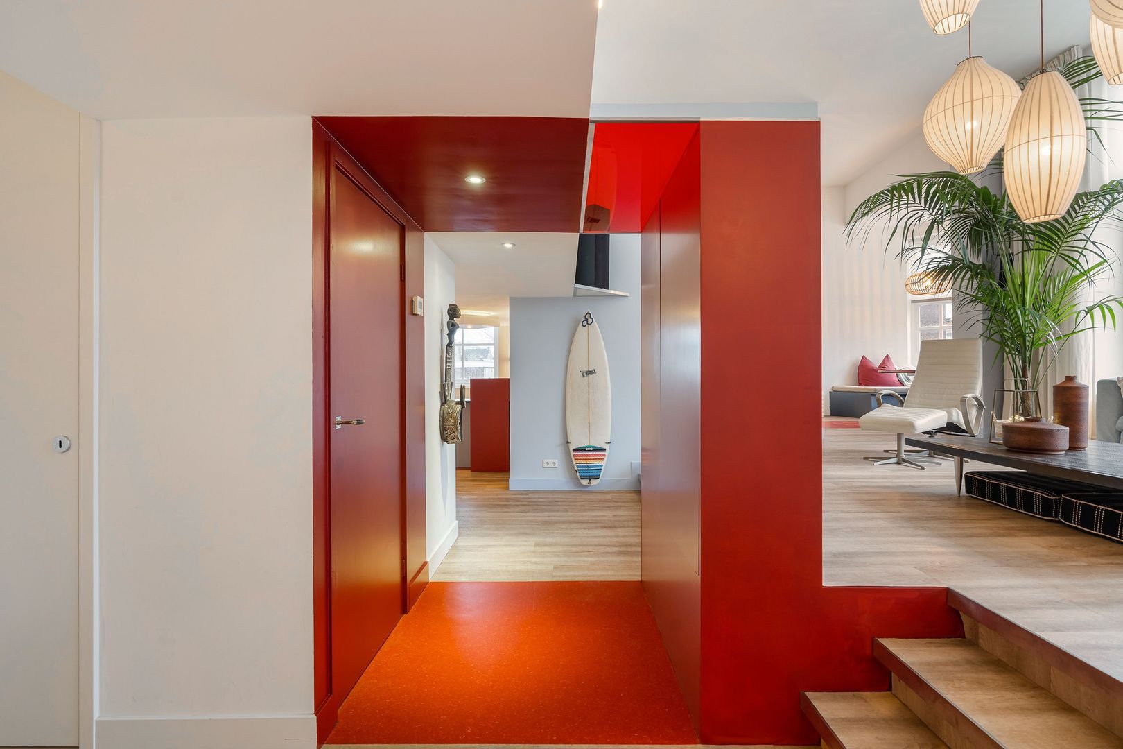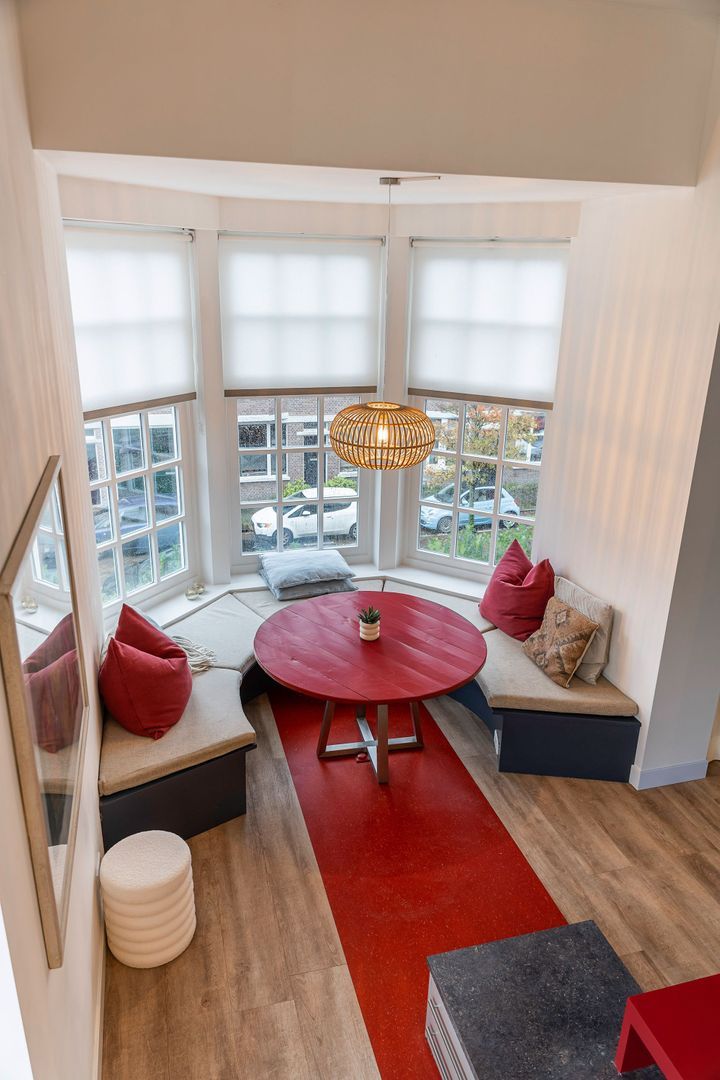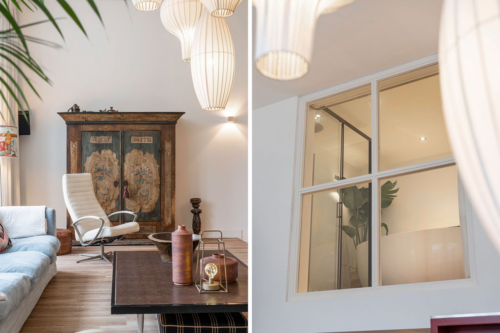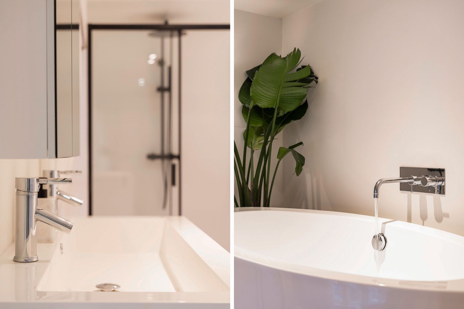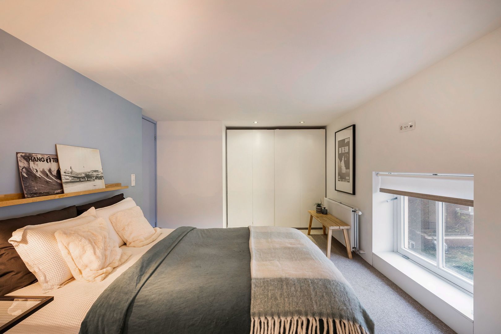 Vanuit de garderoberuimte met oorspronkelijk tegelwerk gaat de trap naar de bovenliggende etage; overloop, 2 slaapkamers waarvan 1 met zicht op de woonkamer en met schuifpui naar een inpandig balkon, toilet, fraaie badkamer met dubbele wastafel, inloopdouche, vrijstaand bad en grote raampartij met zicht op woonkamer.