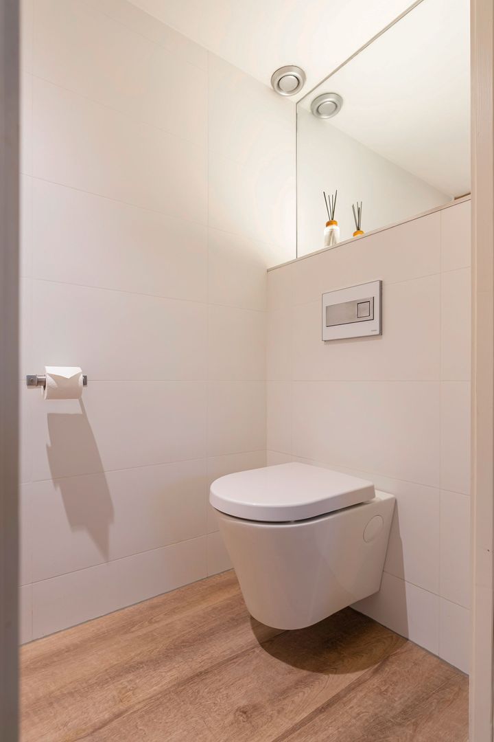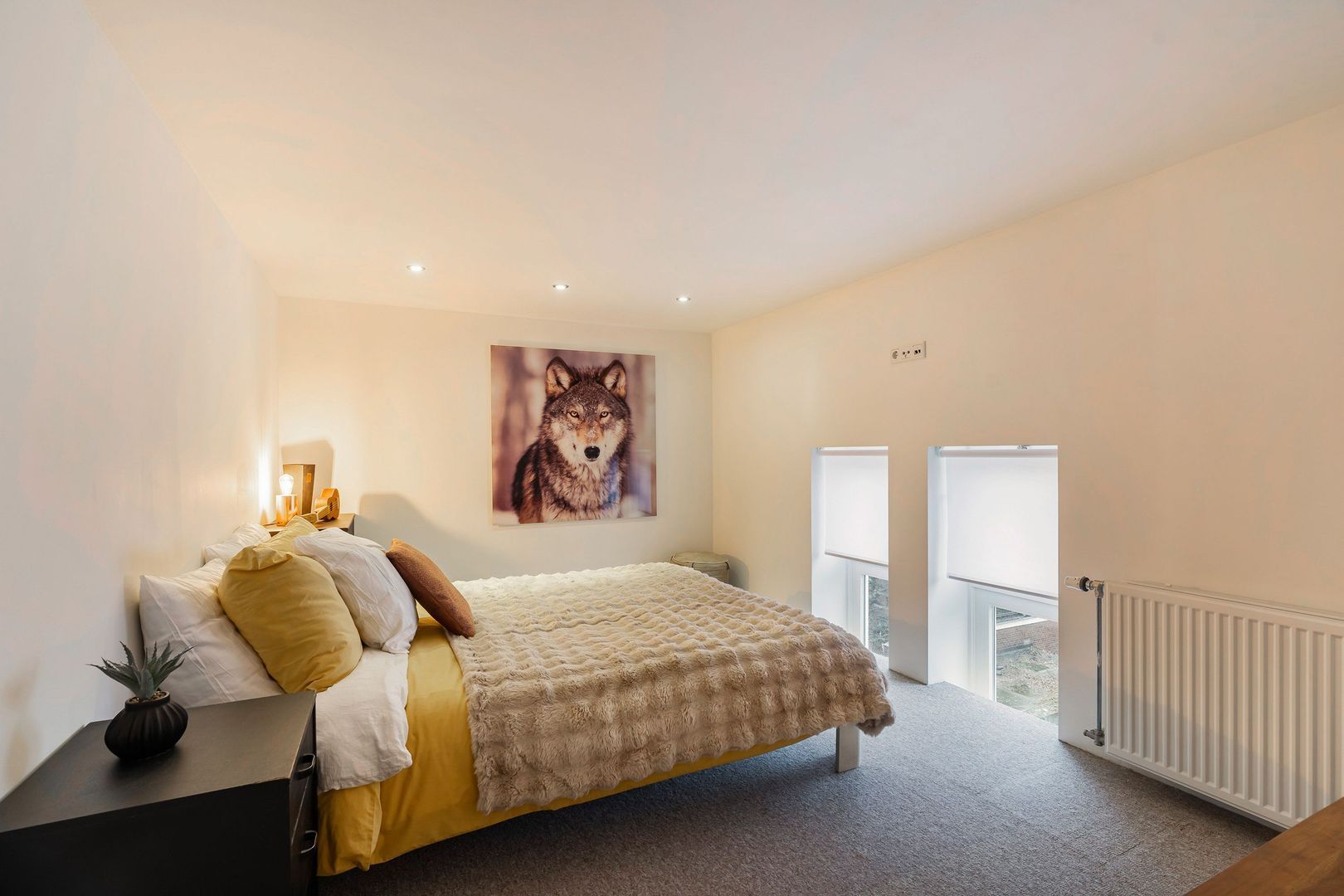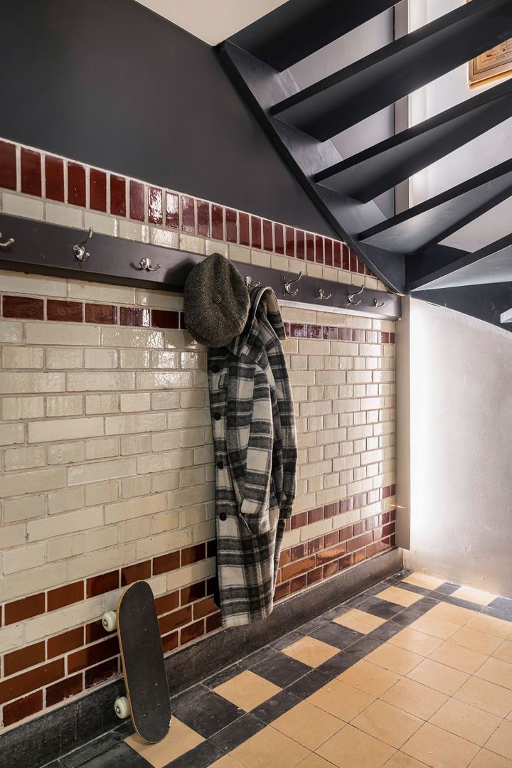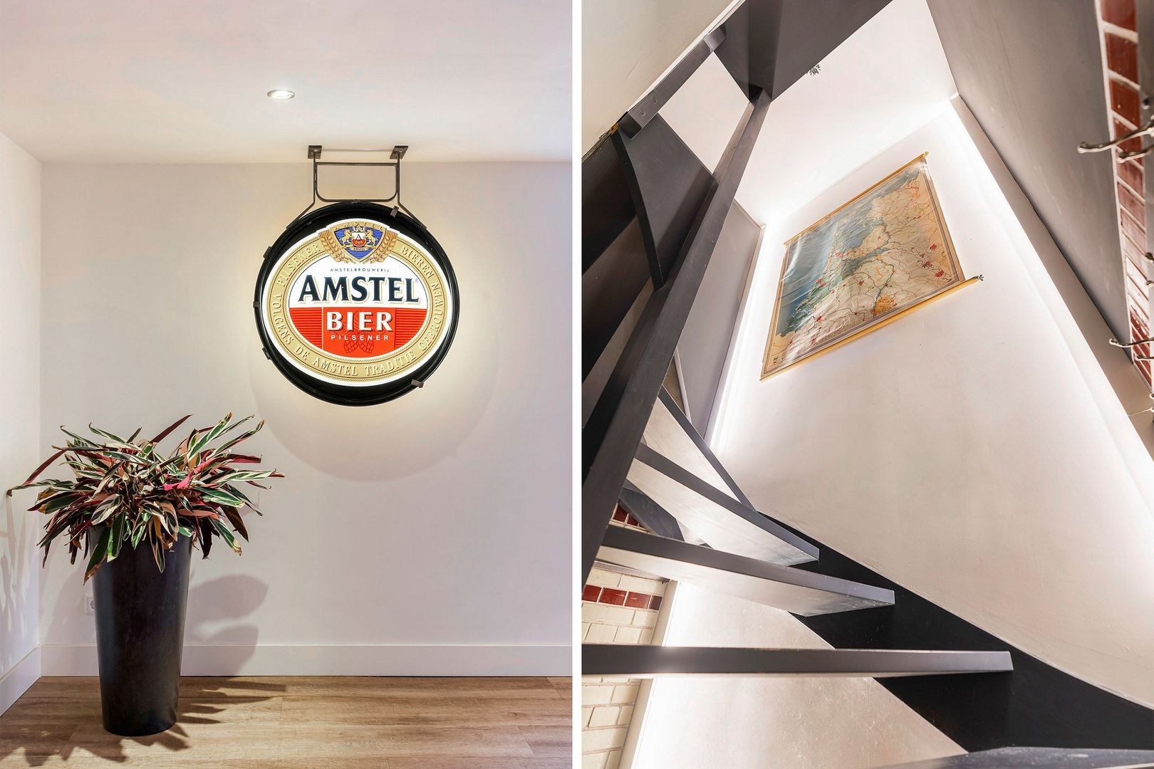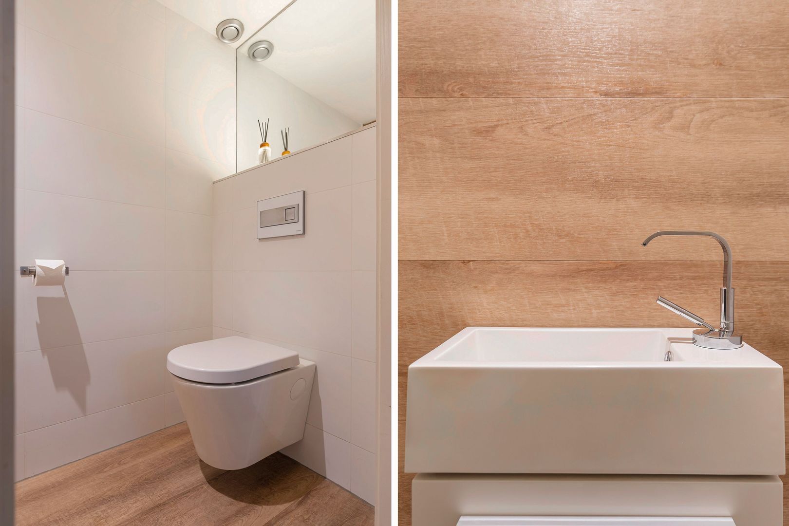Vanuit de garderoberuimte met oorspronkelijk tegelwerk gaat de trap naar de bovenliggende etage; overloop, 2 slaapkamers waarvan 1 met zicht op de woonkamer en met schuifpui naar een inpandig balkon, toilet, fraaie badkamer met dubbele wastafel, inloopdouche, vrijstaand bad en grote raampartij met zicht op woonkamer.