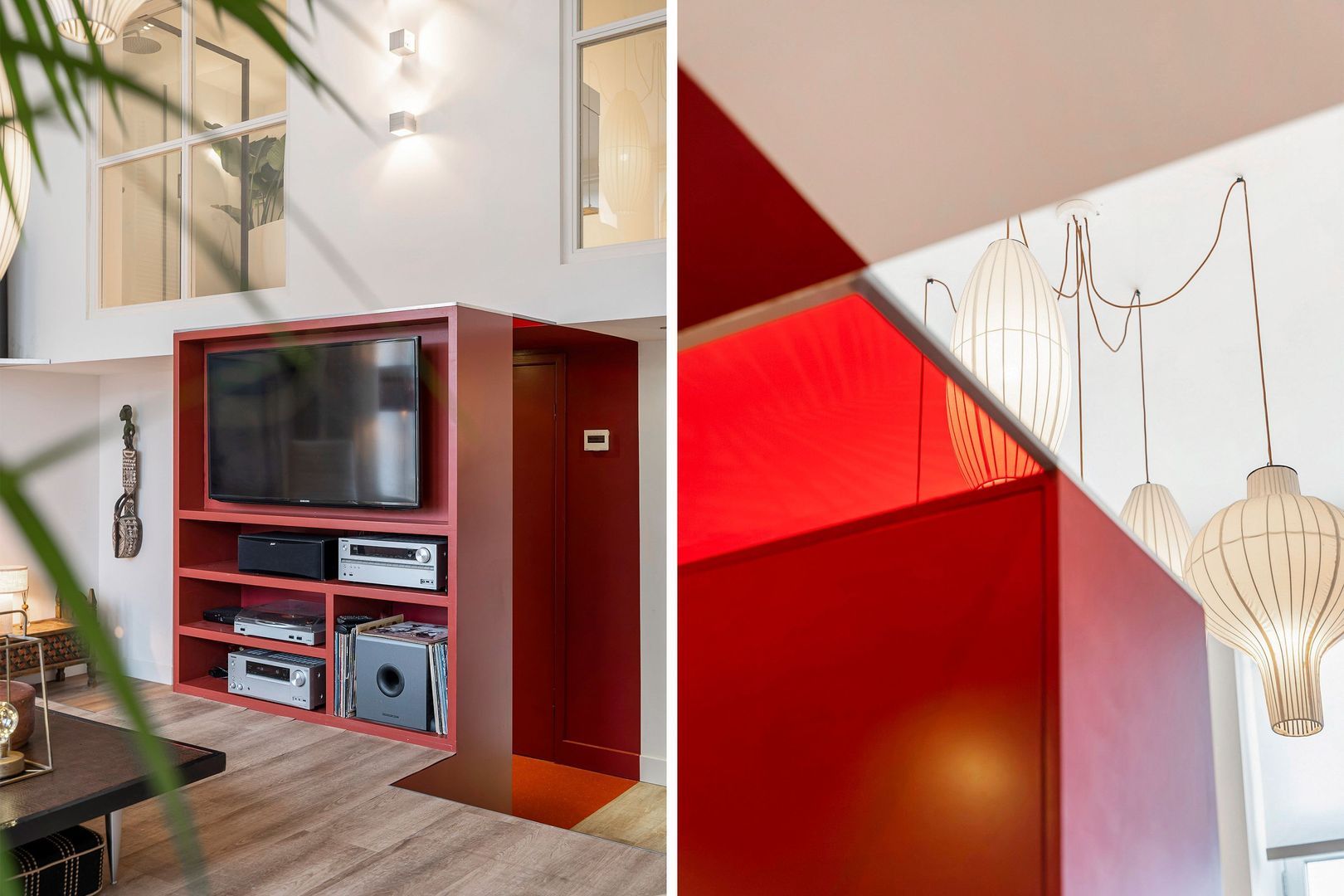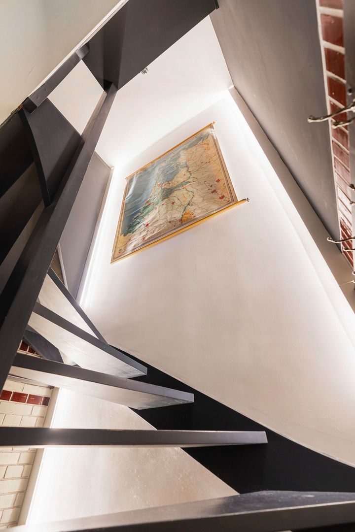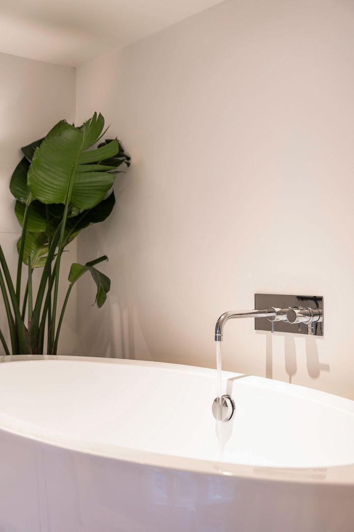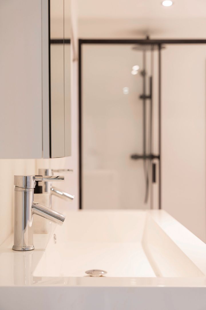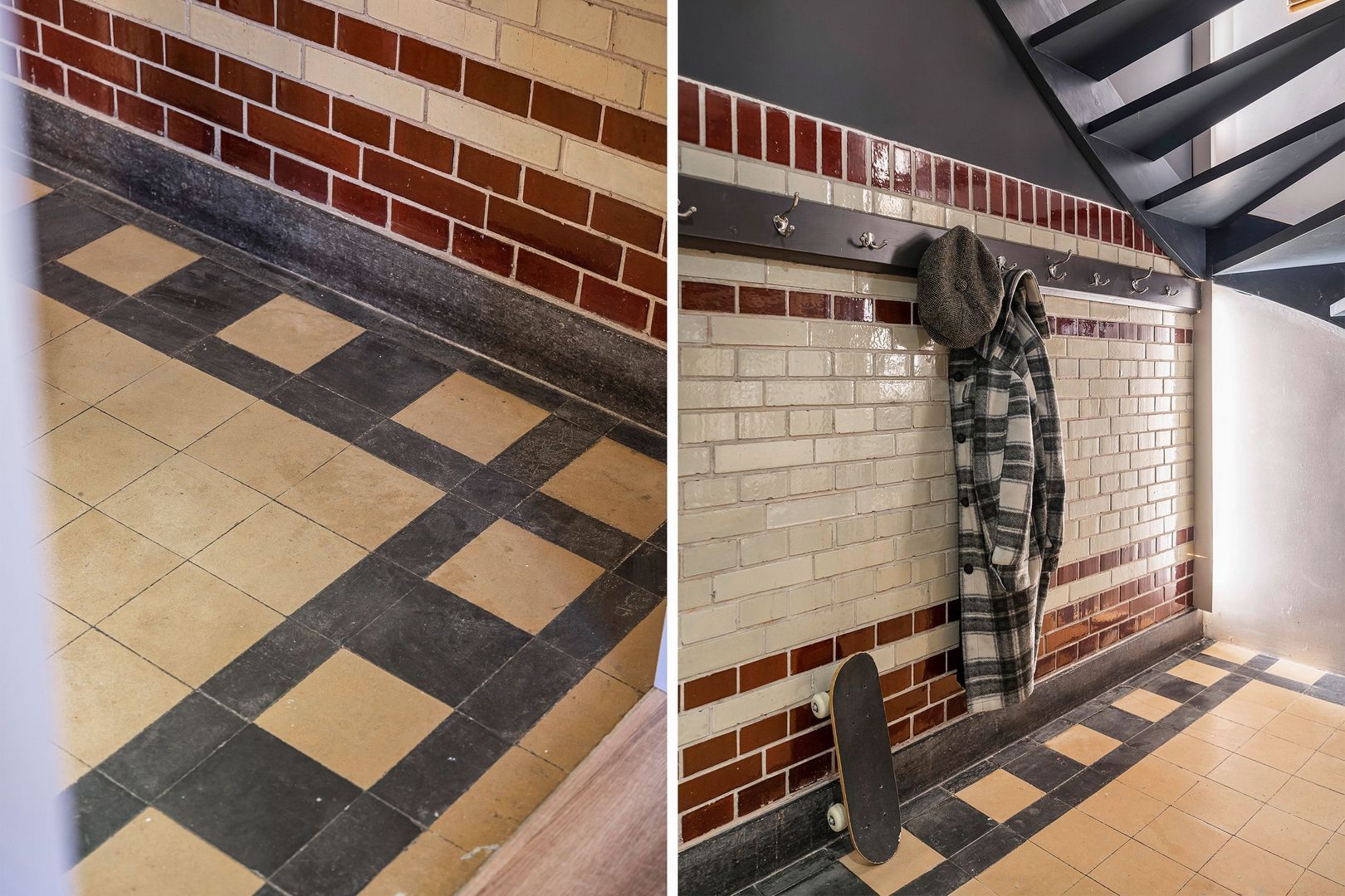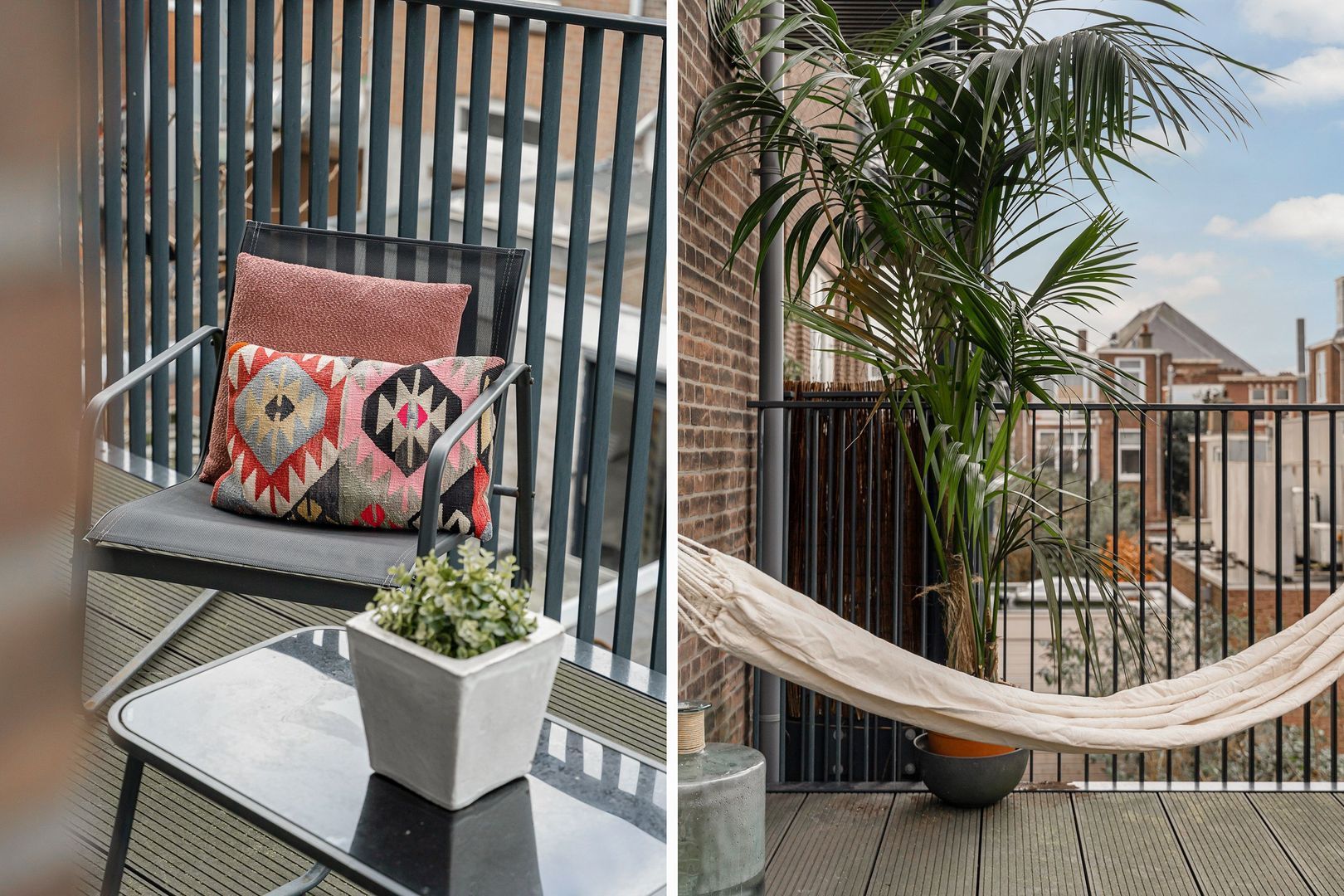 Vanuit de garderoberuimte met oorspronkelijk tegelwerk gaat de trap naar de bovenliggende etage; overloop, 2 slaapkamers waarvan 1 met zicht op de woonkamer en met schuifpui naar een inpandig balkon, toilet, fraaie badkamer met dubbele wastafel, inloopdouche, vrijstaand bad en grote raampartij met zicht op woonkamer.