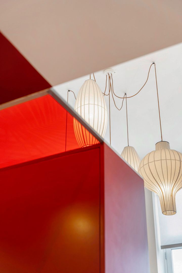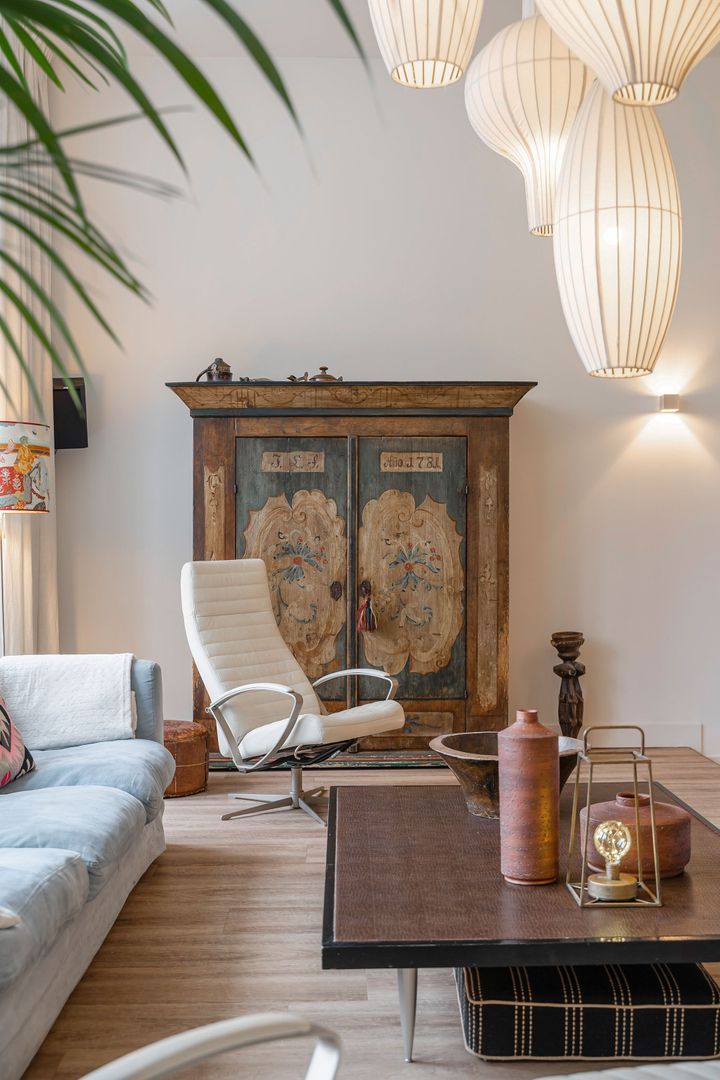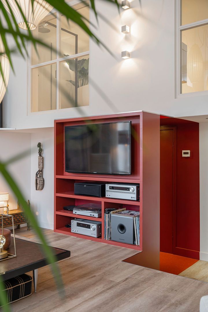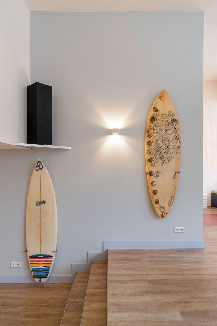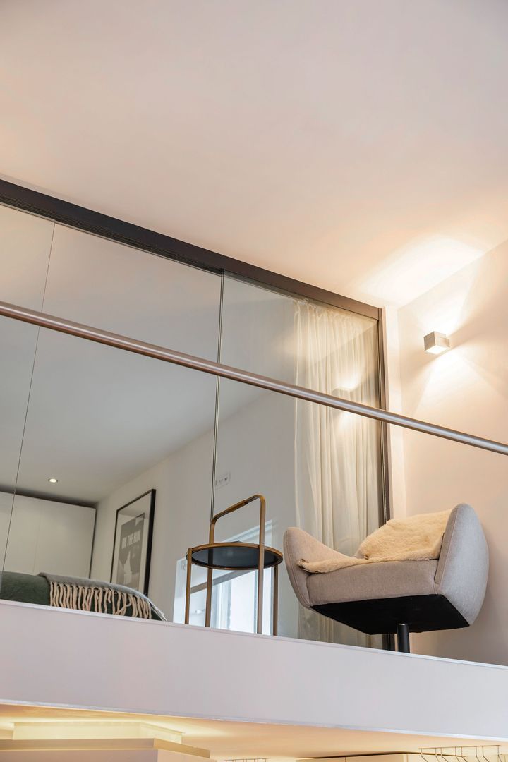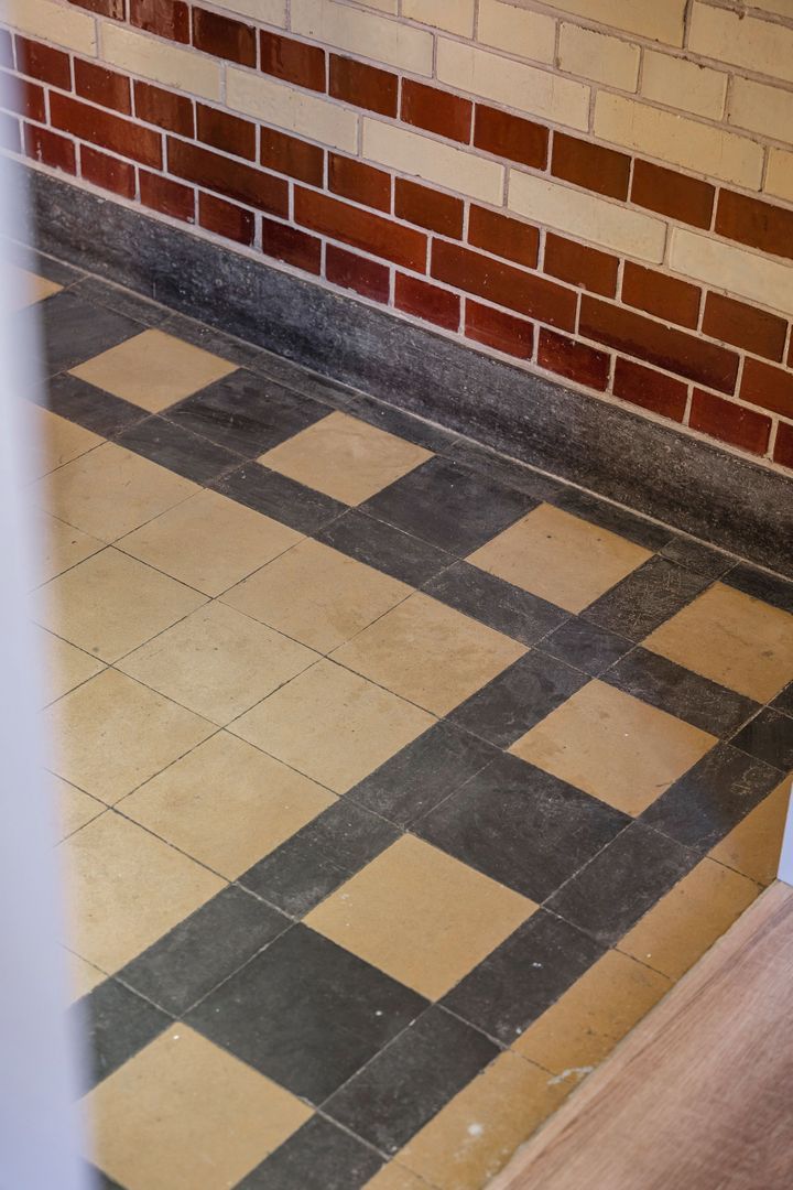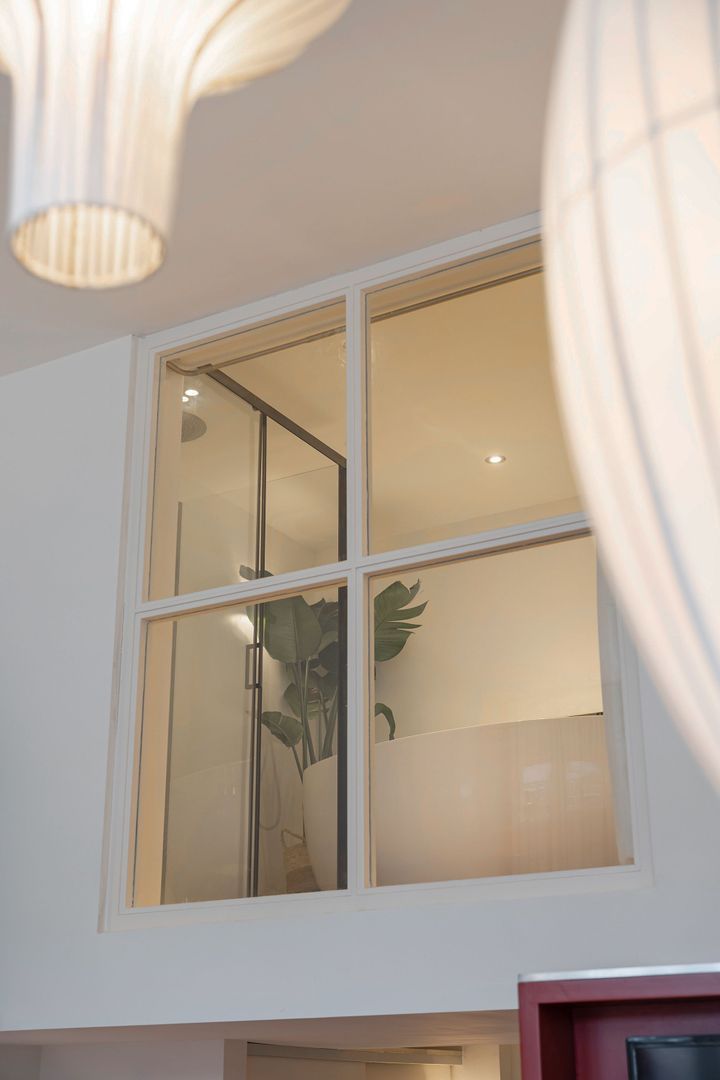Vanuit de garderoberuimte met oorspronkelijk tegelwerk gaat de trap naar de bovenliggende etage; overloop, 2 slaapkamers waarvan 1 met zicht op de woonkamer en met schuifpui naar een inpandig balkon, toilet, fraaie badkamer met dubbele wastafel, inloopdouche, vrijstaand bad en grote raampartij met zicht op woonkamer.