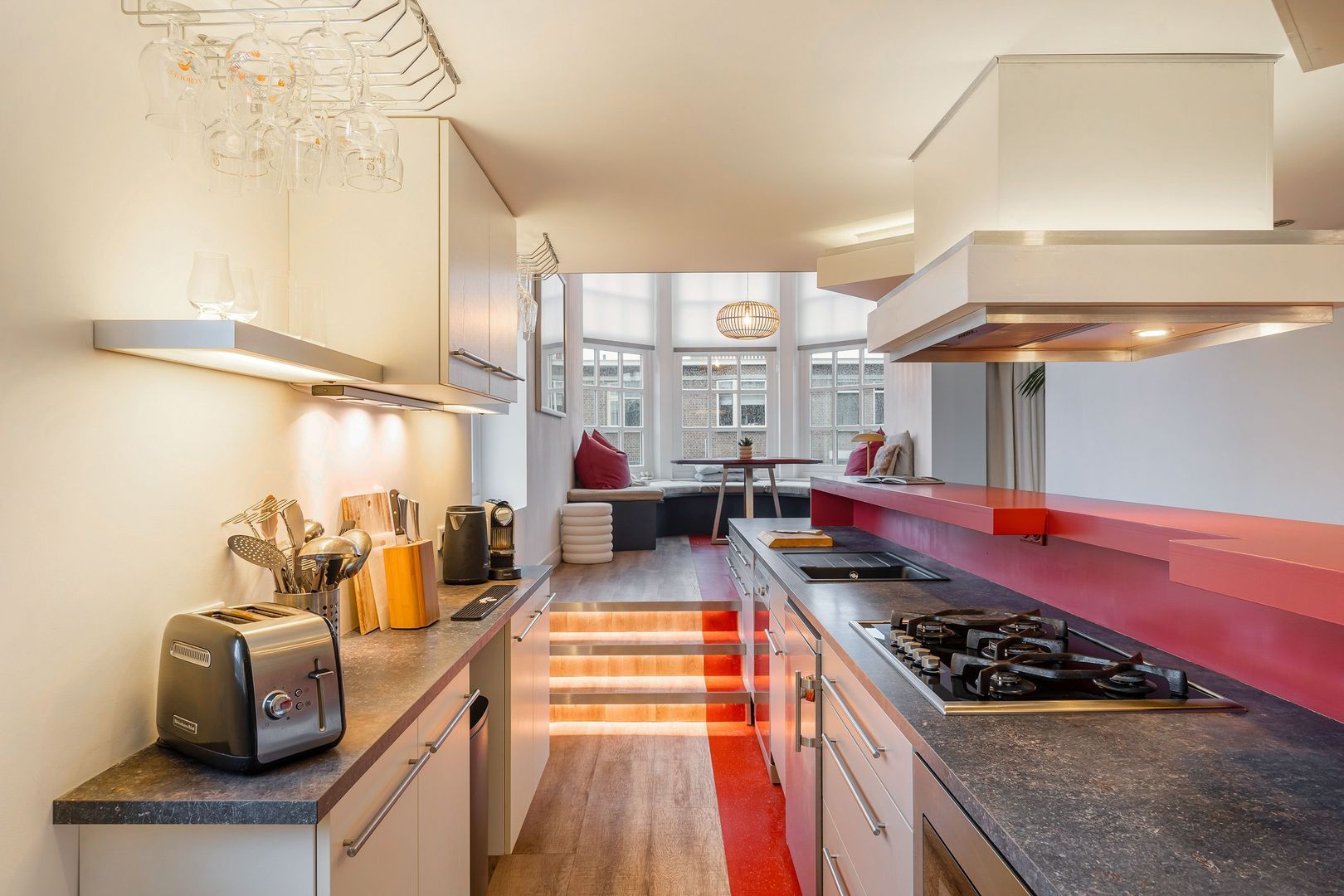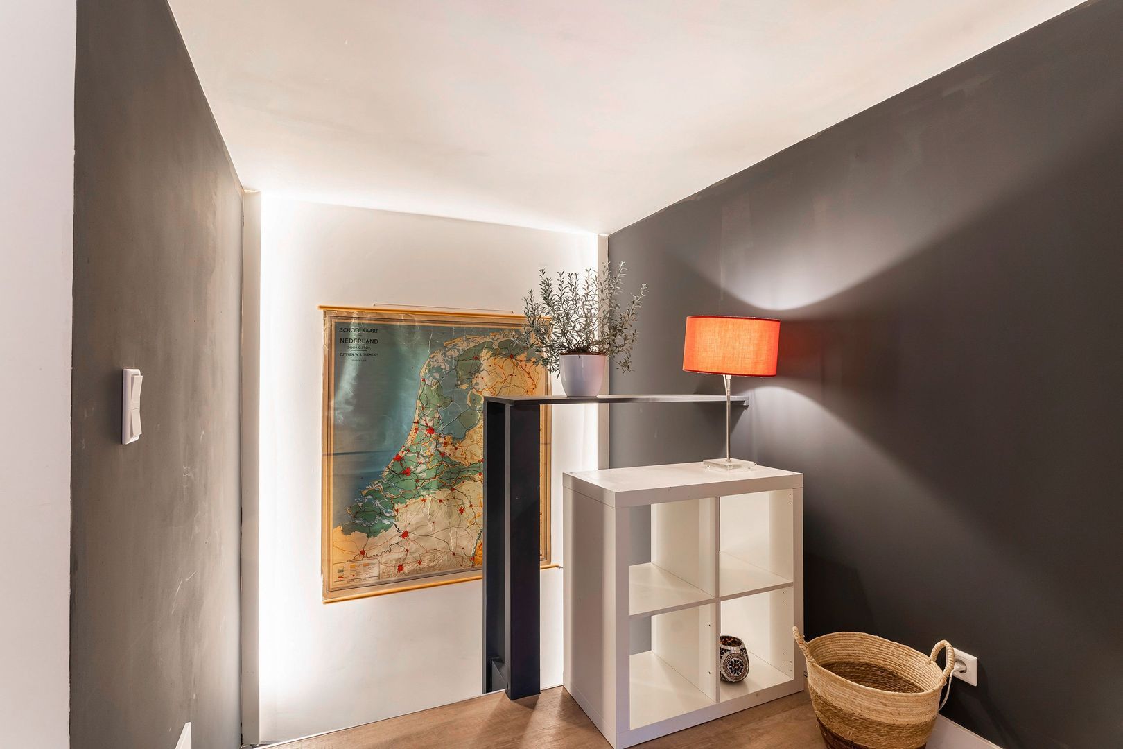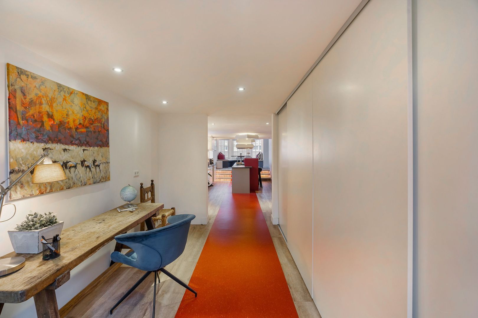 Entree appartement; hal doorlopend in verhoogd woonkamergedeelte (hierdoor prima zicht naar buiten) met bergruimte onder de verhoging; eetgedeelte in de erker; via het entreegedeelte toegang tot de toiletruimte, technische ruimte en doorloop naar de garderobe en de uitgestrekte open keuken met diverse apparatuur. Vanuit de keuken met eetbar is het eetgedeelte met een kleine trap bereikbaar; vanuit het keukengedeelte een doorloop naar een werk/logeerruimte met tevens een kastenwand met o.a. de opstelplaats voor wasmachine/droger en de toegang tot het terras dat op het Noord-Westen (middagzon georiënteerd)