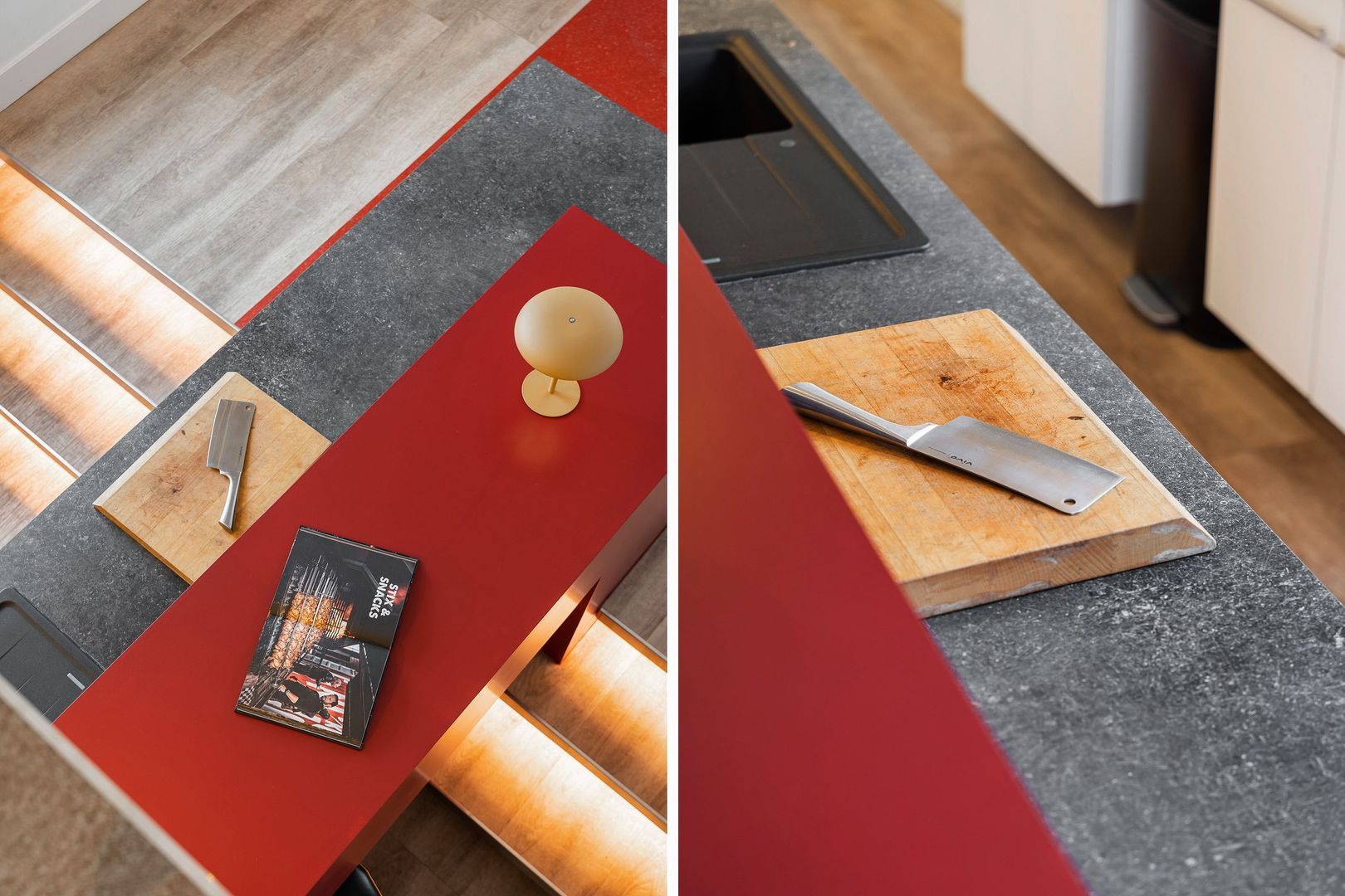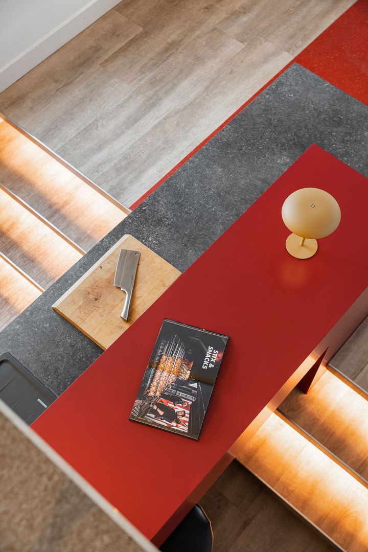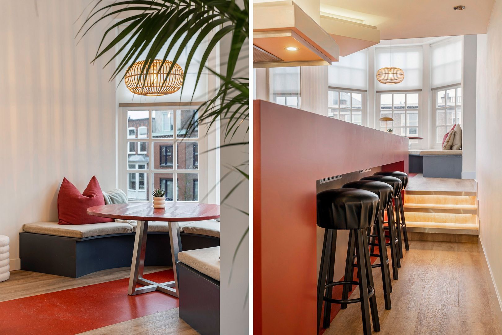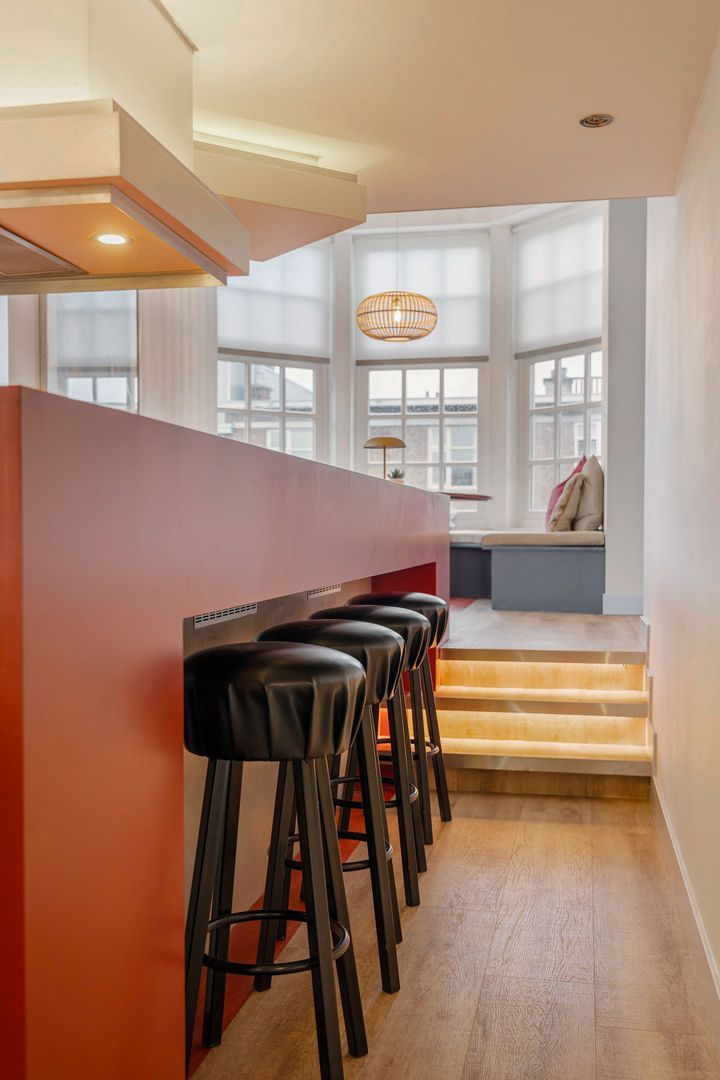 Entree appartement; hal doorlopend in verhoogd woonkamergedeelte (hierdoor prima zicht naar buiten) met bergruimte onder de verhoging; eetgedeelte in de erker; via het entreegedeelte toegang tot de toiletruimte, technische ruimte en doorloop naar de garderobe en de uitgestrekte open keuken met diverse apparatuur. Vanuit de keuken met eetbar is het eetgedeelte met een kleine trap bereikbaar; vanuit het keukengedeelte een doorloop naar een werk/logeerruimte met tevens een kastenwand met o.a. de opstelplaats voor wasmachine/droger en de toegang tot het terras dat op het Noord-Westen (middagzon georiënteerd)