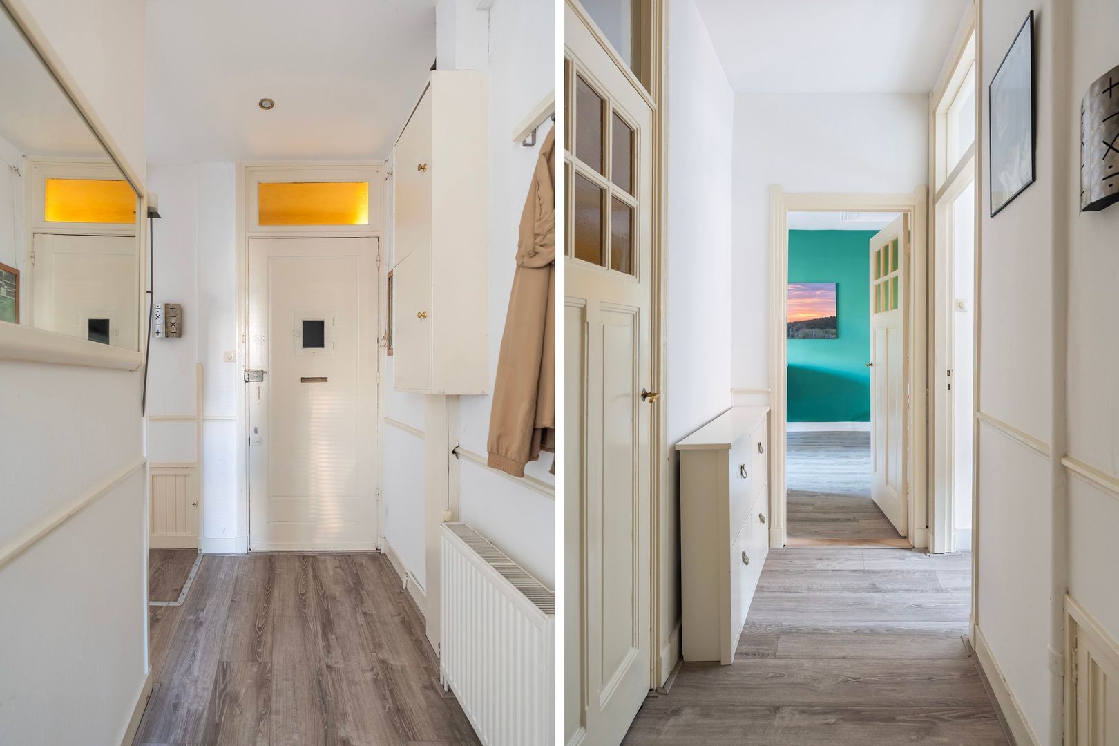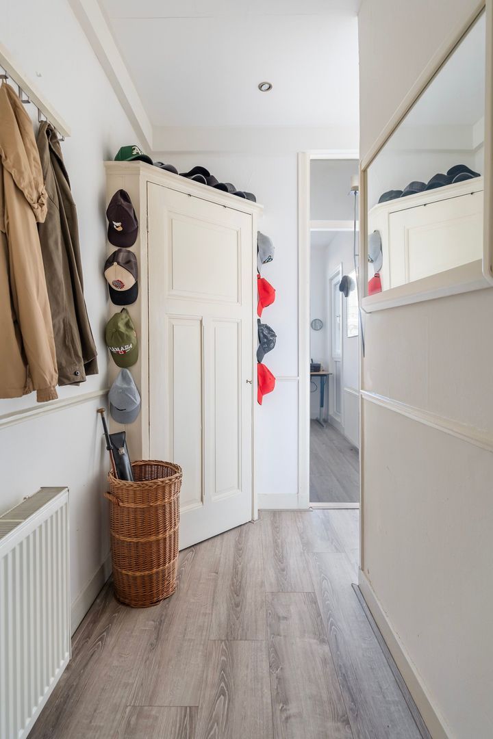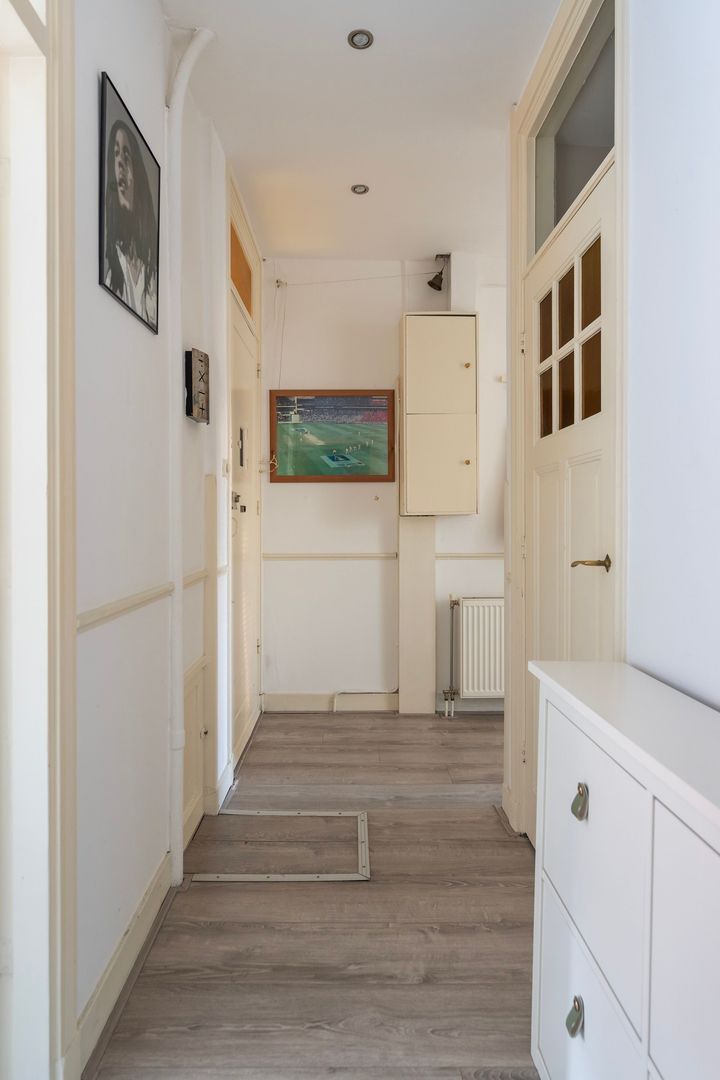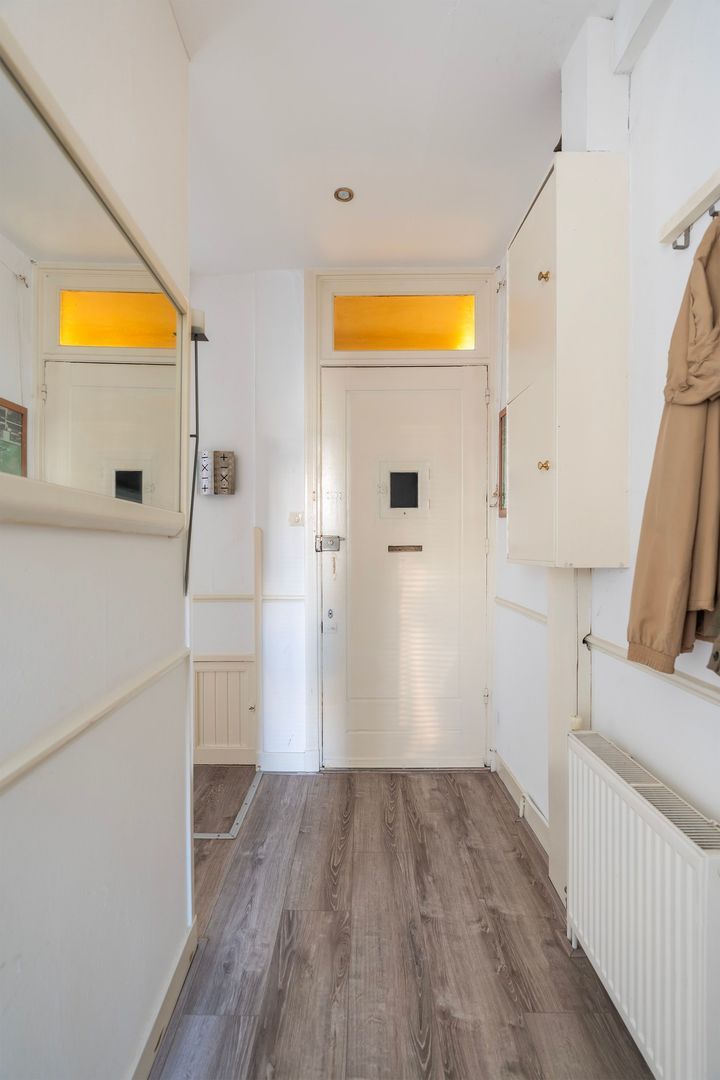 Woningentree via open portiek op de 1e etage; hal de meterkast; vaste kaste met de cv-opstelling: net toilet; doorgebroken woonkamer met sfeervolle erker, marmeren schouw met houtkachel aan de voorzijde en aan de achterzijde de moderne keuken (2019) met inbouwapparatuur; schuifpui naar het ruime balkon met balkonkast en een gezellig overdekt buiten zitje; 1e slaapkamer aan de voorzijde; moderne badkamer met inloopdouche, wastafelmeubel en handdoekradiator; 2e slaapkamer aan de achterzijde;