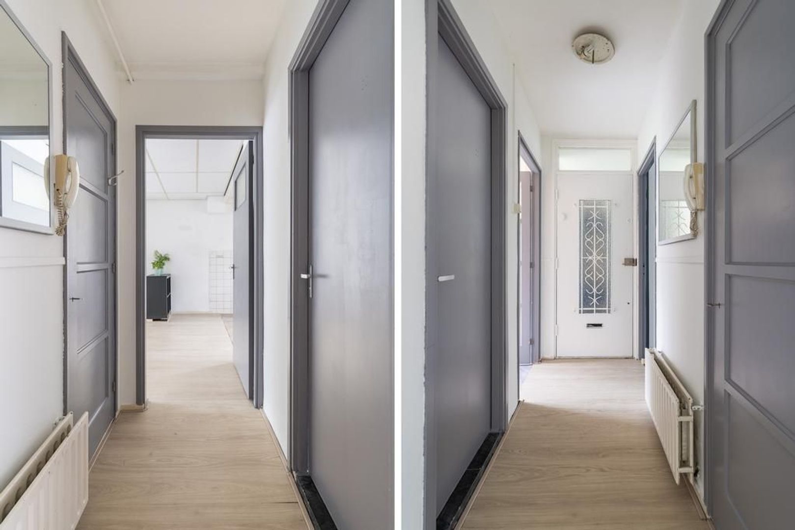 Woningentree via een afgesloten portiek met toegang tot de berging en trap naar de woningentree op de 1e woonlaag; hal met meterkast; woonkamer met een eenvoudige open keuken, toegang tot de berging onder de woning en het balkon; 1e slaapkamer aan de voorzijde met een vaste kast; 2e slaapkamer aan de achterzijde; moderne badkamer met inloopdouche, wastafelmeubel, toilet en de wasmachine aansluiting;