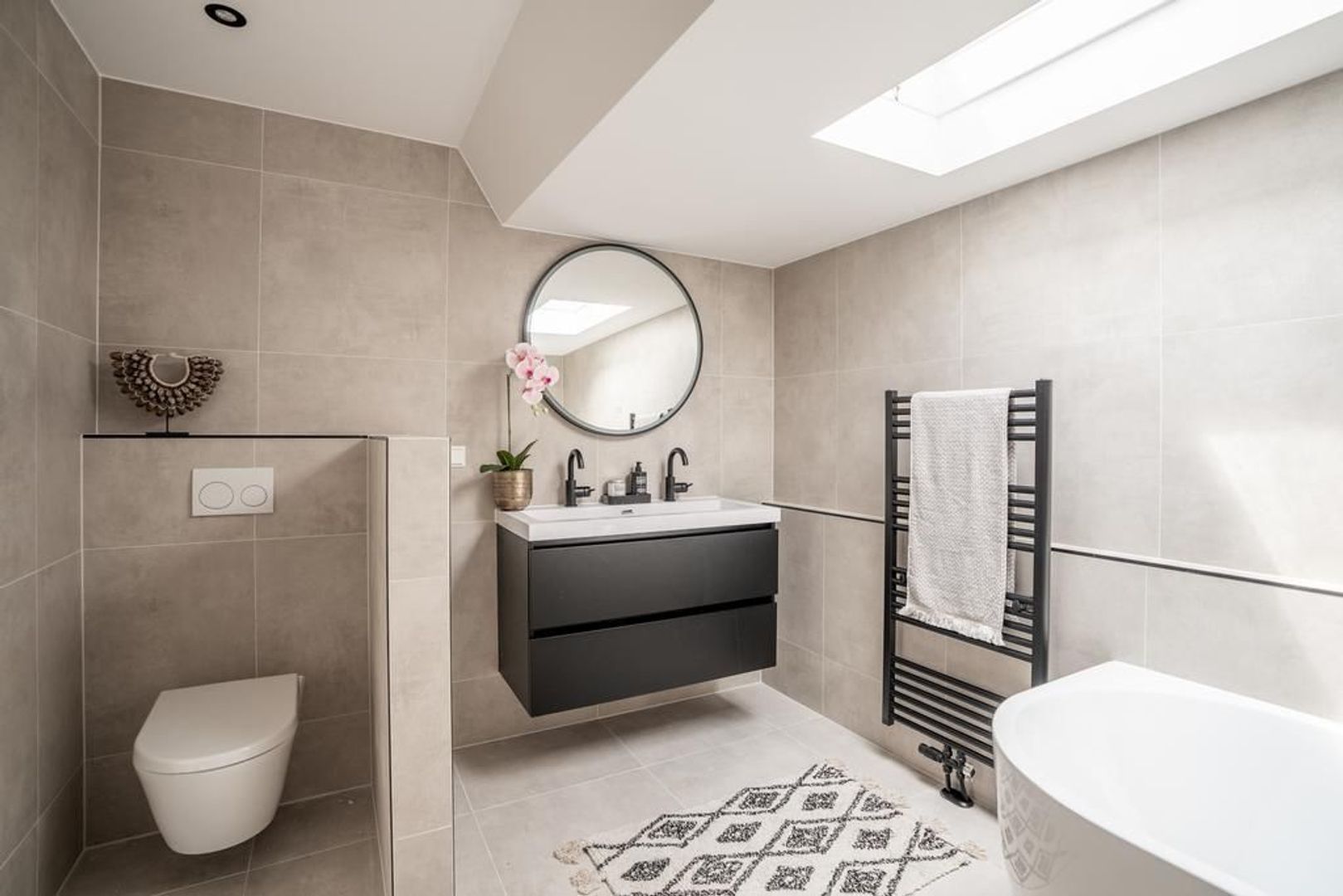 Vanaf overloop trap naar de 2e etage; overloop met bergruimte, cv-ruimte en opstelplaats wasmachine/droger; slaapkamer aan de voorzijde ca. 5.24x3.24 ruime slaapkamer aan de achterzijde ca. 3.34x5.24; Luxe badkamer ca. 3.43x2.53 met inloop douche, granieten badmeubel met dubbele wastafel en luxe vrijstaand ligbad.