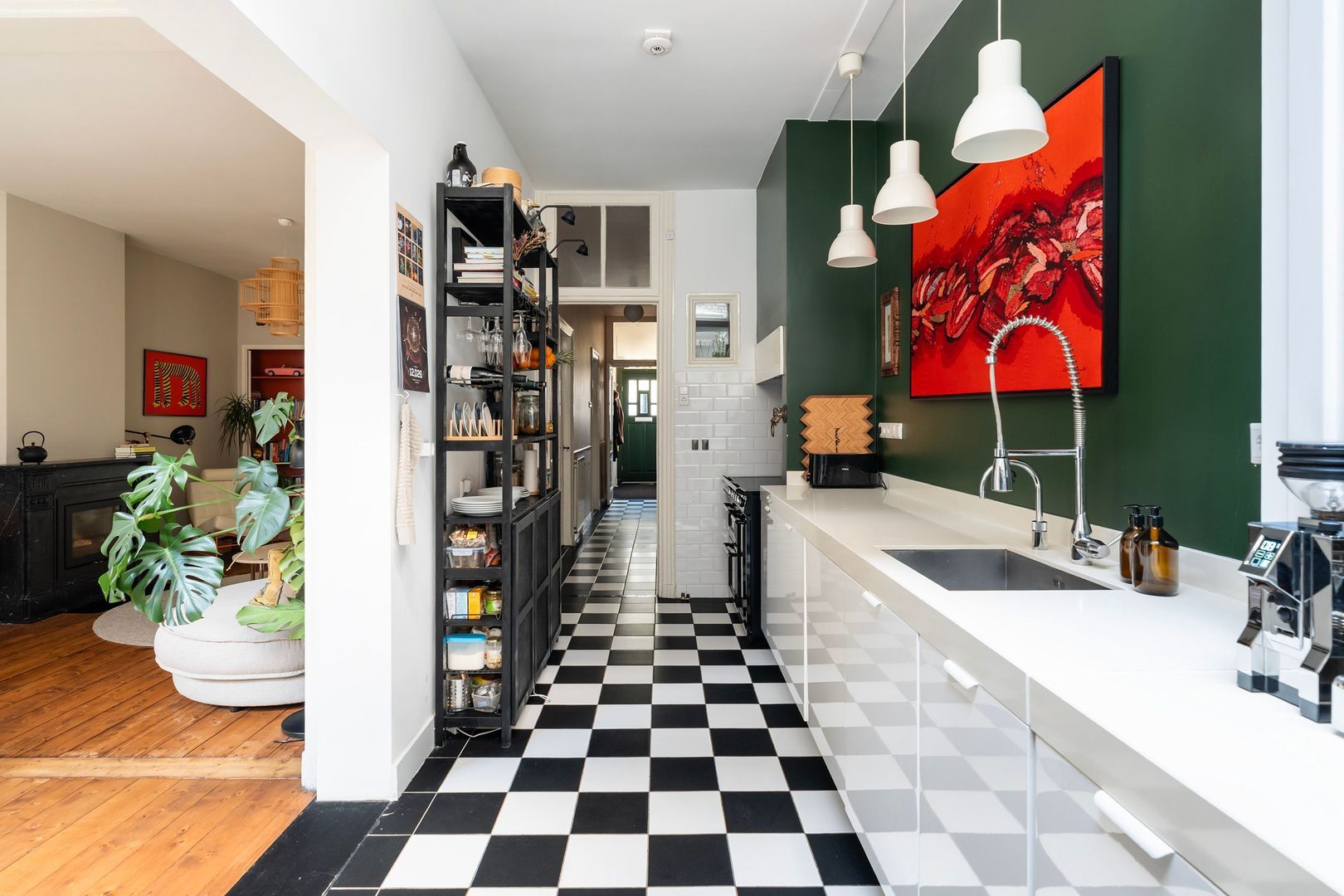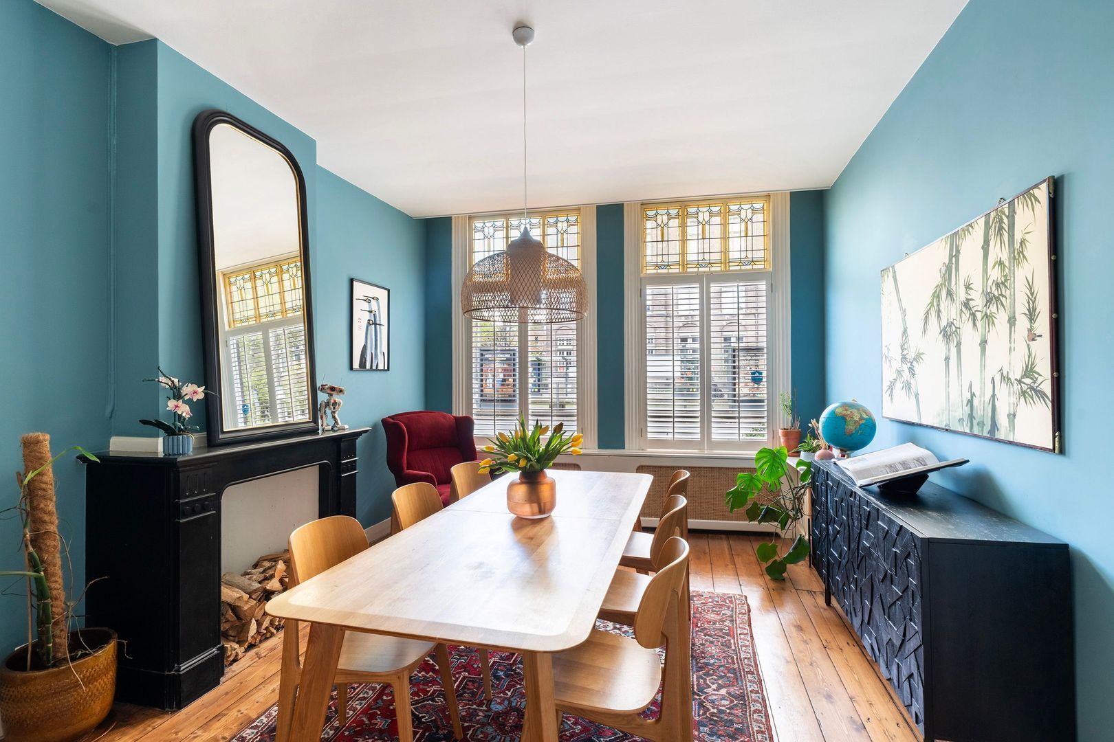 Royale woon-/eetkamer met fraaie glas in lood schuifseparatie en suitekasten. De voor(eet)kamer met originele schouw. De achter(woon)kamer met open haard is tuingericht. De woonkamer is voorzien van een massief houten vloer, geïsoleerde plafonds en openslaande deuren naar de tuin. Moderne en sfeervolle open keuken met groot composiet topblad waardoor veel werkruimte ontstaat. Smeg inductie fornuis met 3 ovens, vaatwasser, koel-/vriescombinatie, magnetron en diverse overige inbouwapparatuur. Overdekte binnenplaats die bij de keuken getrokken is en waardoor er zeer veel licht in de keuken komt.