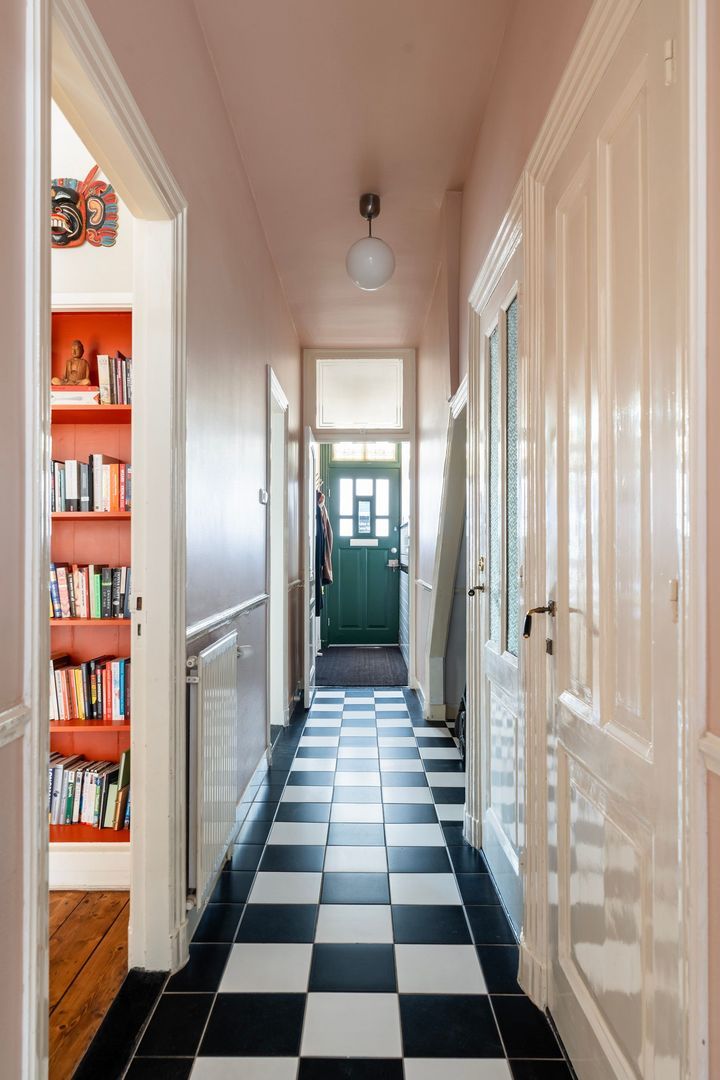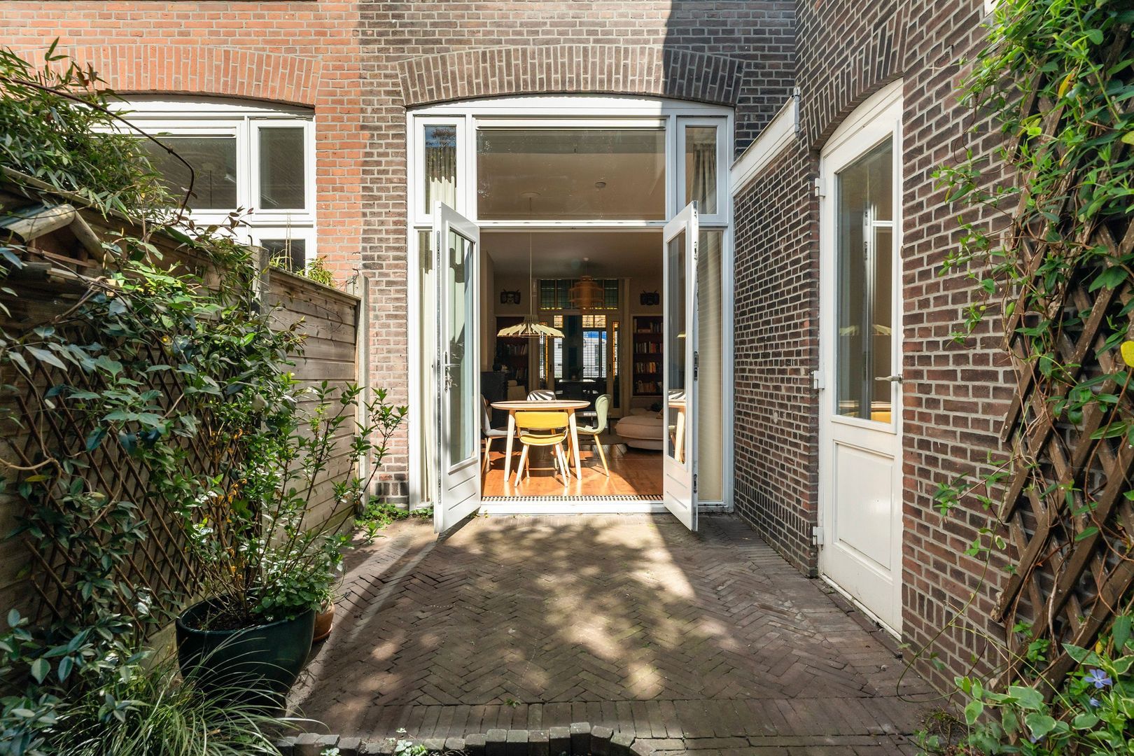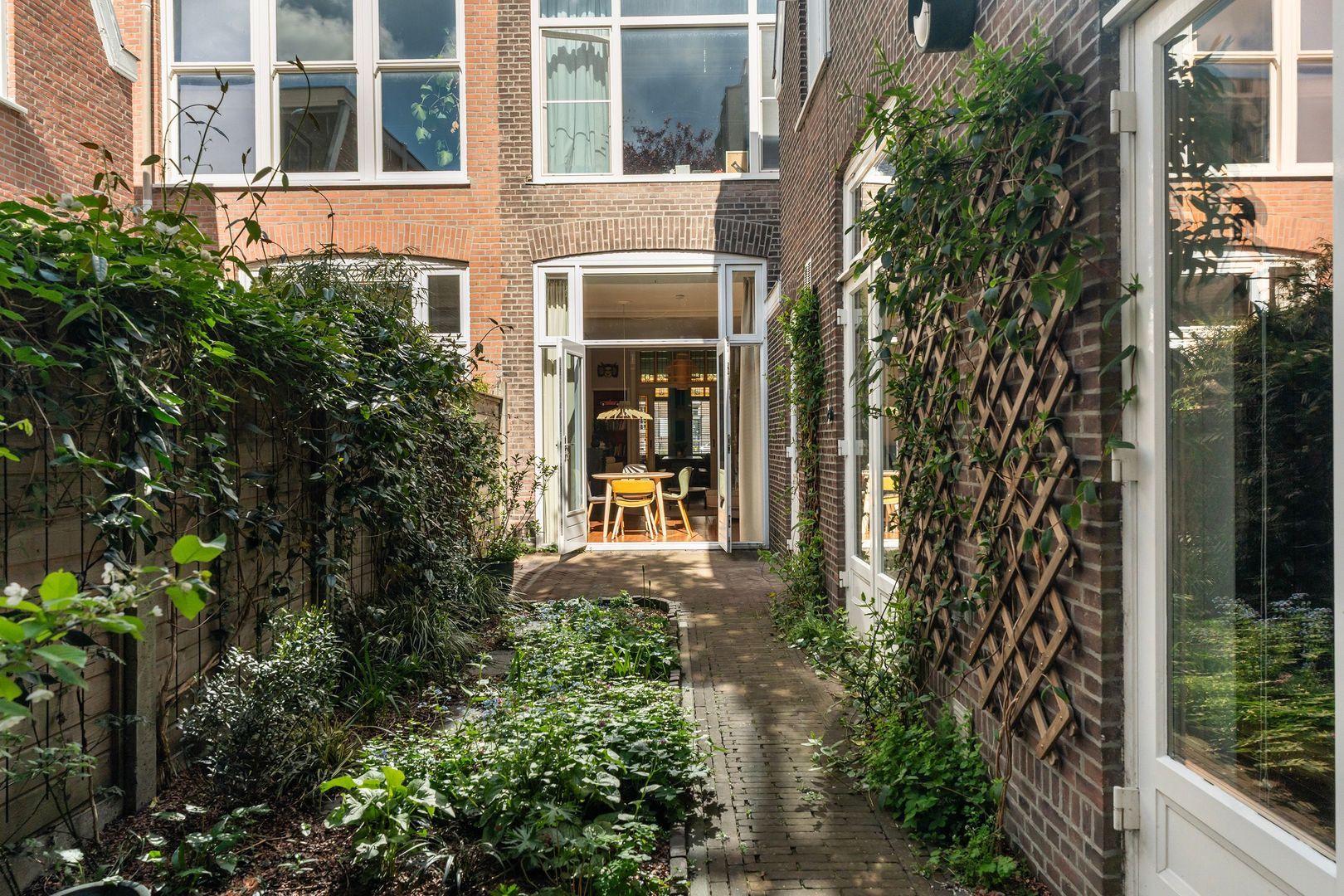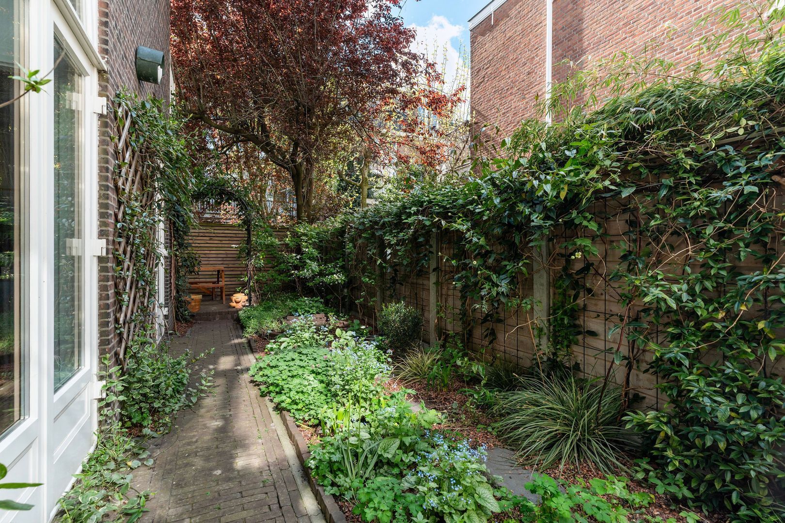 Doorloop naar uitbouw; moderne badkamer voorzien van ligbad, separate douche, wastafelmeubel en tweede toilet; zeer royale (voorheen twee kamers) slaapkamer met kastenwand en openslaande deuren naar de sfeervolle L-vormige achtertuin die op het zuidwesten is georiënteerd.