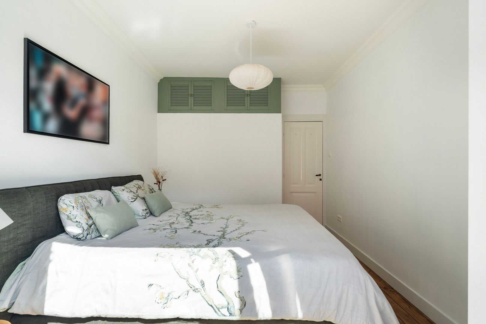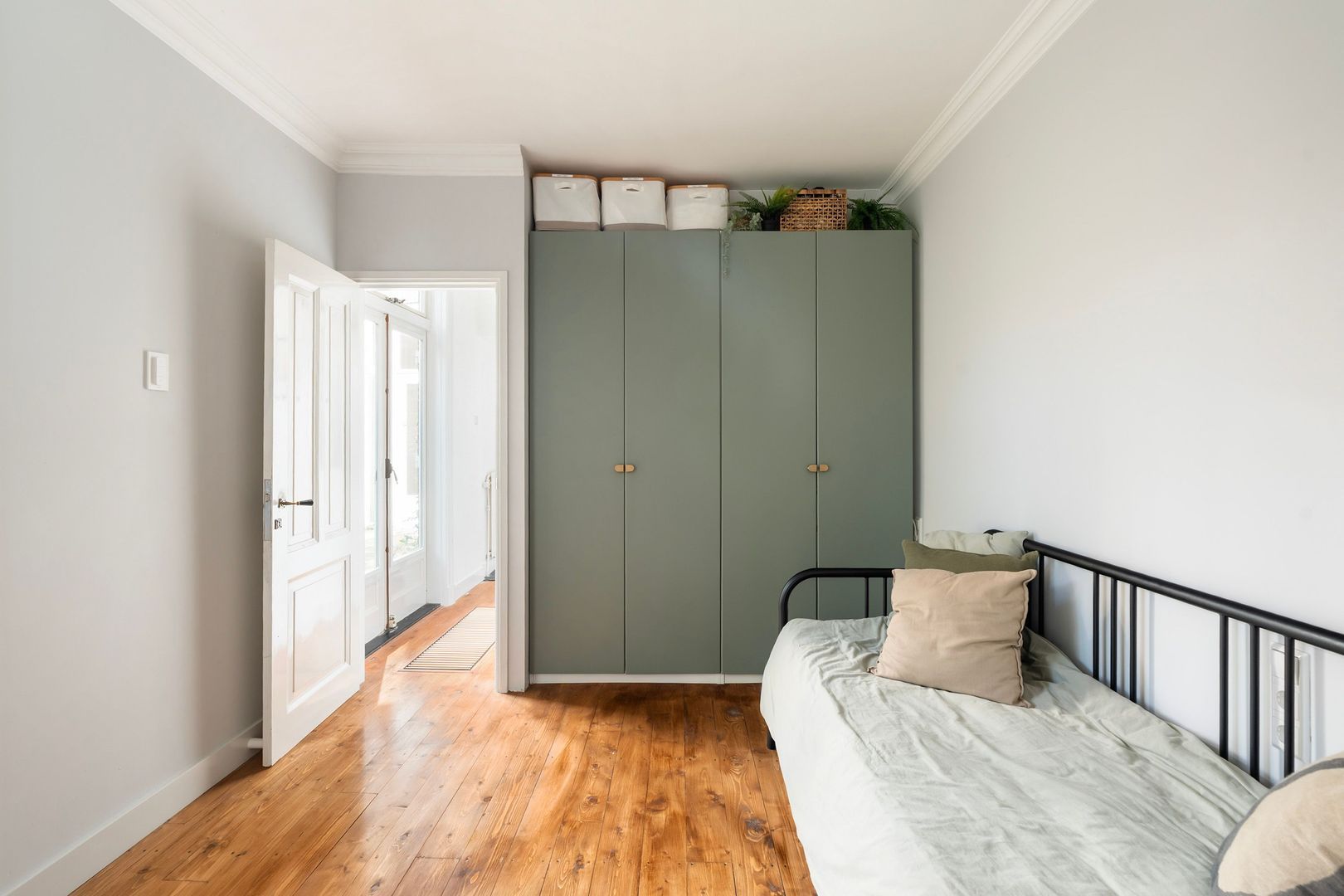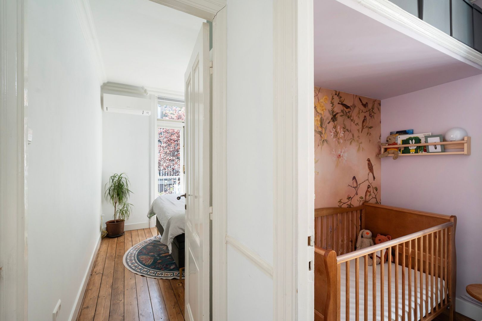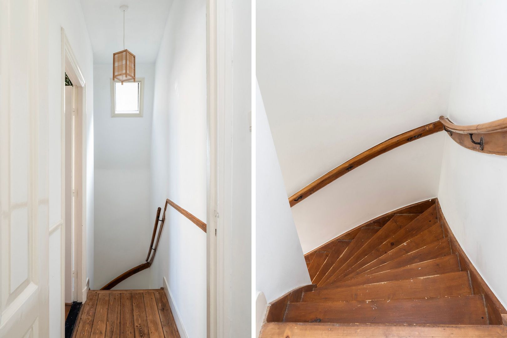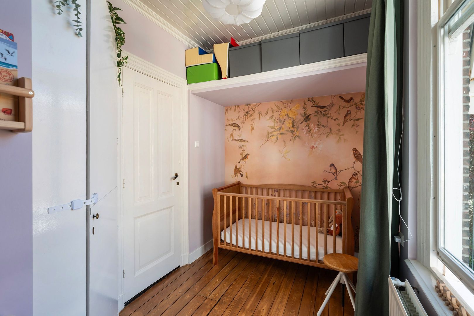 Trap naar de 1e etage: overloop; slaapkamer met een stijlvolle op maat gemaakte bedstee en vaste hoekkast, 2e slaapkamer met openslaande deuren naar het balkon op het zuidwesten.