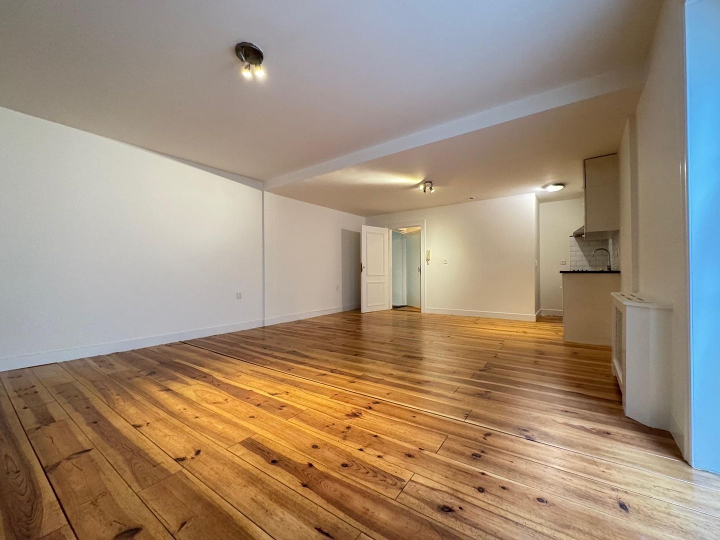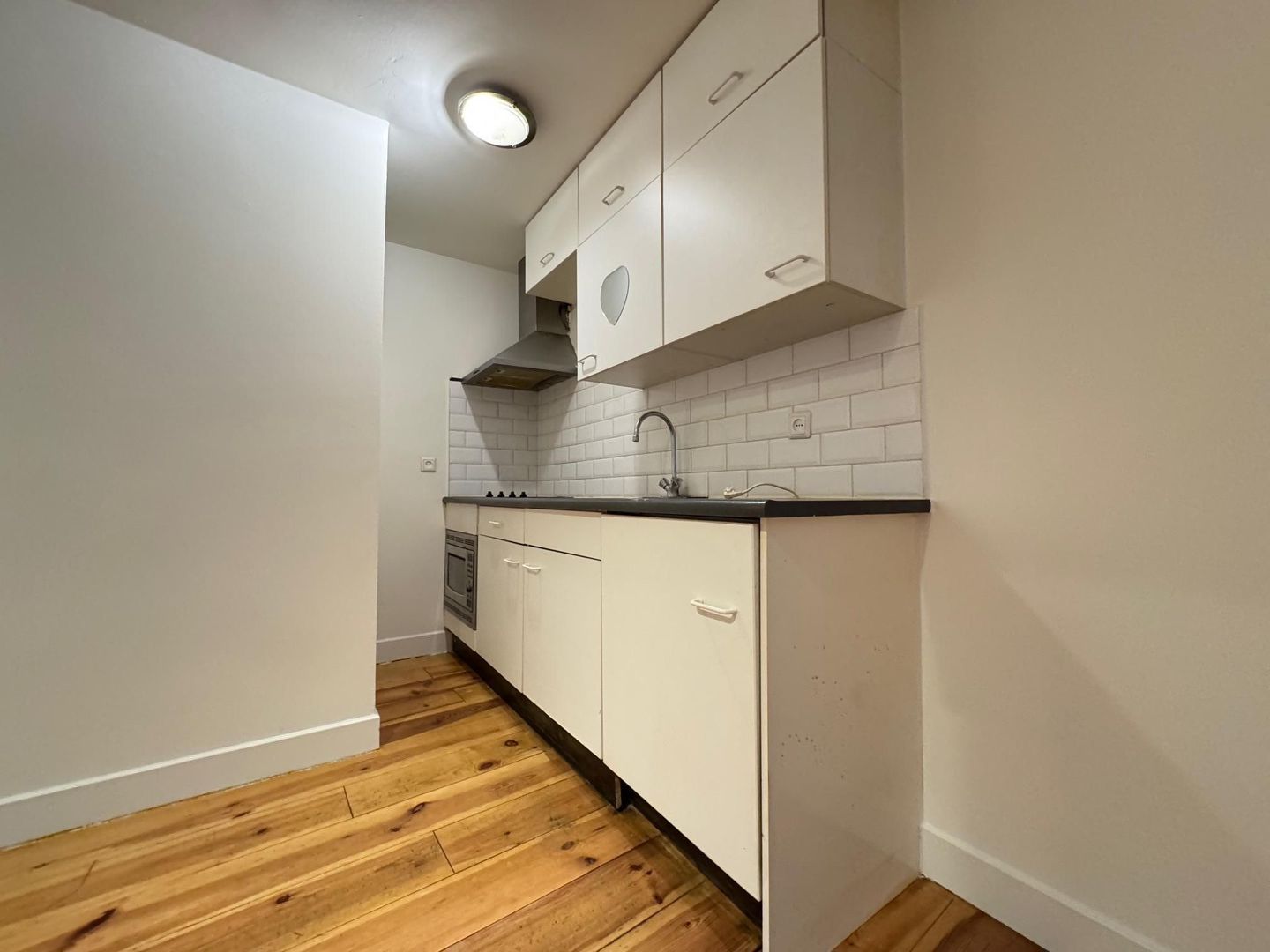 Entree aan de straat; gang naar het trappenhuis; entree woning op de 1e etage; klein halletje; grote woonkamer waar makkelijk een af te scheiden gedeelte te creëren is voor slaapkamer; in de woonkamer gesitueerde nieuwe open keuken met wat apparatuur zoals kookplaat, oven, afzuigkap en koelkast; via het halletje toegang tot de doucheruimte met toilet en wastafeltje.