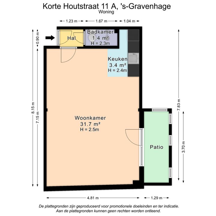 NB De woning heeft een deur naar een plat(buitenruimte) maar deze behoort niet tot het appartementsrecht. Op de plattegrond is deze ruimte slechts opgenomen om de grote hiervan aan te geven.