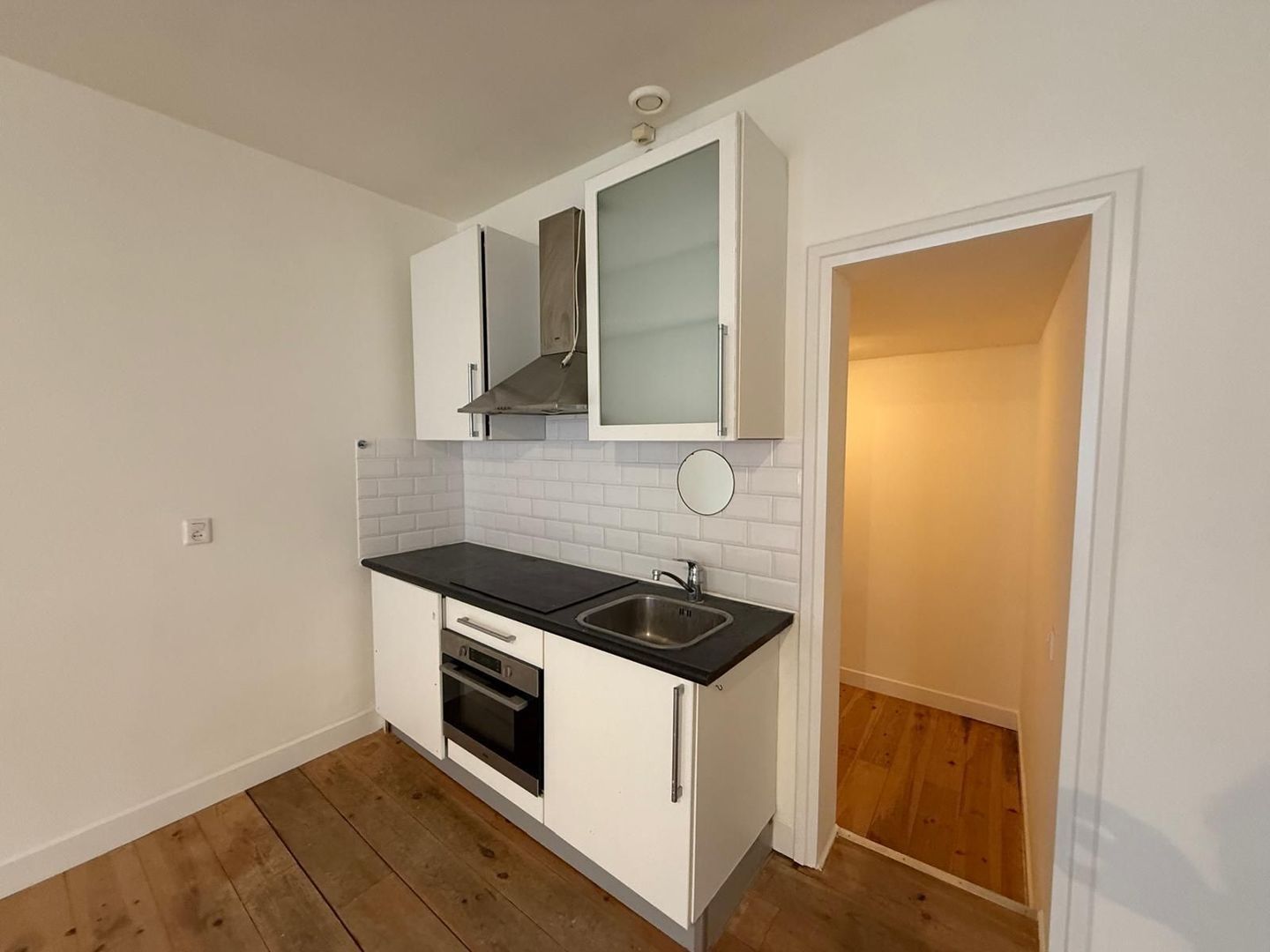Centrale entree aan de straat; steile binnentrap naar de 2e etage; entree woning waarbij je binnenkomt in de hal, de woonkamer met een keurige open keuken en ingebouwde inductiekookplaat, koelkast, oven en afzuigkap; 2 grote raampartijen; via de woonkamer toegang tot de inpandige (slaap)kamer; badkamer met douche, toilet en wastafelmeubel bereikbaar via de hal.