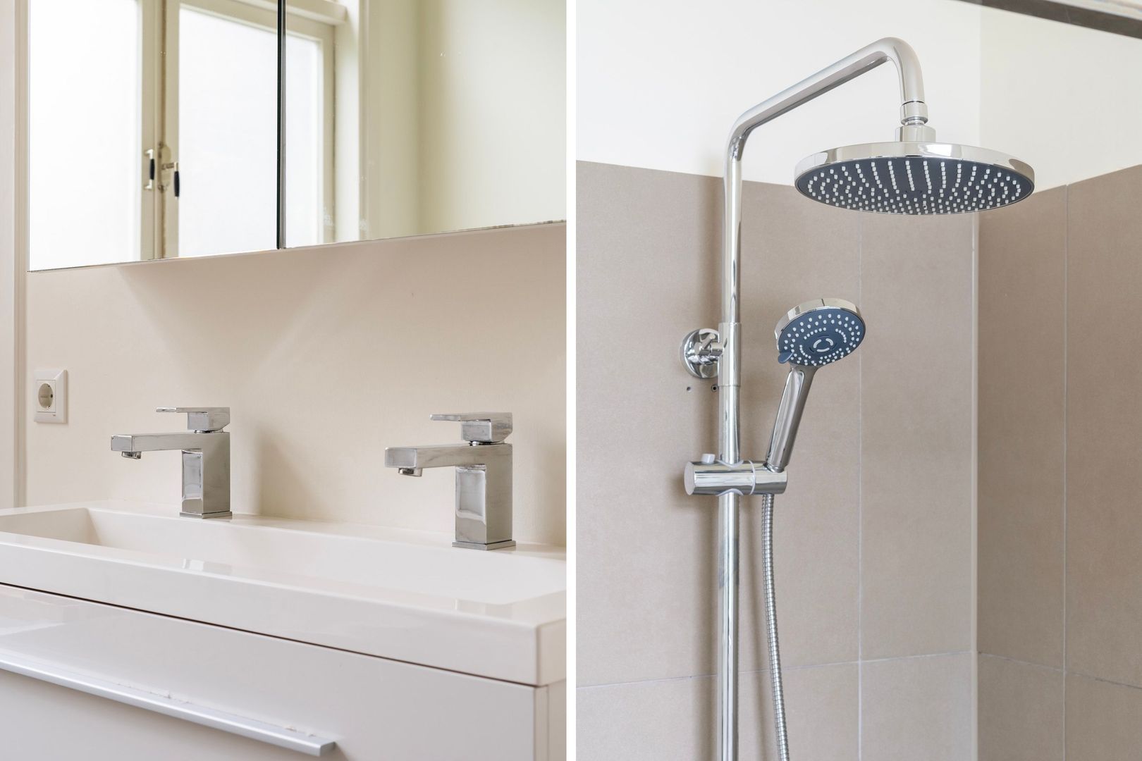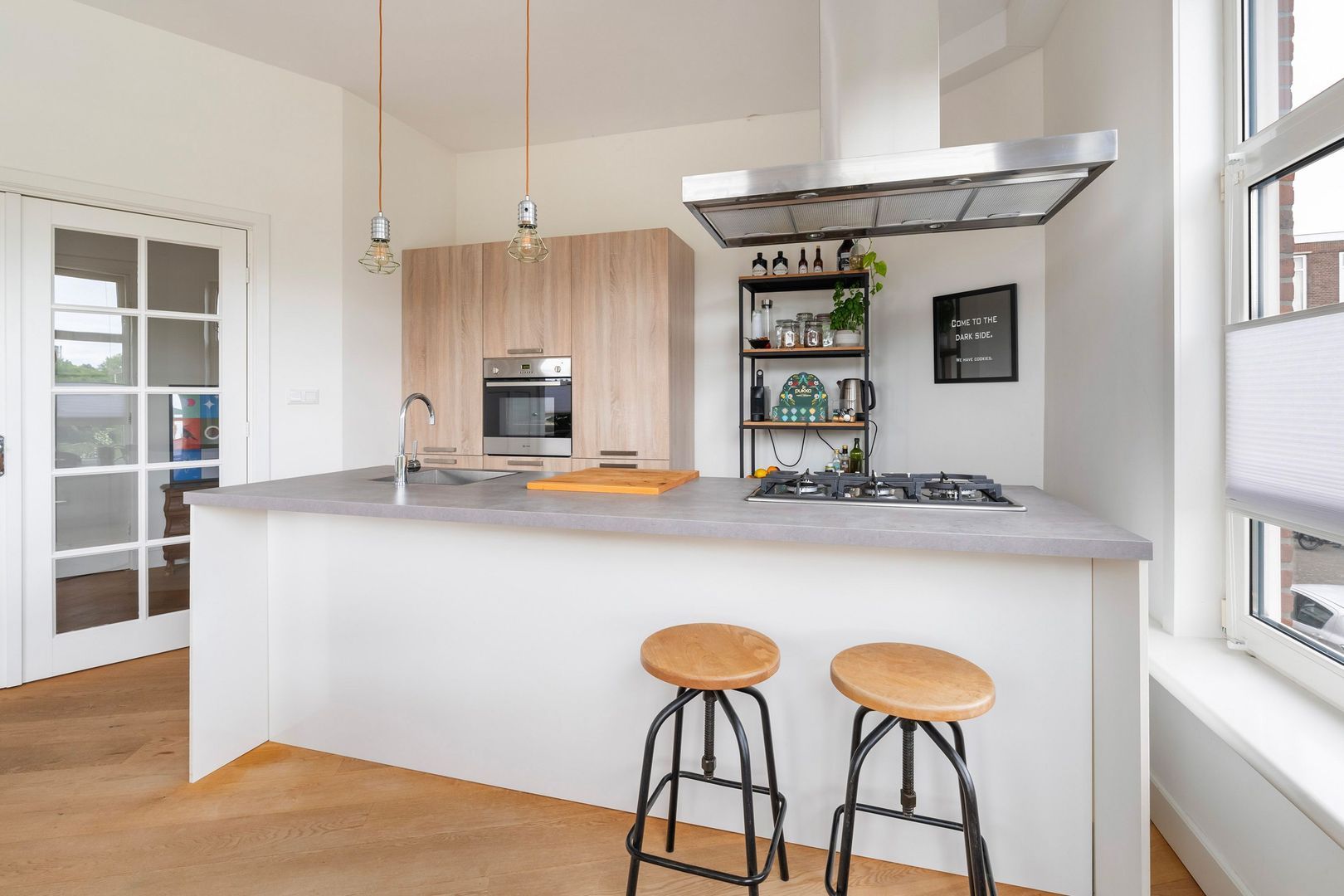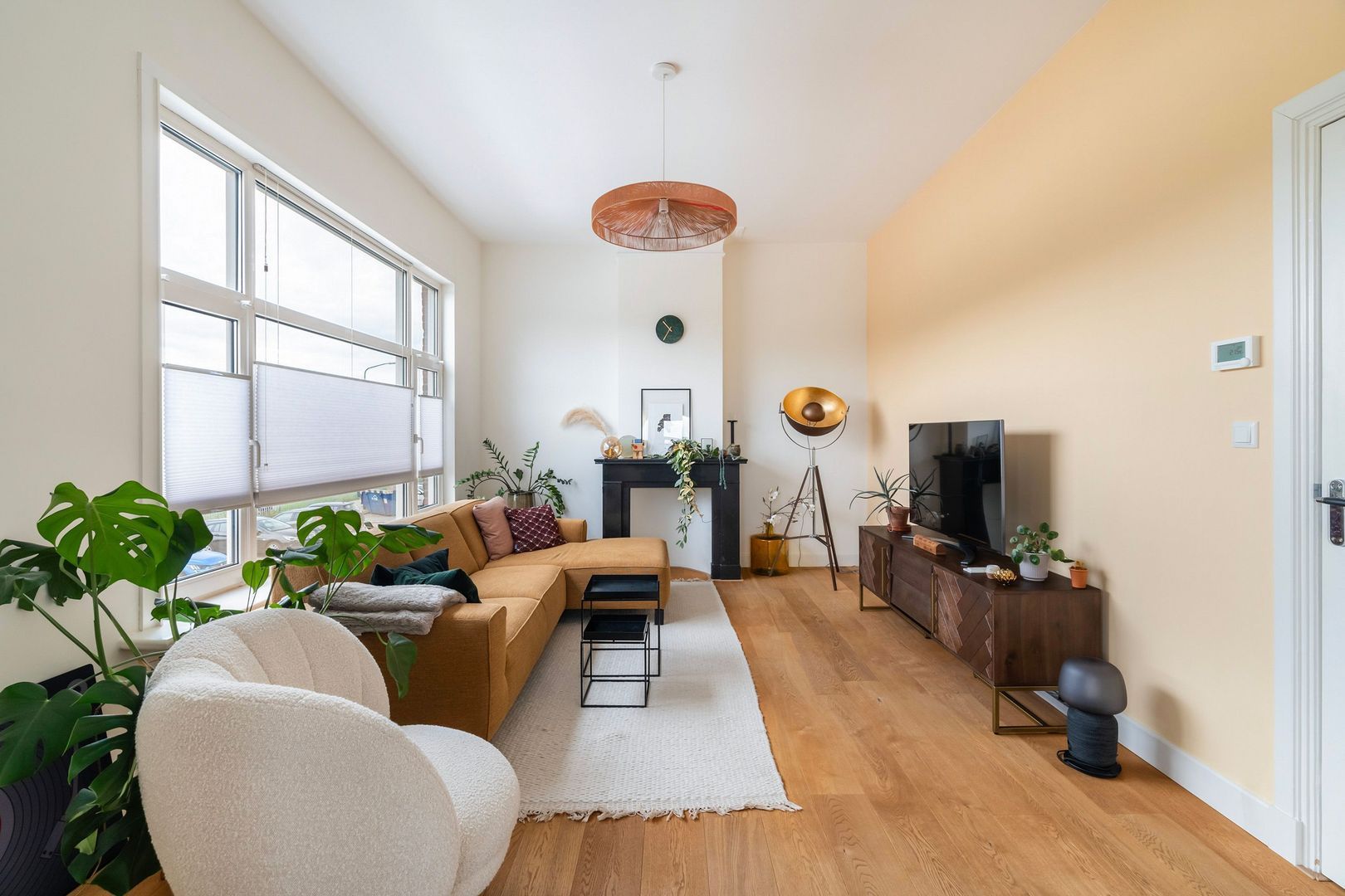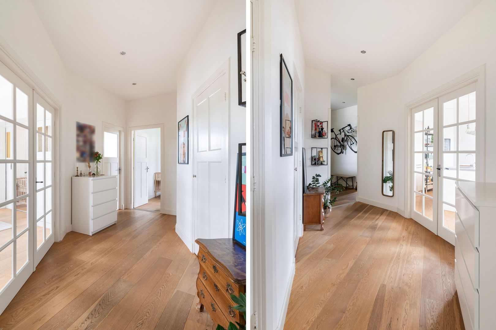 Woningentree via open portiek; hal met meterkast en een grote bergkast; sfeervolle woonkamer en suite met een schuifseparatie, schouwen, vaste kasten een veel lichtinval door de grote raampartijen; moderne open keuken met kookeiland voorzien van een 5-pits gaskookplaat, afzuigkap, koel-vriescombinatie, oven en een vaatwasser; 1e slaapkamer aan de voorzijde; 2e slaapkamer aan de achterzijde met openslaande deuren naar het balkon; moderne ruime badkamer met inloopdouche, ligbad, wastafelmeubel en toegang tot de wasruimte met de aansluiting voor de wasmachine en droger; modern separaat toilet met fonteintje;