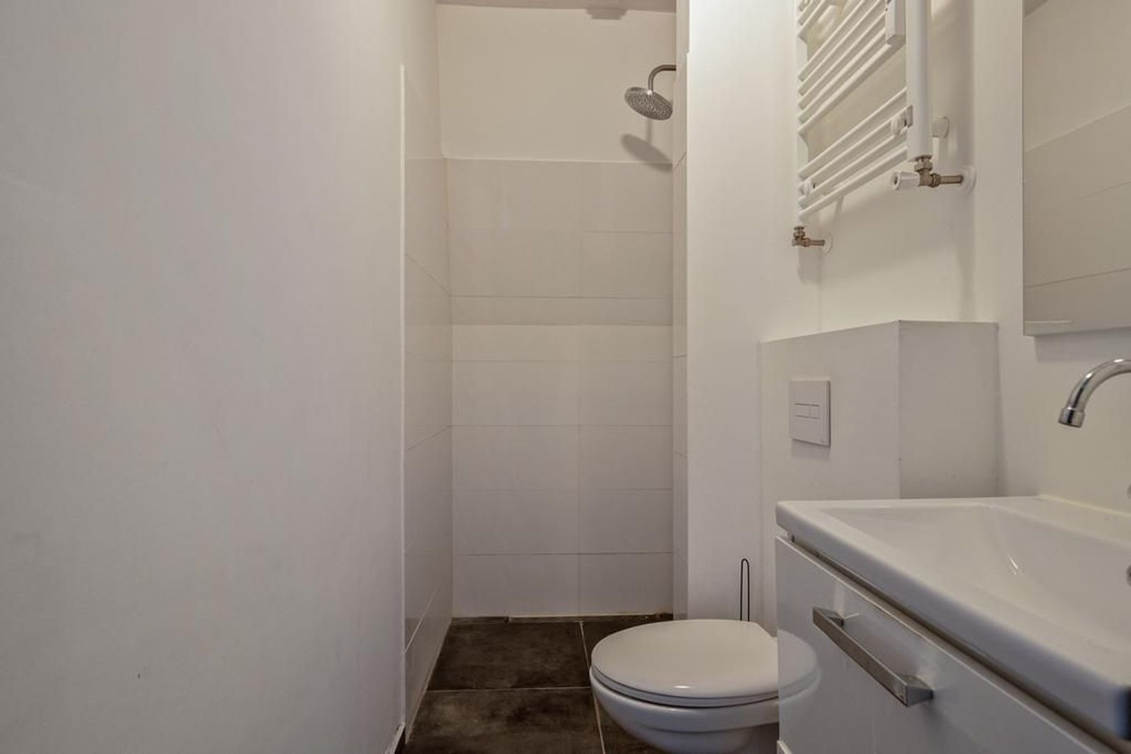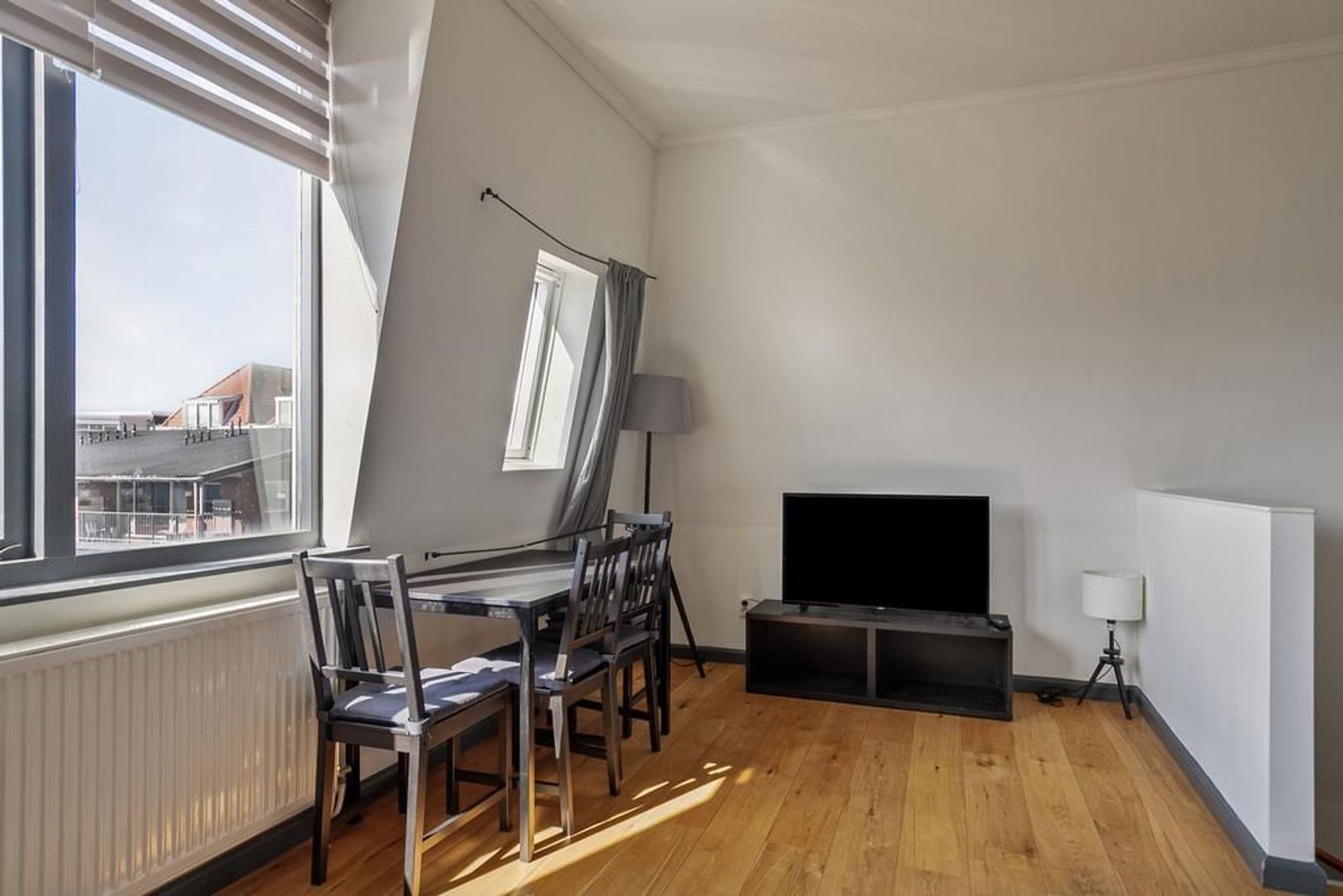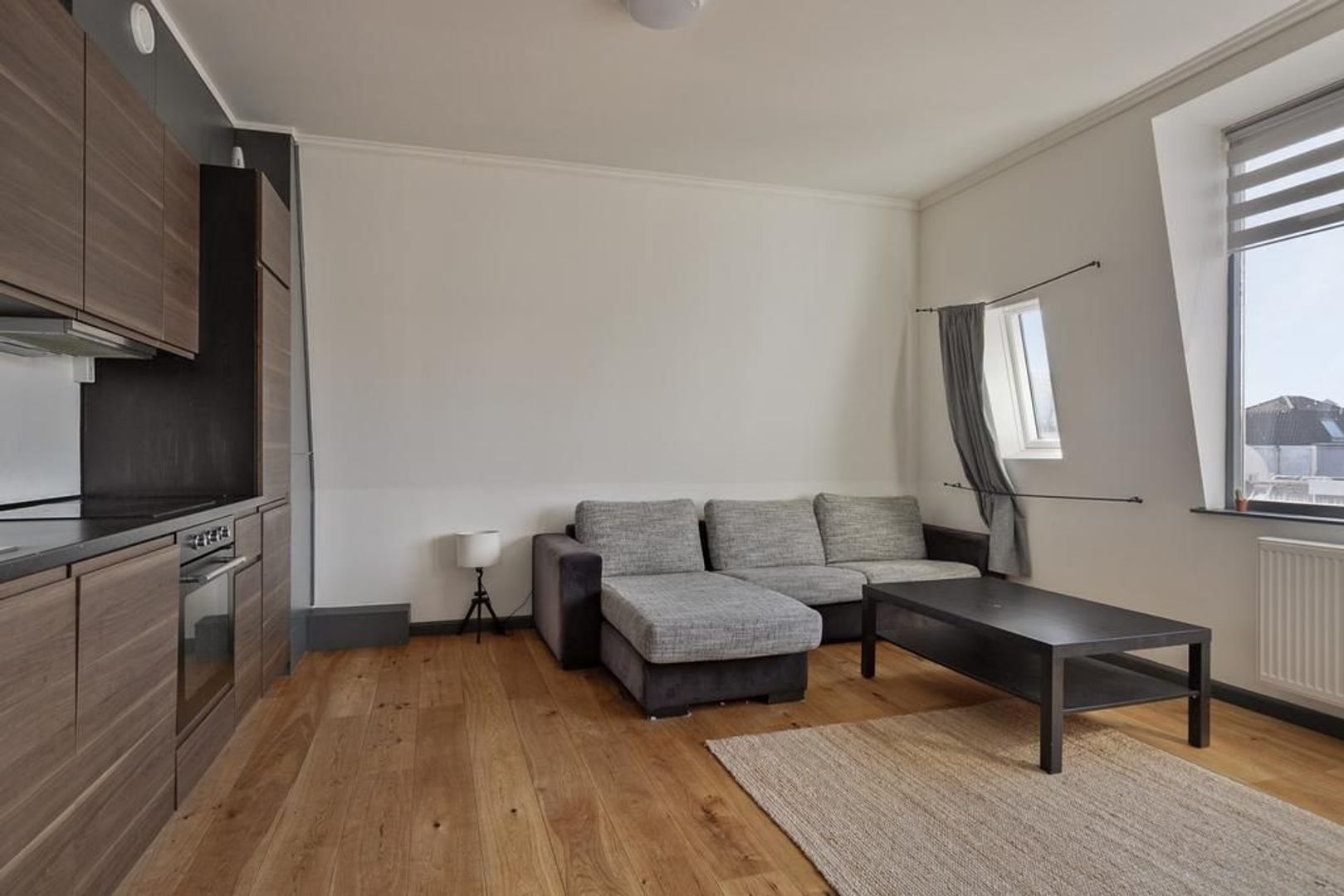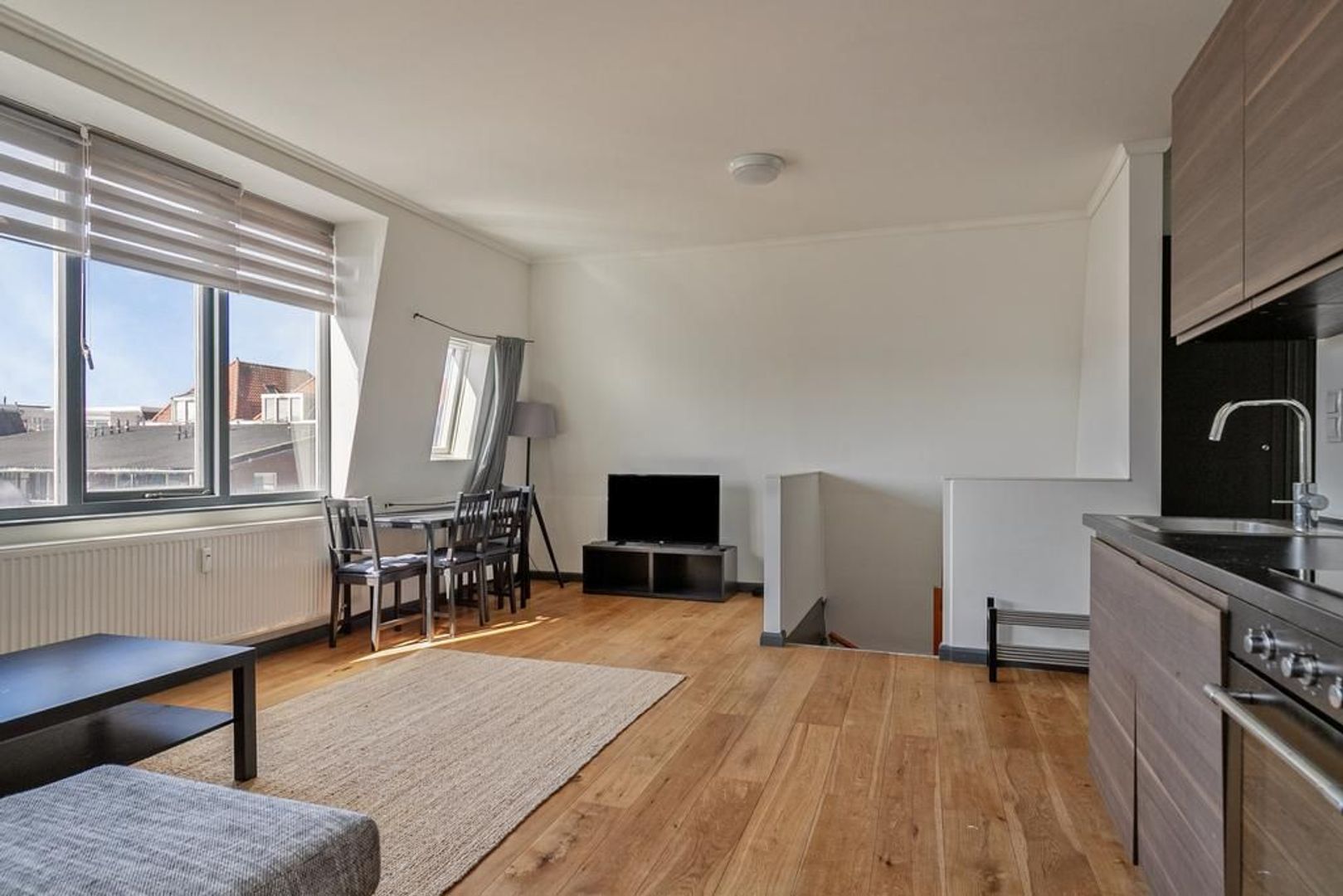 Centraal entree aan de straat; binnenhal met trap naar de 1e etage; entree woning met binnen halletje en trap naar de woonetage waar je direct de woonkamer binnenloopt woonkamer ca. 6.24x4.76 met een open keuken en ingebouwde inductie kookplaat; koelkast, afzuigkap, oven de woonkamer beschikt over een op het Zuid-Westen georiënteerde dakkapel en 2 dakramen waardoor de ruimte erg licht is. Overloop met ruimte voor de wasmachine en de drogen en een aparte ruimte voor de cv-ketel; 2 goede slaapkamers aan de voorzijde respectievelijk ca. 3.66x3.24 en 3.46x2.67; badkamer met douche, toilet en wastafelmeubel.