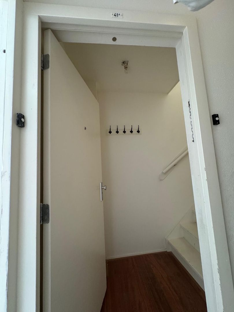 Centraal entree aan de straat; binnentrap naar de 1e etage; entree woning met trap naar de 2e etage; overloop; woonkamer over de volle lengte met aan de achterzijde de open keuken en diverse ingebouwde apparatuur Via de woonkamer aan de voorzijde toegang tot de slaapkamer via de hal toegang tot de badkamer met douche, toilet en wastafelmeubel.