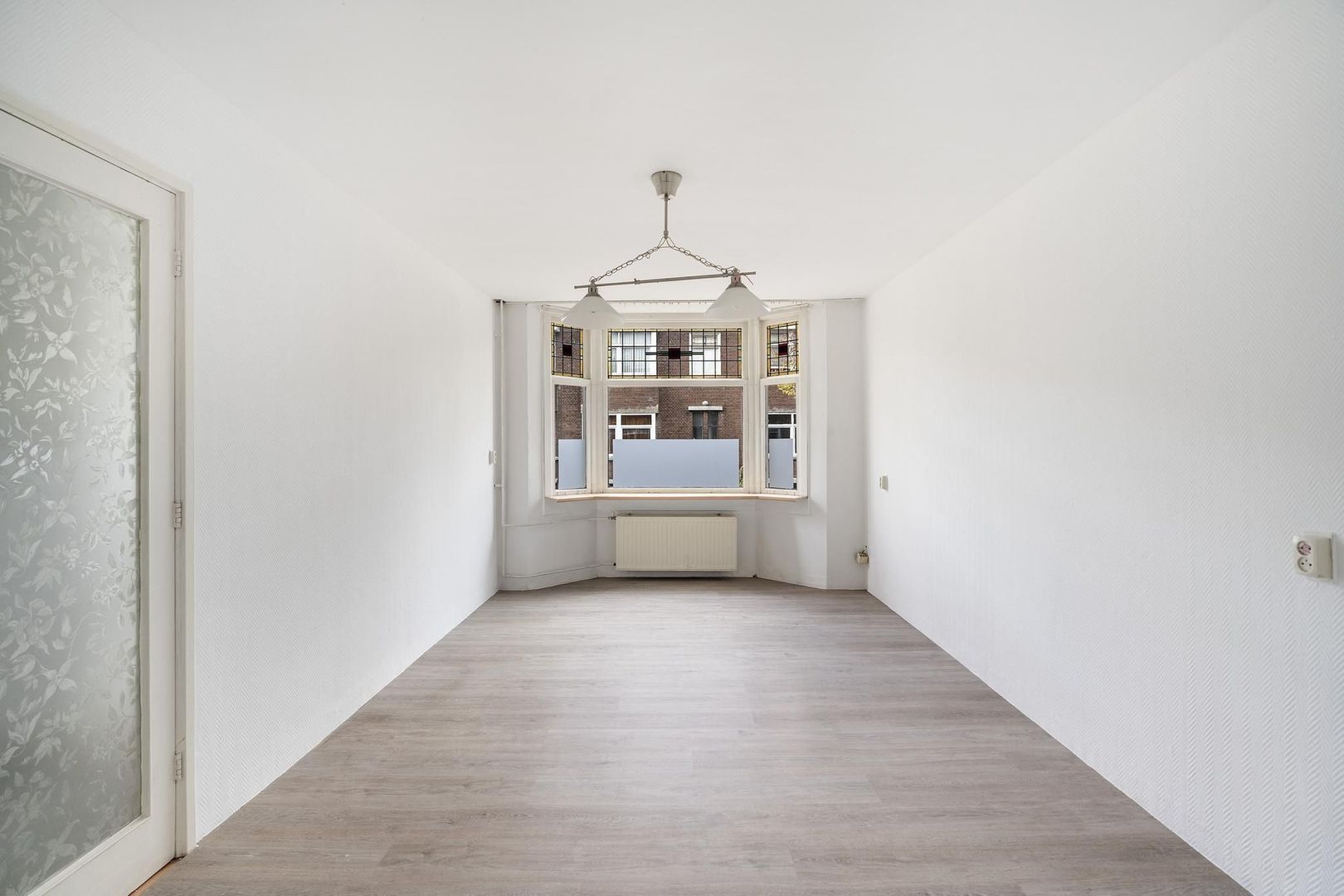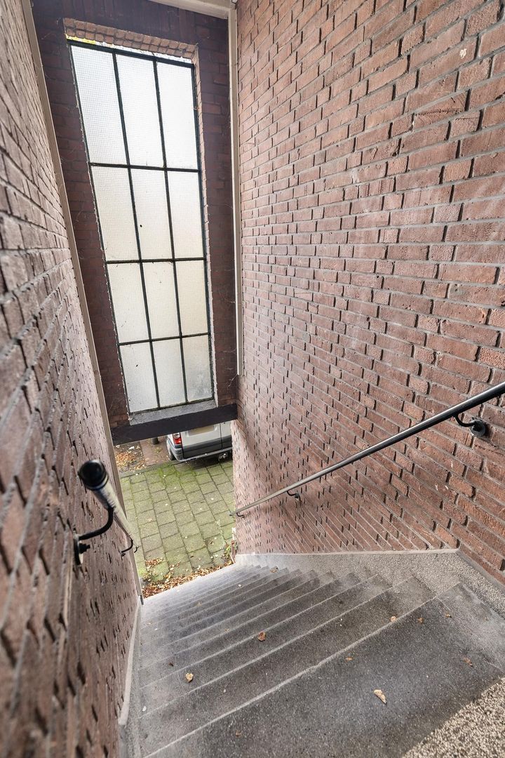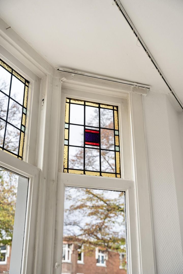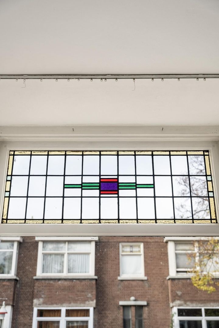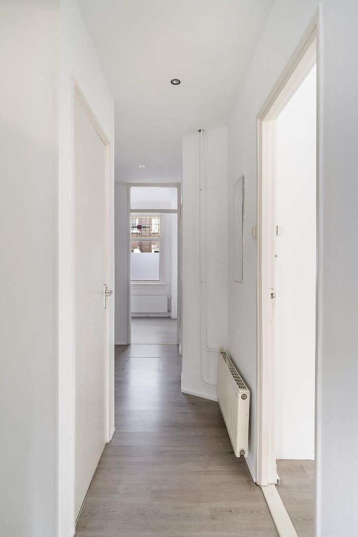 Woningentree via open portiek; gang met meterkast; ruime woonkamer met erker en ramen voorzien van sfeervol glas in lood; eenvoudige keuken met bijkeuken alwaar de eetruimte zich bevindt met openslaande deuren naar het achterbalkon; 1e slaapkamer aan de voorzijde; 2e slaapkamer aan de achterzijde met openslaande deuren naar het balkon; grote badkamer met douche, wastafelmeubel en de aansluiting van de wasmachine; net separaat toilet;