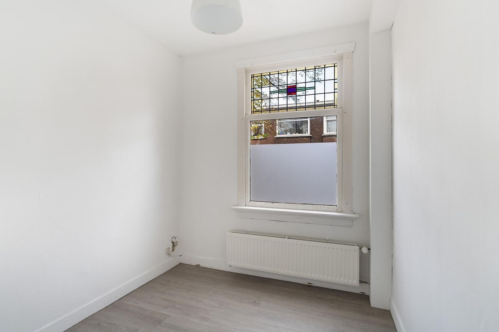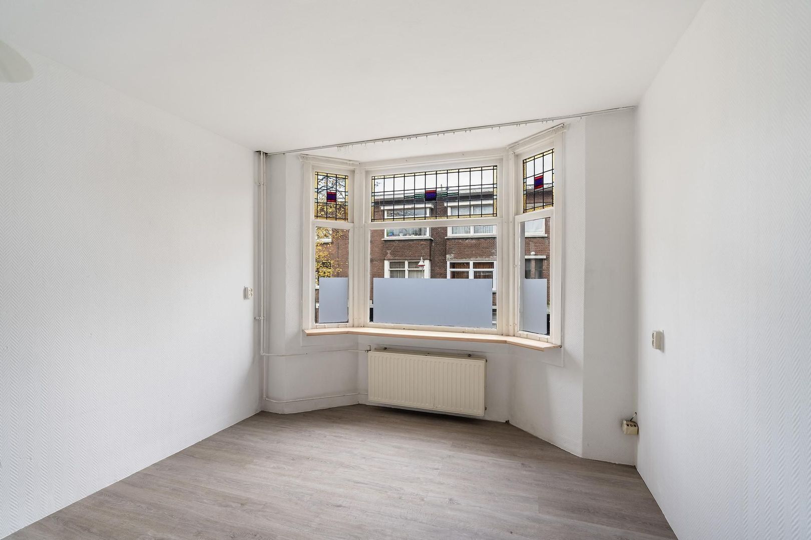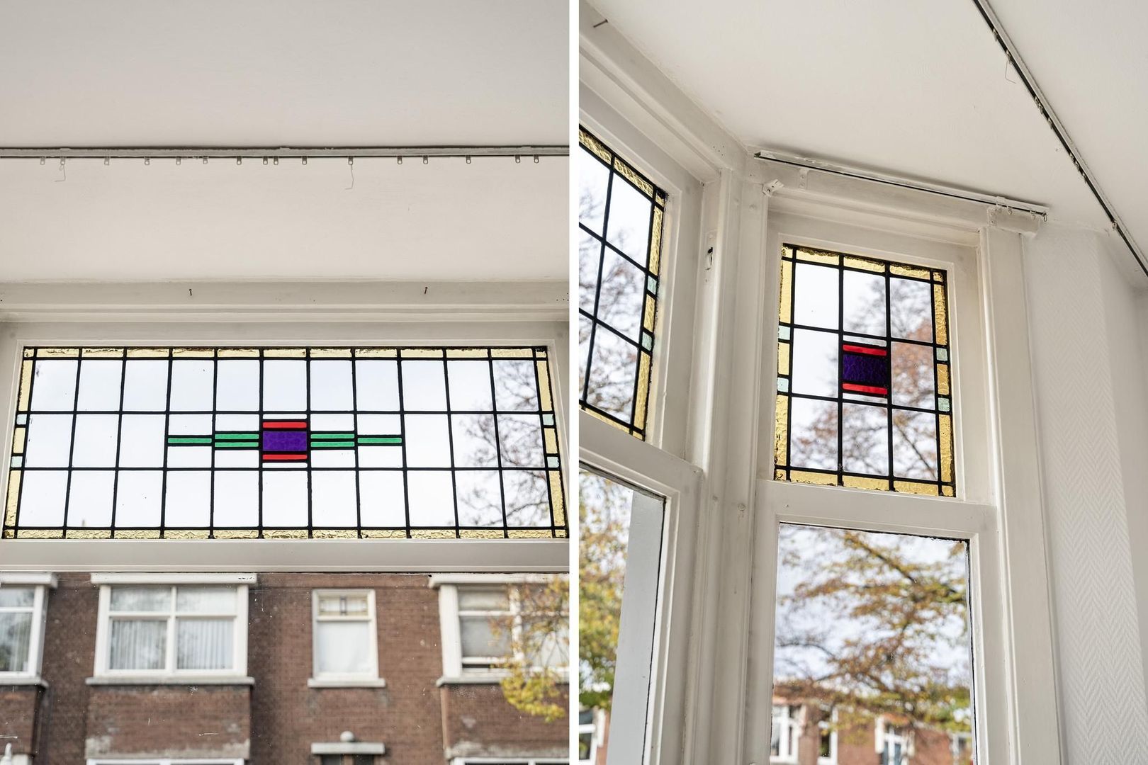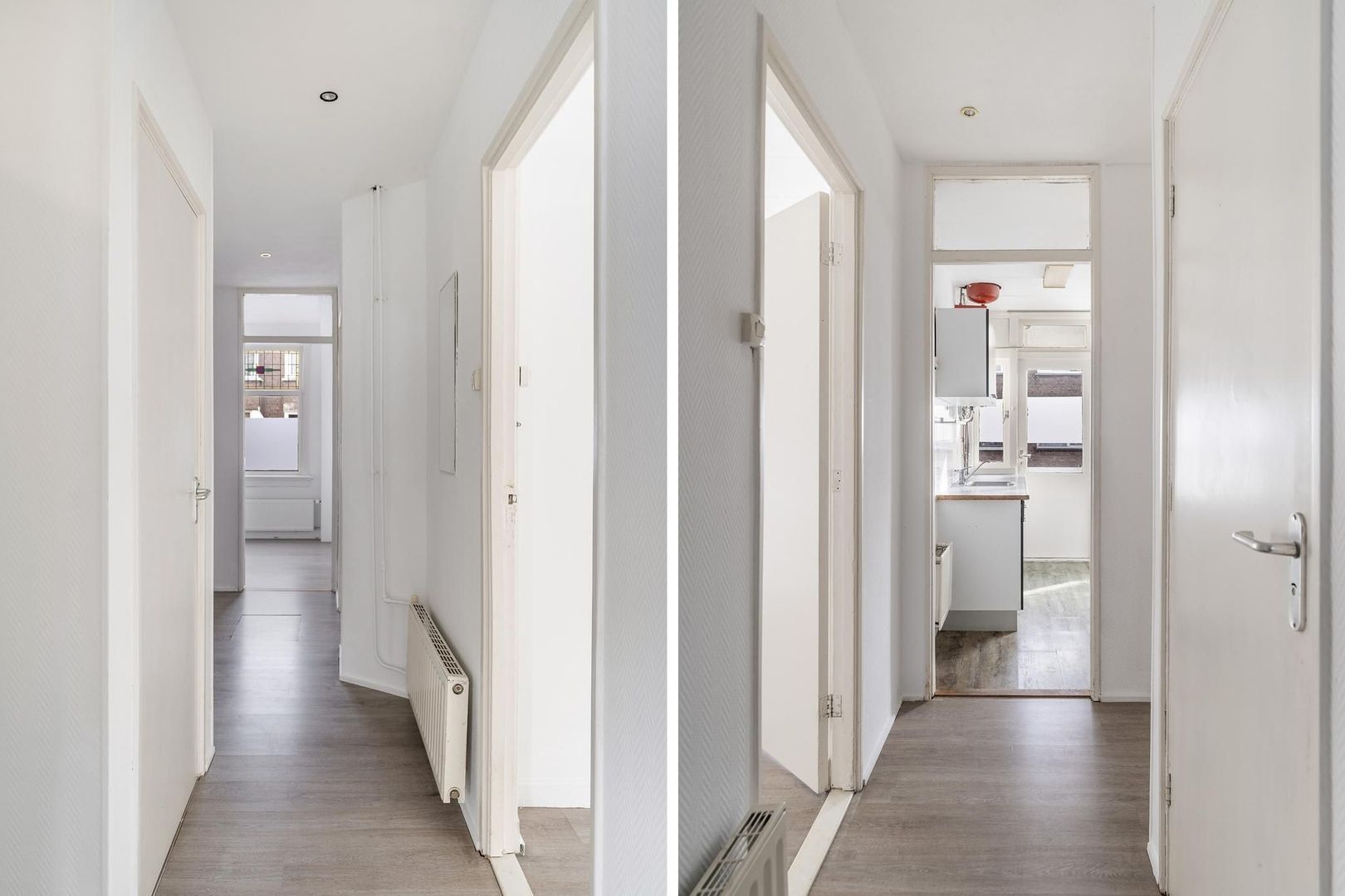 Woningentree via open portiek; gang met meterkast; ruime woonkamer met erker en ramen voorzien van sfeervol glas in lood; eenvoudige keuken met bijkeuken alwaar de eetruimte zich bevindt met openslaande deuren naar het achterbalkon; 1e slaapkamer aan de voorzijde; 2e slaapkamer aan de achterzijde met openslaande deuren naar het balkon; grote badkamer met douche, wastafelmeubel en de aansluiting van de wasmachine; net separaat toilet;