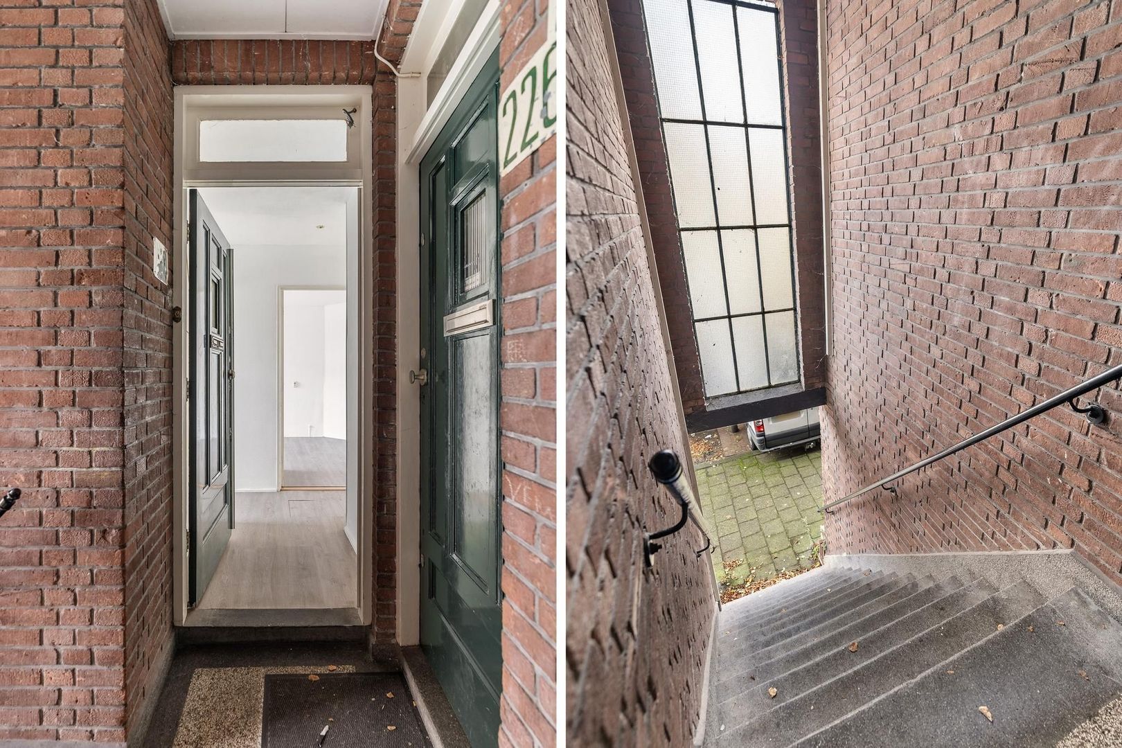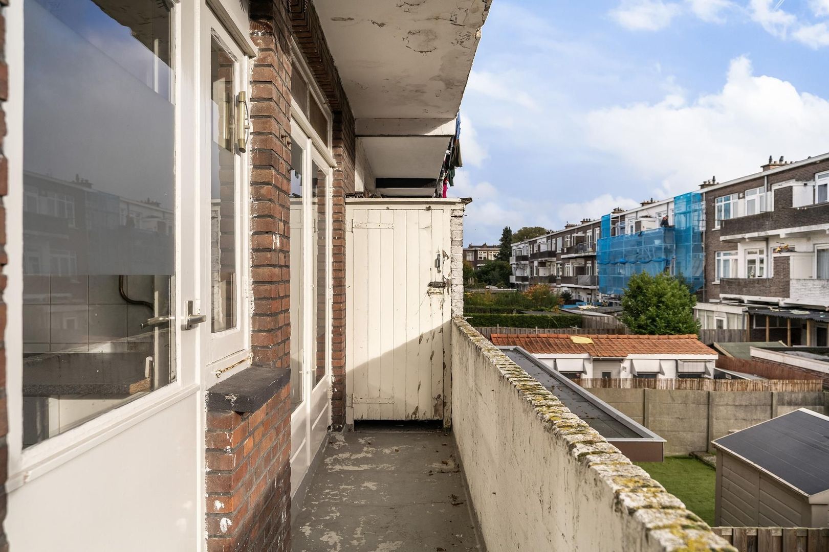 - Voorzijde voorzien van houten kozijnen met enkel glas