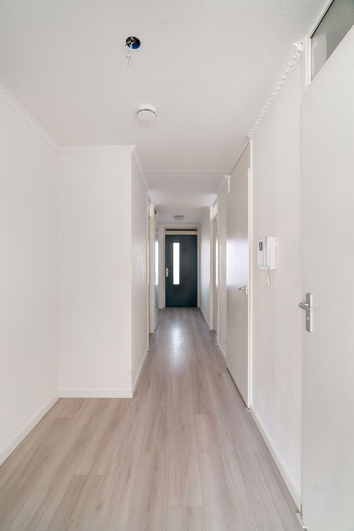 Tweede etage: entree woning; hal met meterkast; vaste kast met opstelplaats cv-ketel; toilet met fonteinmeubel. Vanuit de hal bereik je de ruime woonkamer met veel lichtinval en naar binnen openslaande deuren met Frans balkon, L-vormige nette witte open keuken, die is voorzien van diverse inbouwapparatuur, zoals een gaskookplaat, Rvs afzuigschouw, oven, vaatwasser en koelkast en vriezer; grote slaapkamer aan de galerijzijde van de woning; 2e slaapkamer aan de galerijzijde van de woning; ruime badkamer met douche, wastafelmeubel en wasmachine aansluiting.