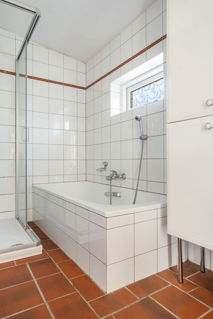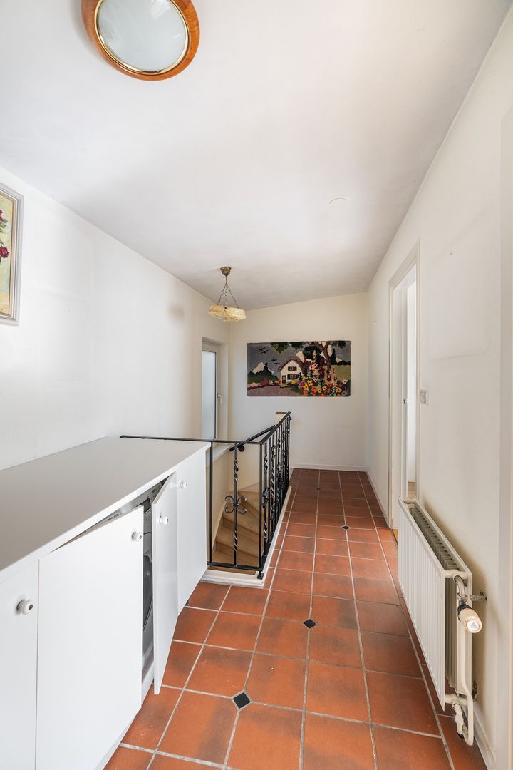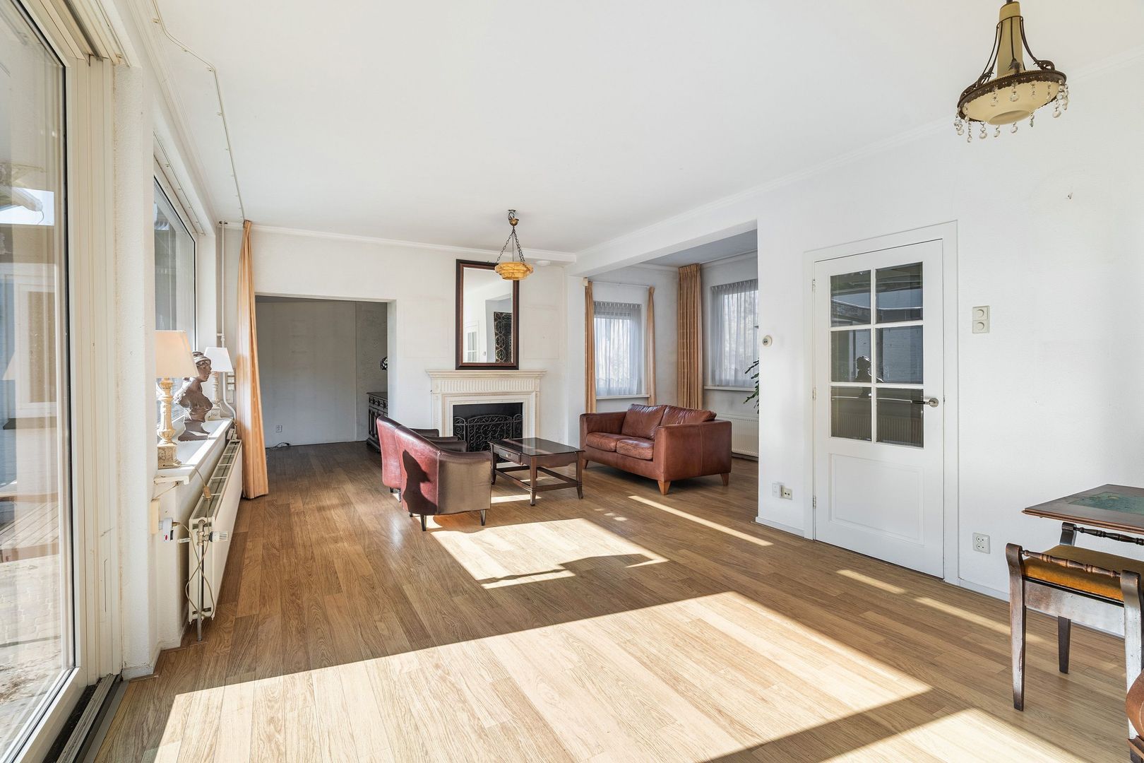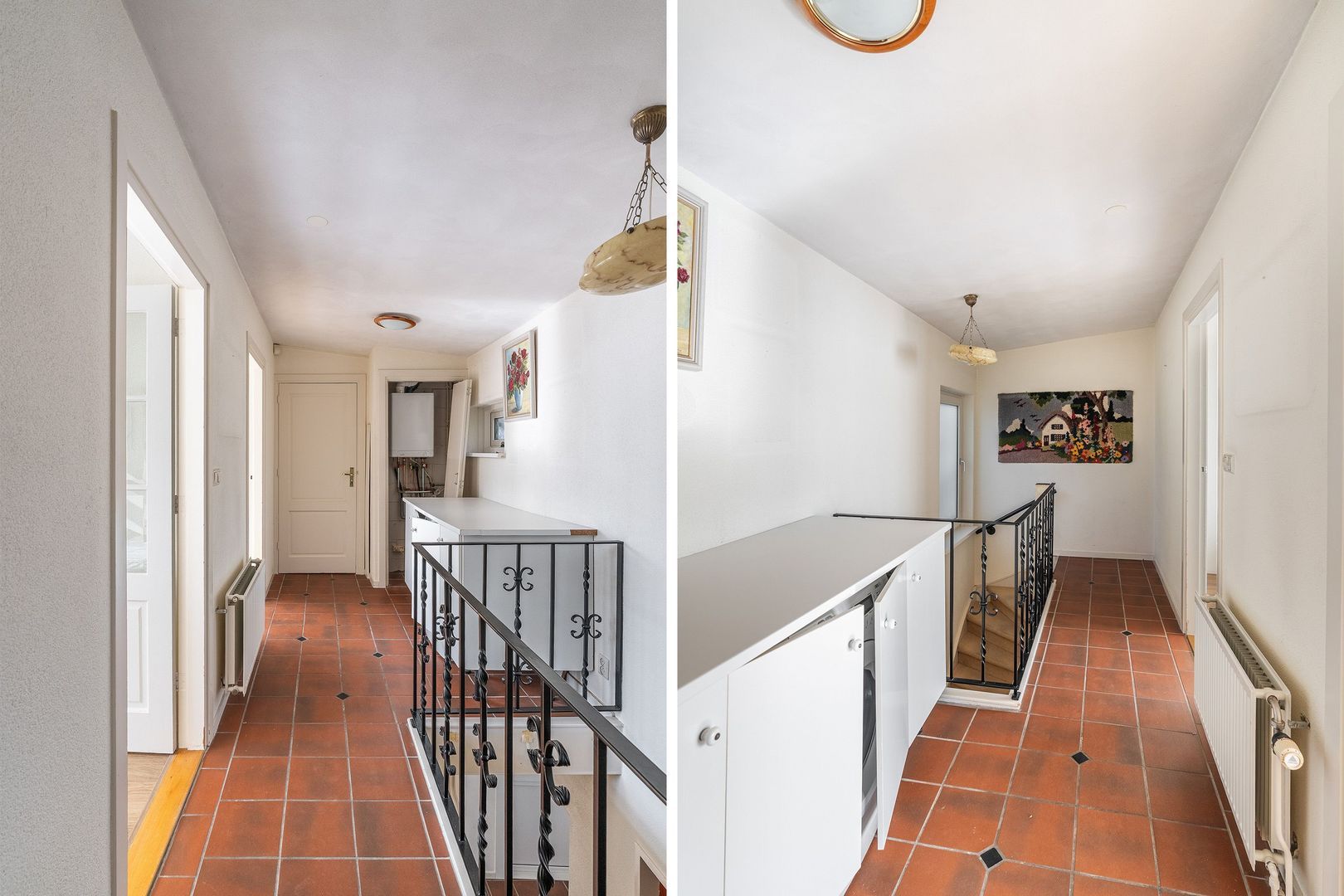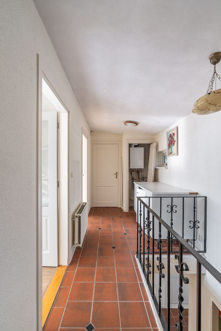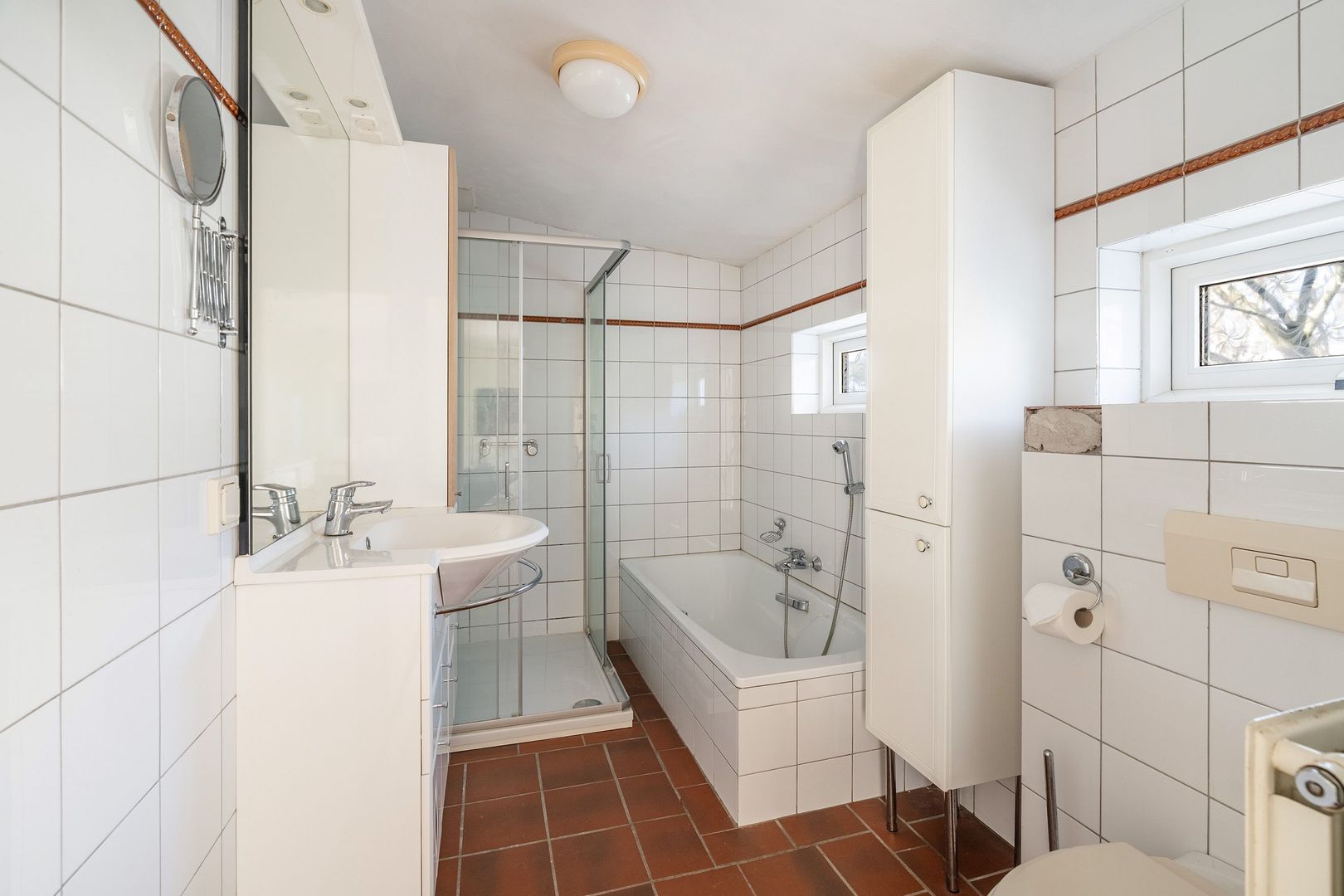 Via de gang trap naar de etage, overloop met kast en cv-ketel opstelling; oorspronkelijk 3 slaapkamers aan de tuinzijde die nu zijn omgebouwd tot een zeer royale hoofdslaapkamer met kastenwand en toegang tot balkon en een 2e goede slaapkamer met toegang tot het balkon. Badkamer met ligbad, douche, wastafelmeubel en 2e toilet. Het balkon loopt over de volle breedte van de etage.