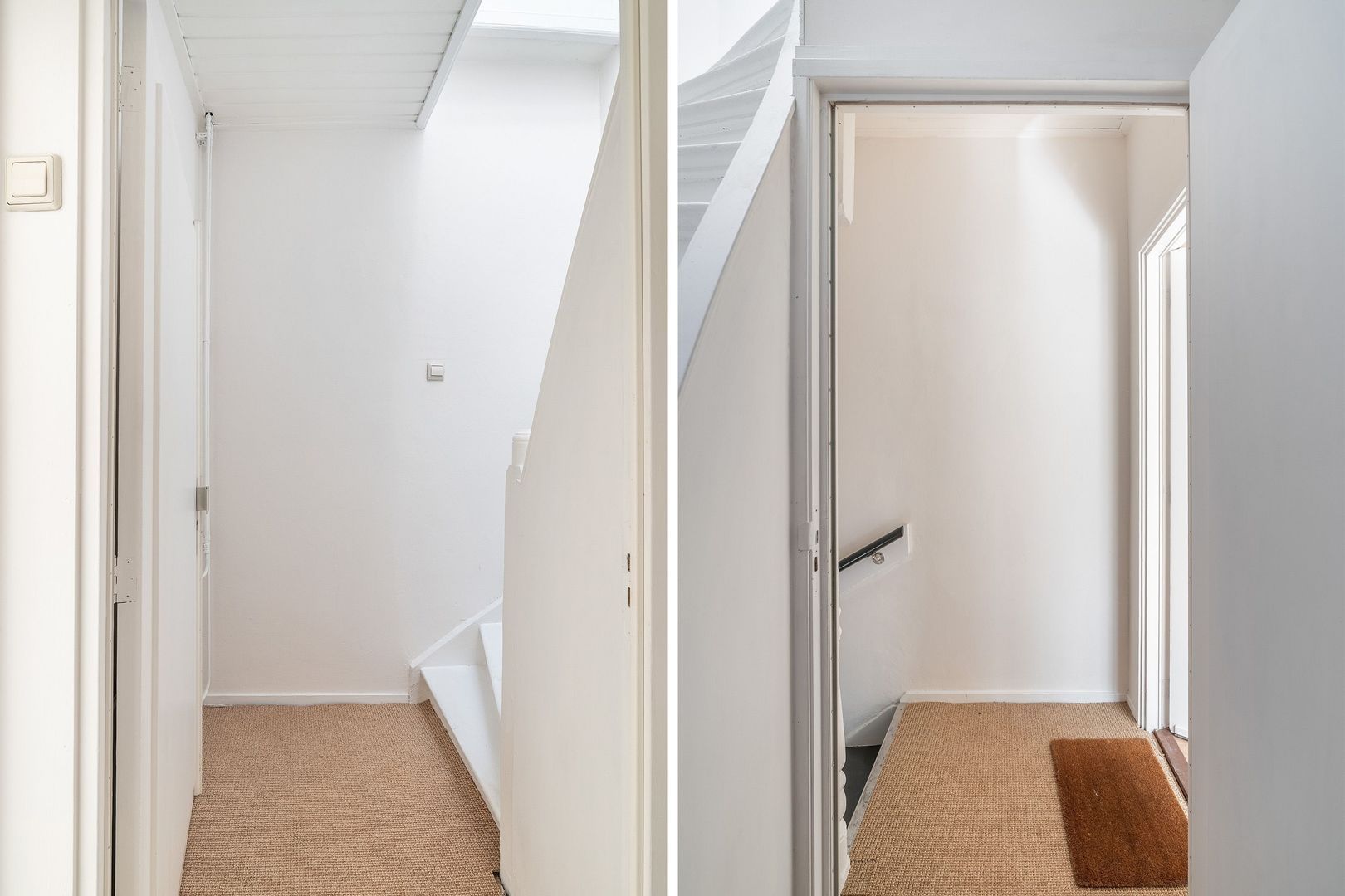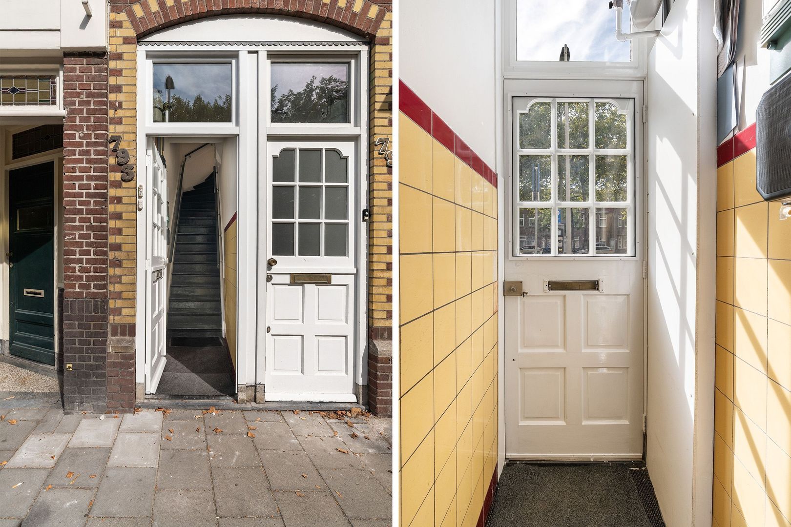 Entree op staatniveau; binnentrap naar 1e etage; overloop : entree appartement van de 1e etage;