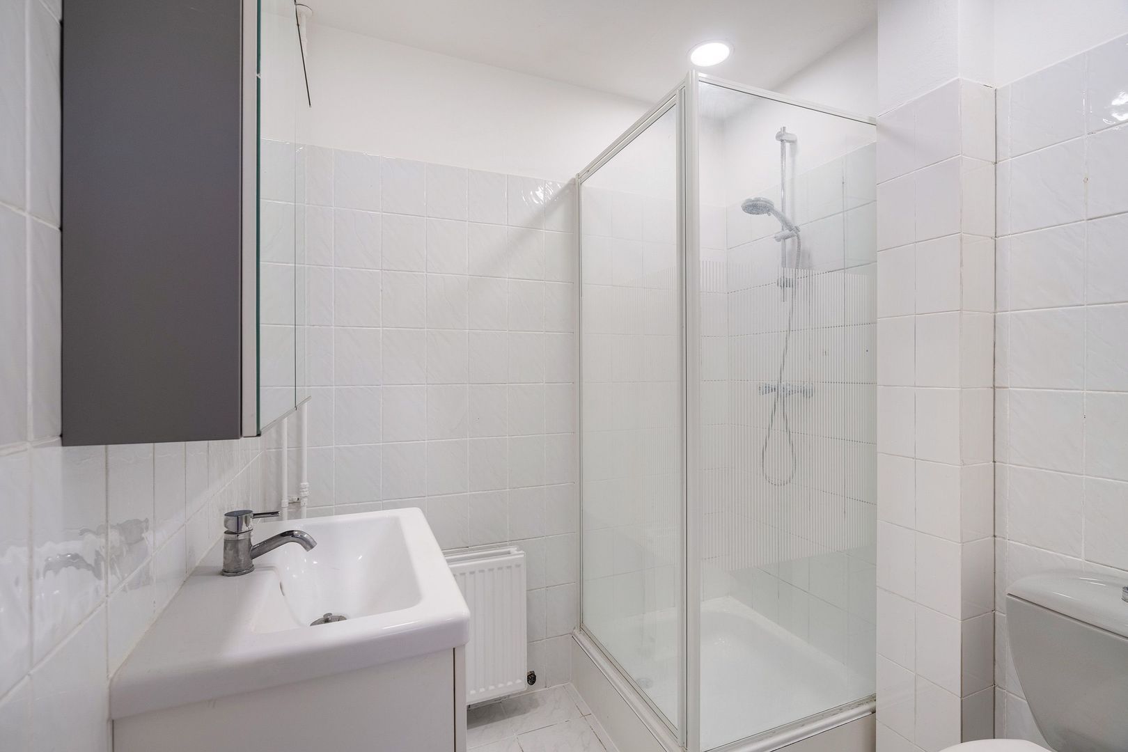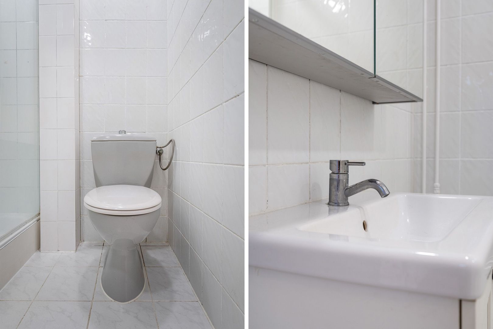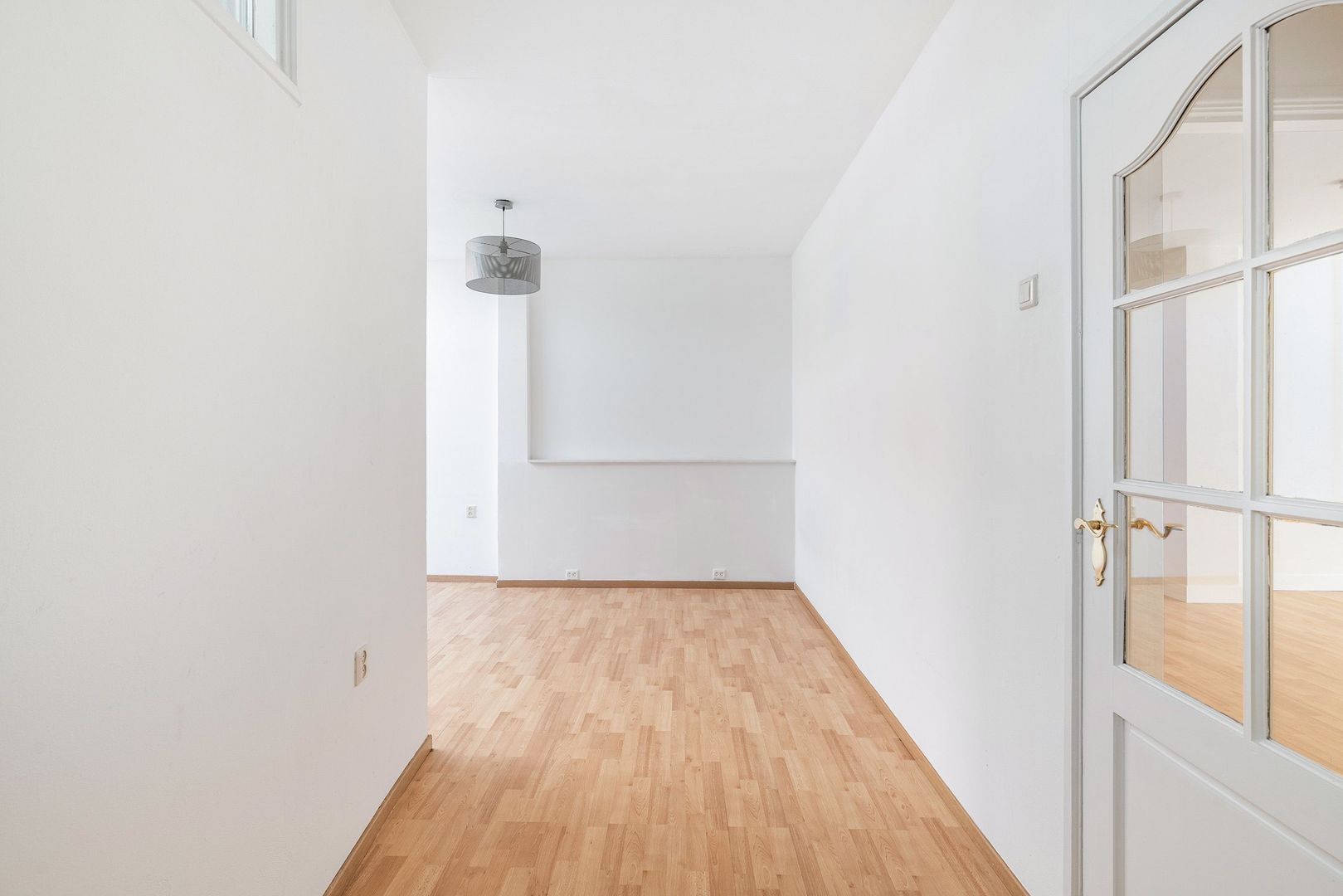 Appartement 1: halletje; royale woonkamer met eenvoudige open keuken aan de voorzijde en openslaande deuren naar het voorbalkon; tussenhalletje op opstelplaats voor wasmachine; via dit tussenhalletje toegang tot de L-vormige achterkamer; eveneens via tussenhalletje toegang tot badkamerruimte met douche, wastafelmeubel en toilet.