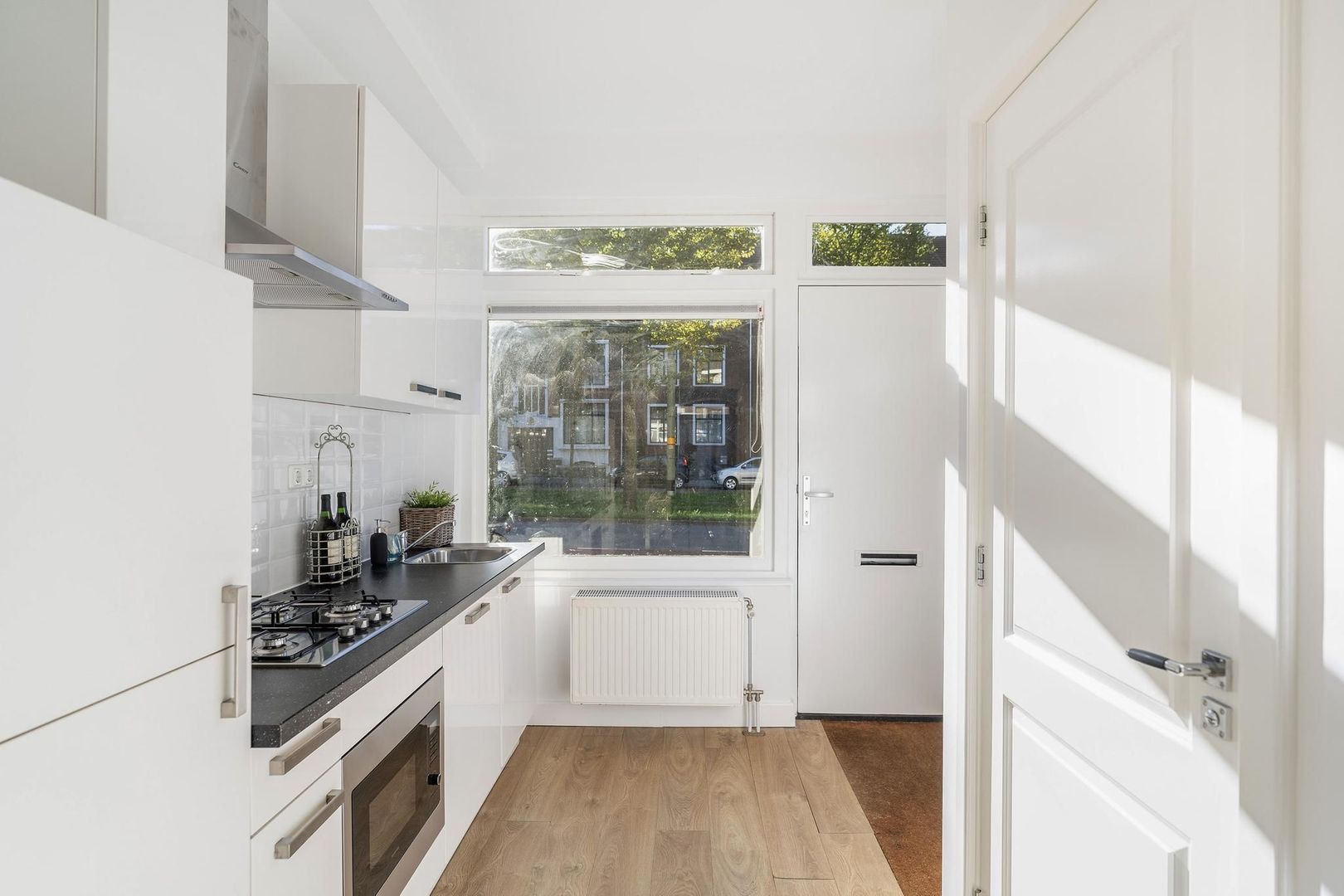 woon-/eetkamer ca. 6.40x3.01; open keuken voorzien van een inductiekookplaat, afzuigkap, combi-oven, koelkast, vriezer en vaatwasser; mogelijkheid tot een slaapkamer of woonkamer aan de achterzijde ca. 5.58x2.81 met toegang tot de ruime en zonnige tuin ca.5.28x2.99 ; luxe badkamer ca. 2.28x0.89 voorzien van inloopdouche en wastafelmeubel; separaat toilet en vaste kast opstelplaats wasmachine/droger;