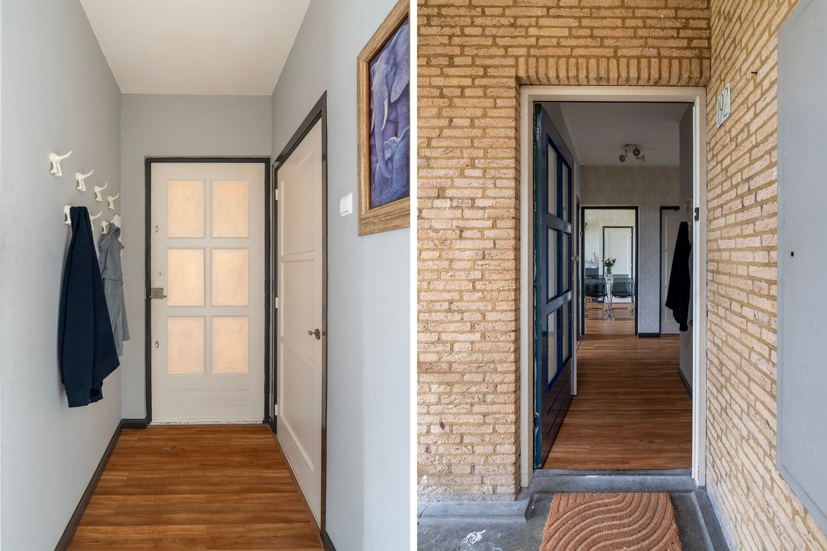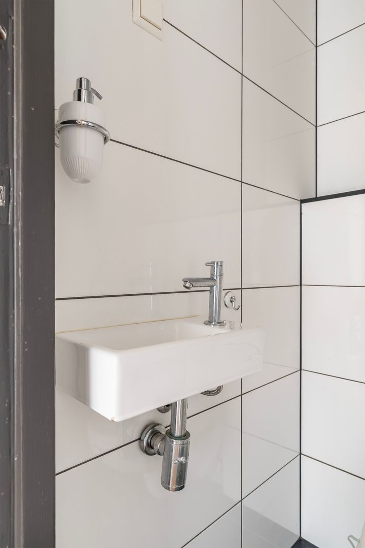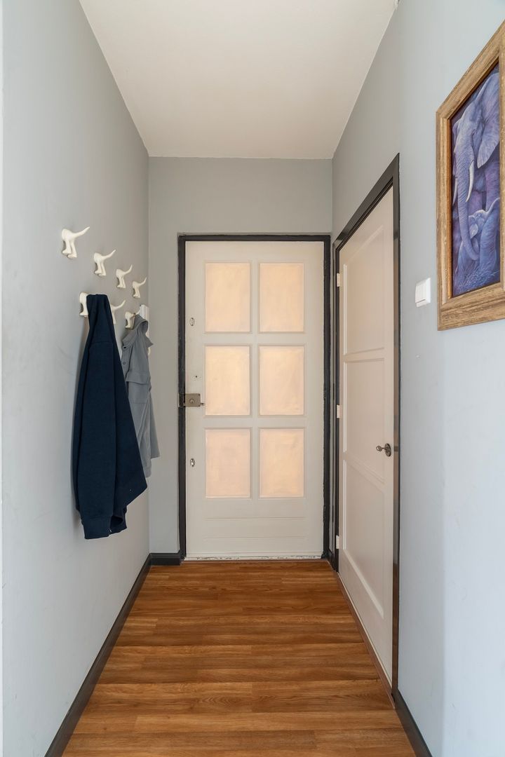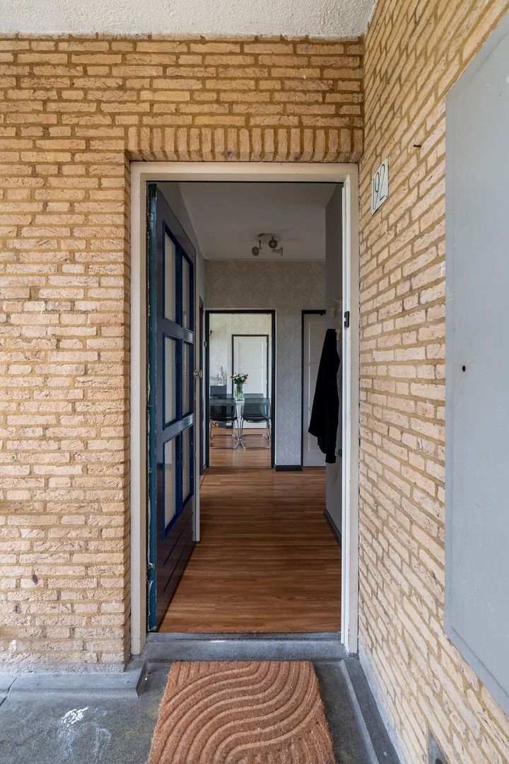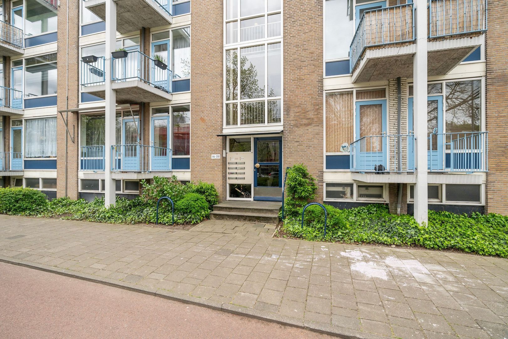 Entree via afgesloten portiek met brievenbus en bellentableau; binnentrap naar de 4e etage.