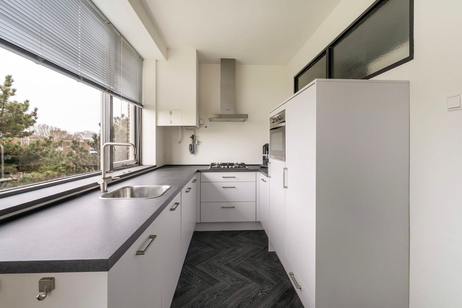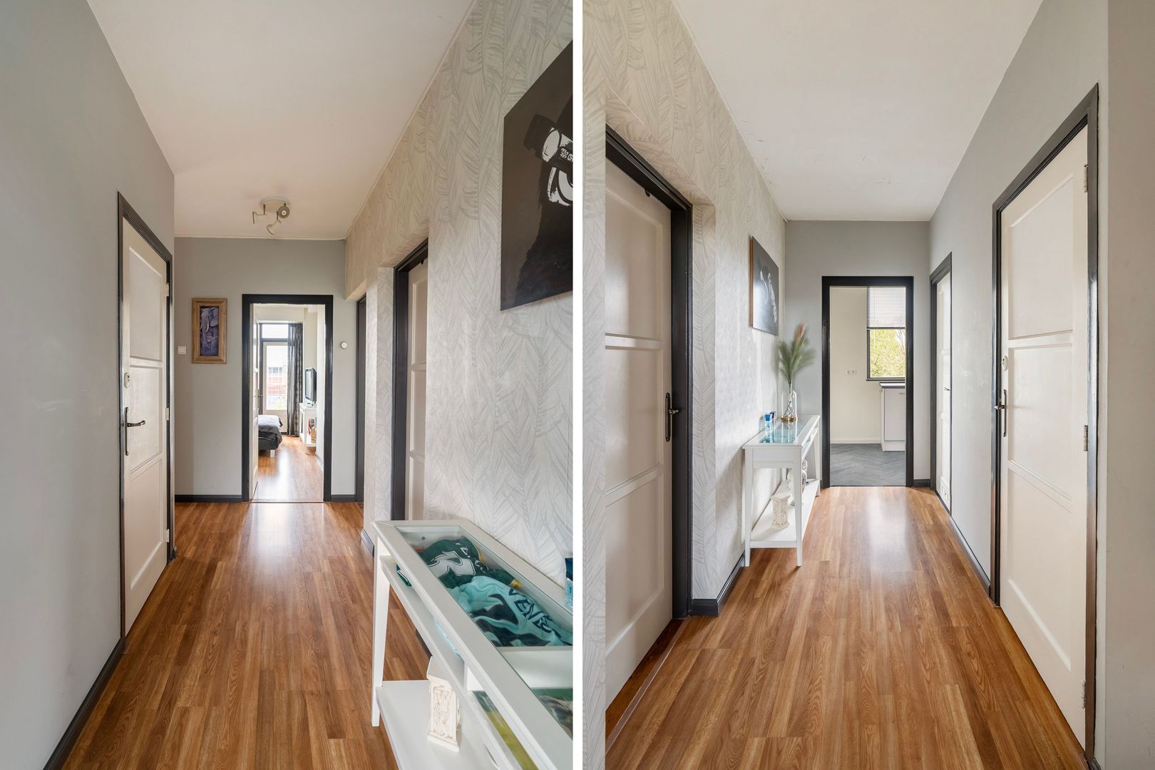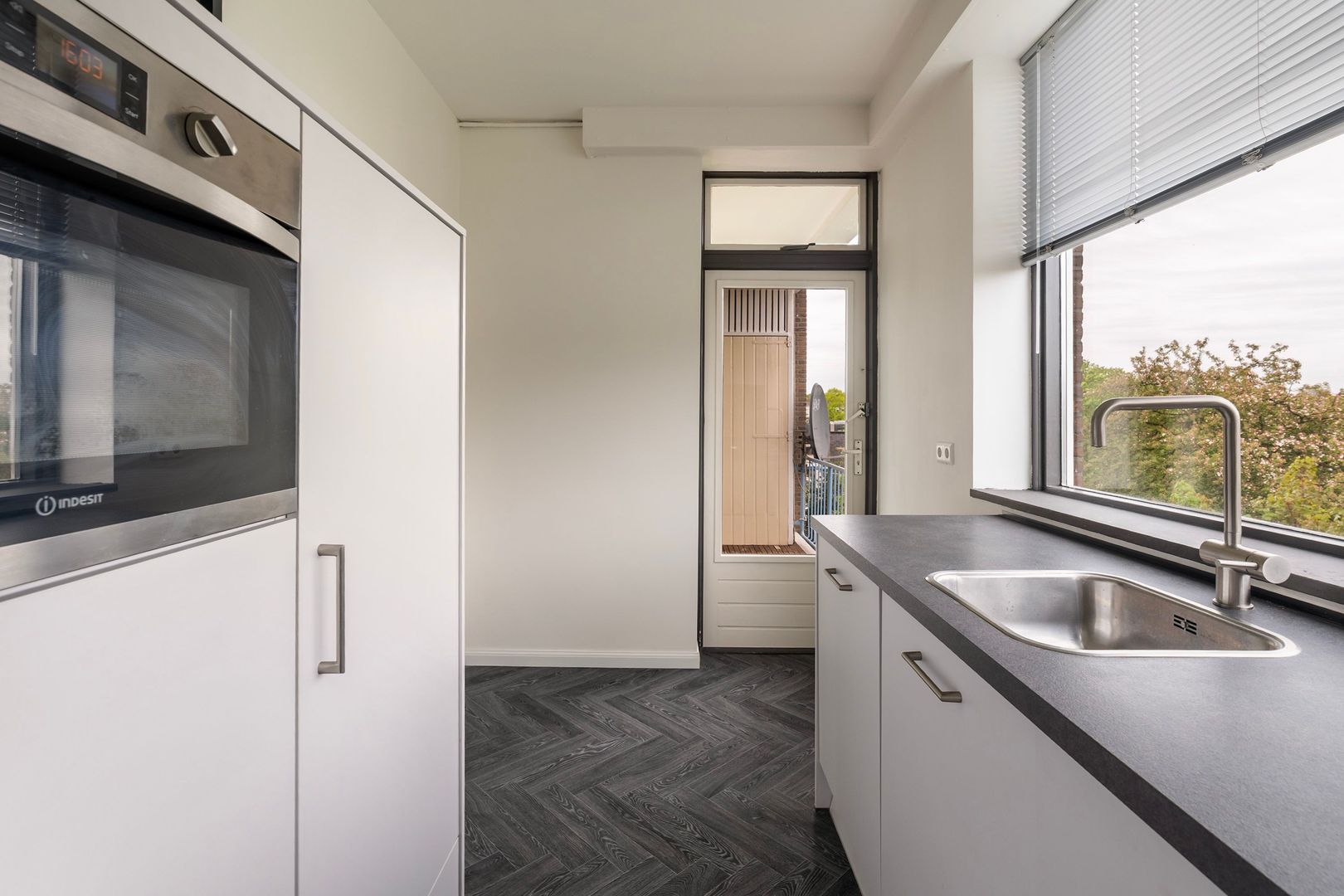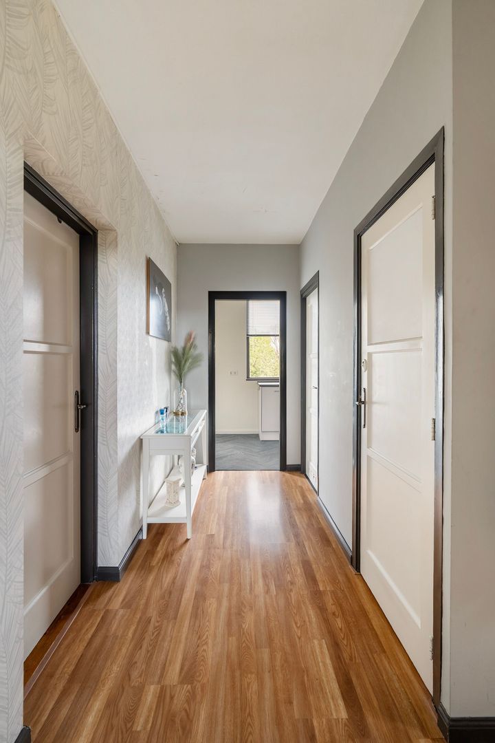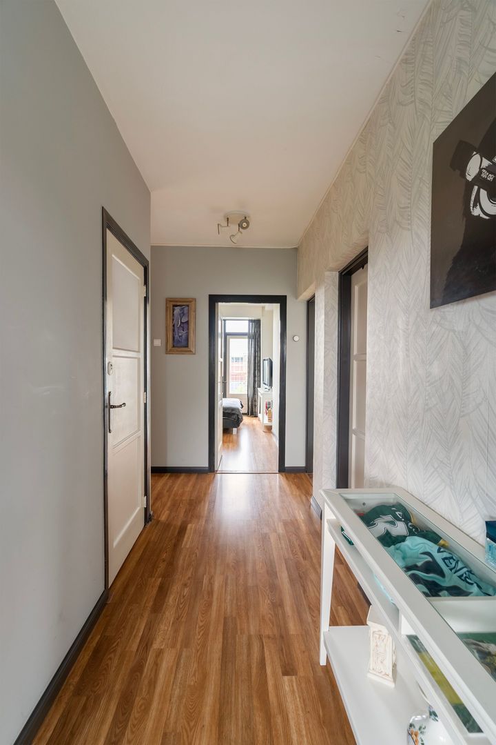 entree appartement; vanuit de hal is er toegang tot alle vertrekken; woonkamer met toegang tot het balkon aan de voorzijde; ruime 1e slaapkamer aan de voorzijde met deur naar het voorbalkon; ruime 2e slaapkamer aan de achterzijde met deur naar het achterbalkon; separaat toilet met fonteintje; moderne hoogglans witte keuken in U-vormige opstelling voorzien van alle inbouwapparatuur en met deur naar het achterbalkon; keurig betegelde badkamer met inloopdouche en wastafelmeubel.