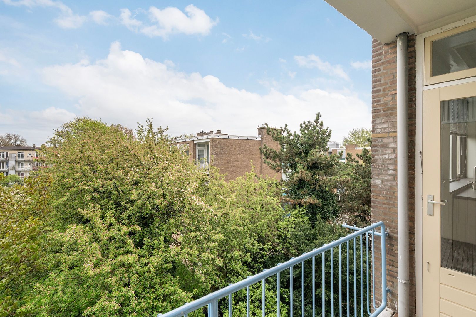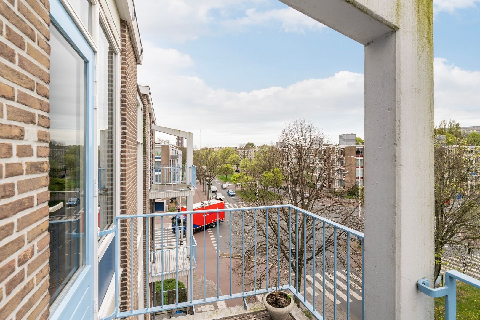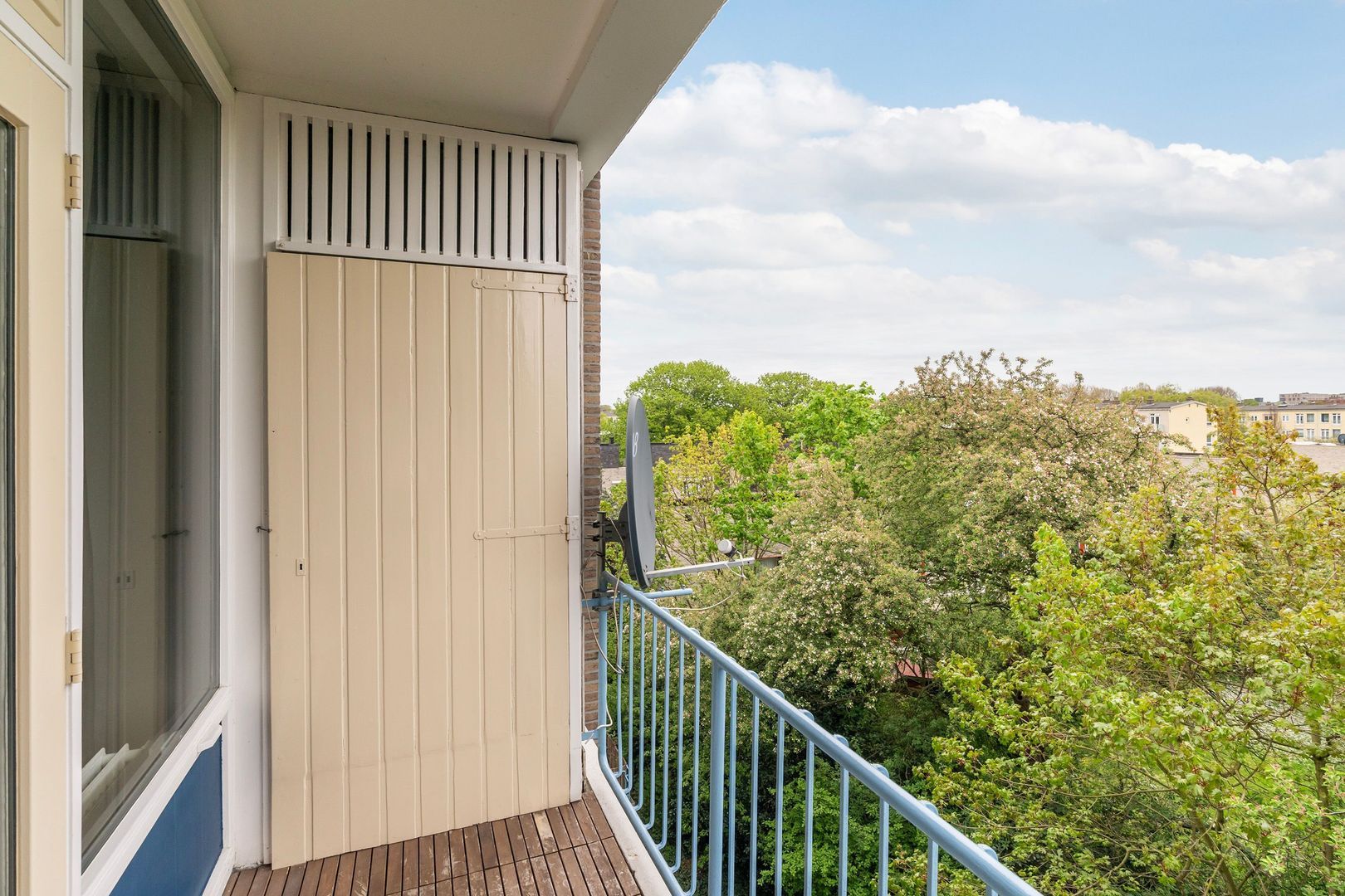 Keurig verzorgd 3-kamer appartement op de 4e (top) etage met 2 balkons, 2 ruime slaapkamers en een eigen fietsenberging.