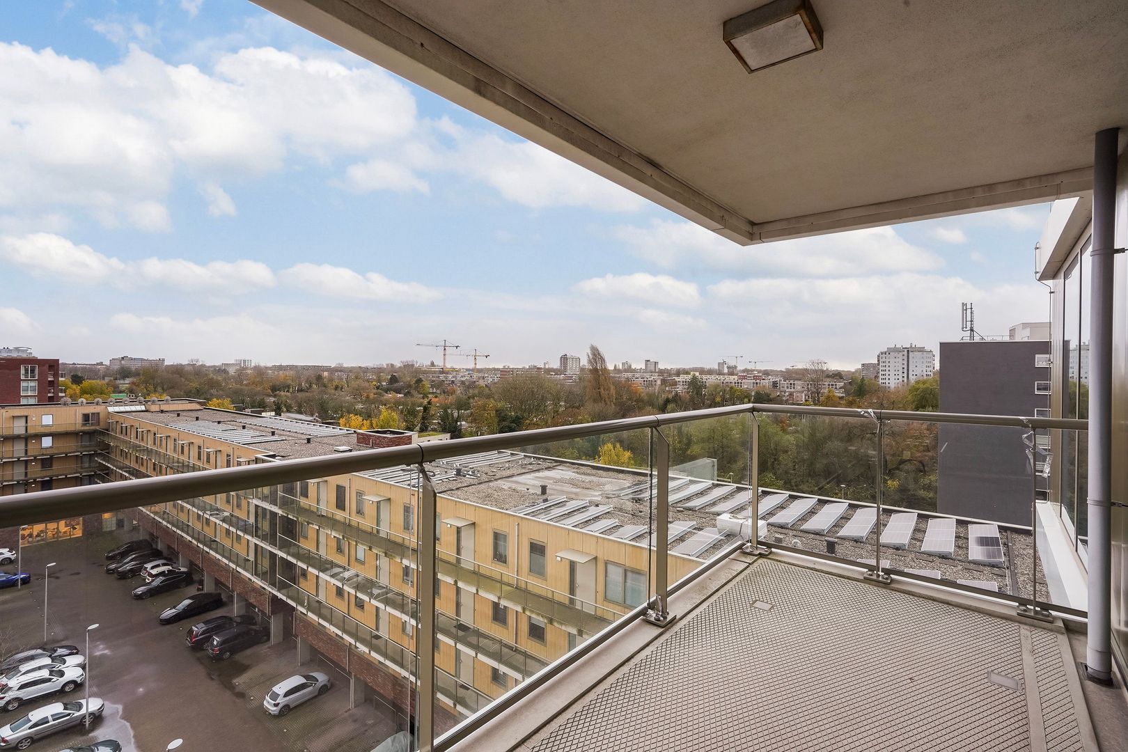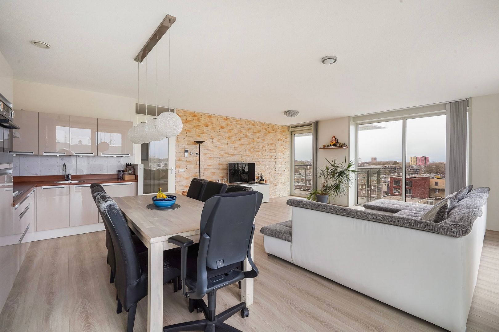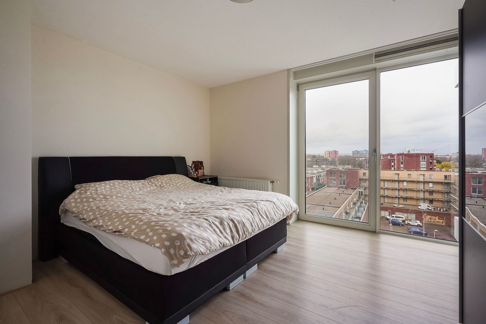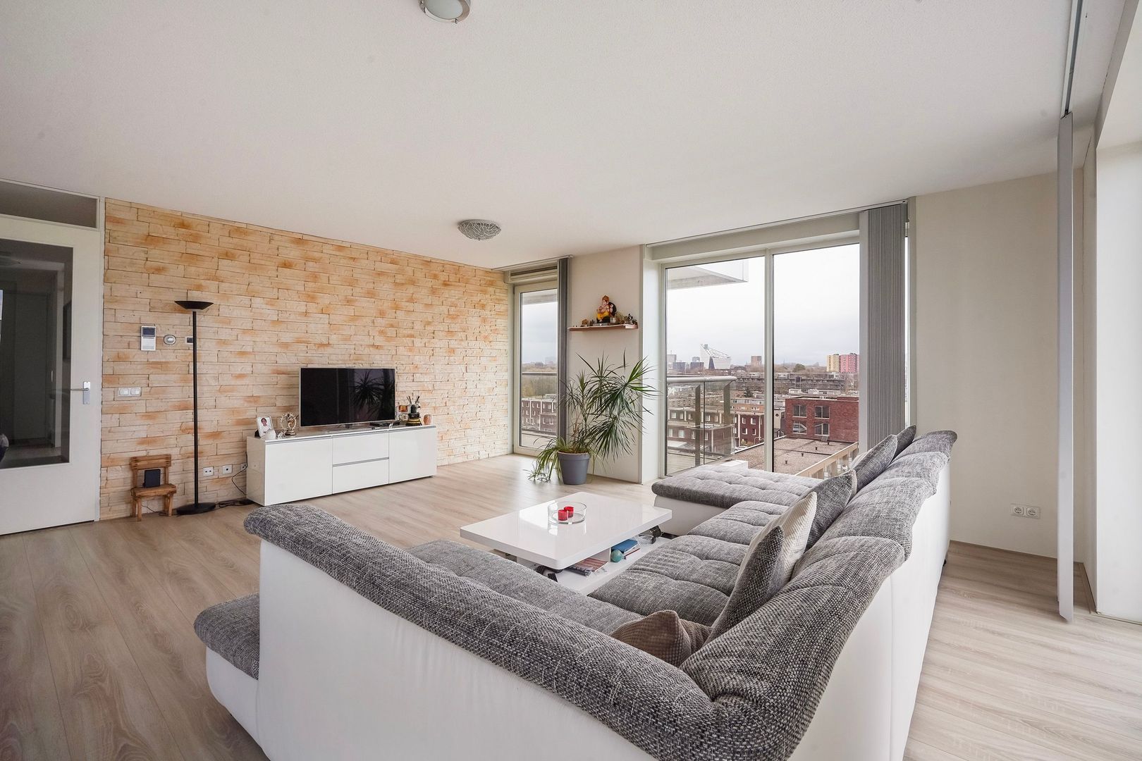 Afgesloten centrale entree met toegang tot de fietsenberging, trappenhuis en lift naar de woningentree op de 7e etage; hal met een grote bergkast en de meterkast; riante woonkamer met veel lichtinval door de hoekligging en toegang tot het royale balkon; moderne open keuken voorzien van een inductiekookplaat, afzuigkap, combimagnetron/-oven, koel-vriescombinatie en een vaatwasser; 1e riante slaapkamer aan de achterzijde; 2e slaapkamer aan de achterzijde met toegang tot het balkon; keurige ruime badkamer met een inloopdouche, wastafel en een inloopdouche; keurig separaat toilet;