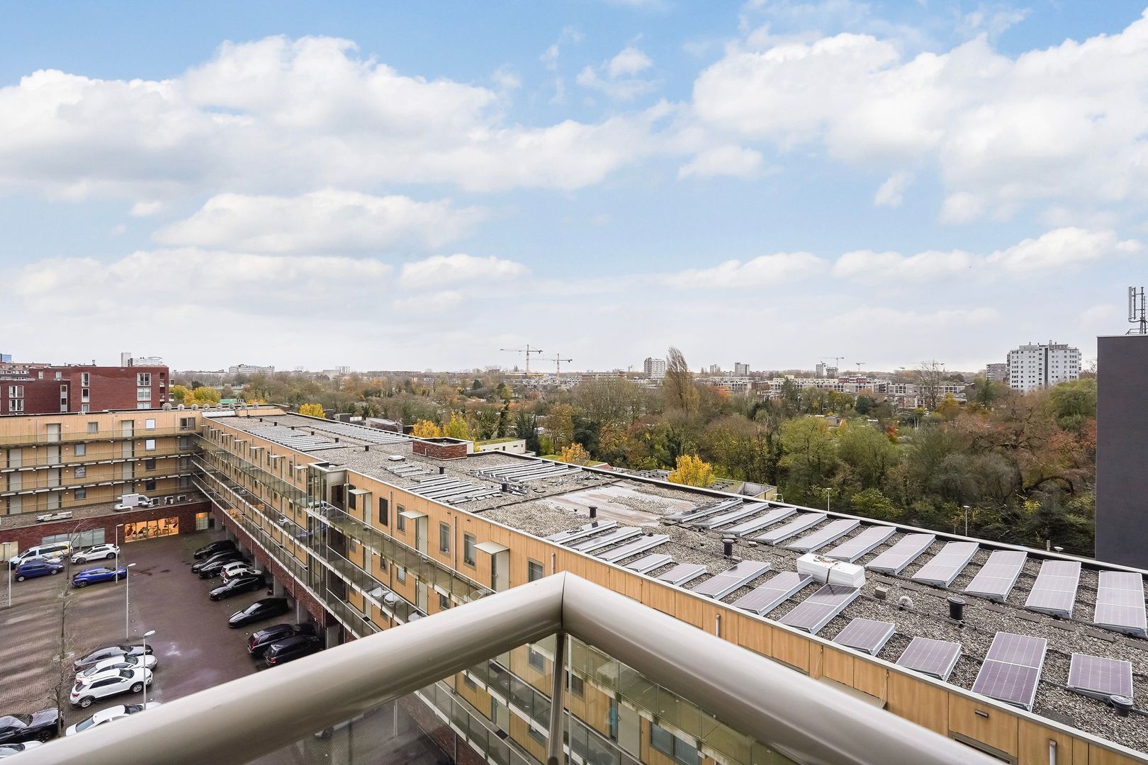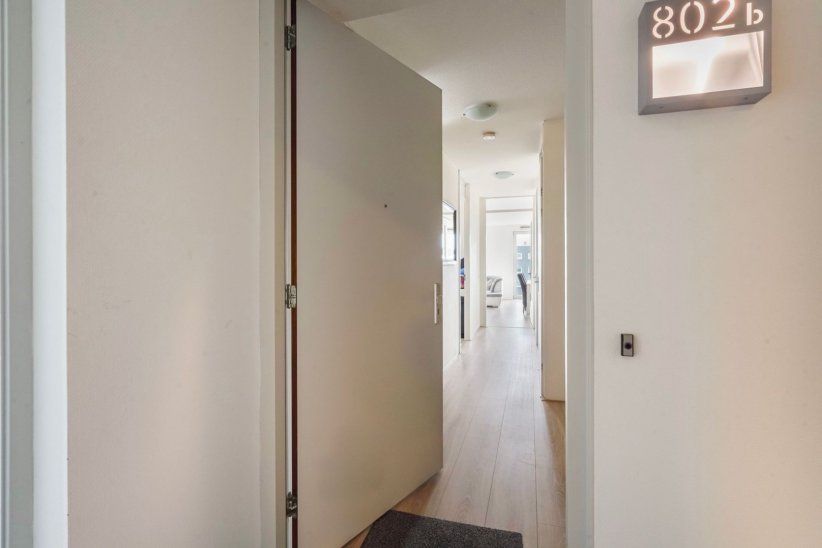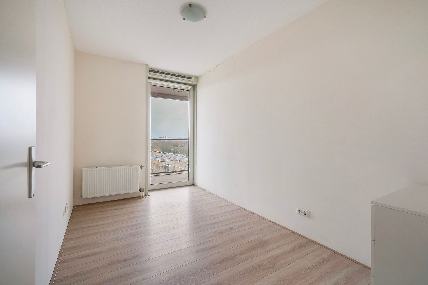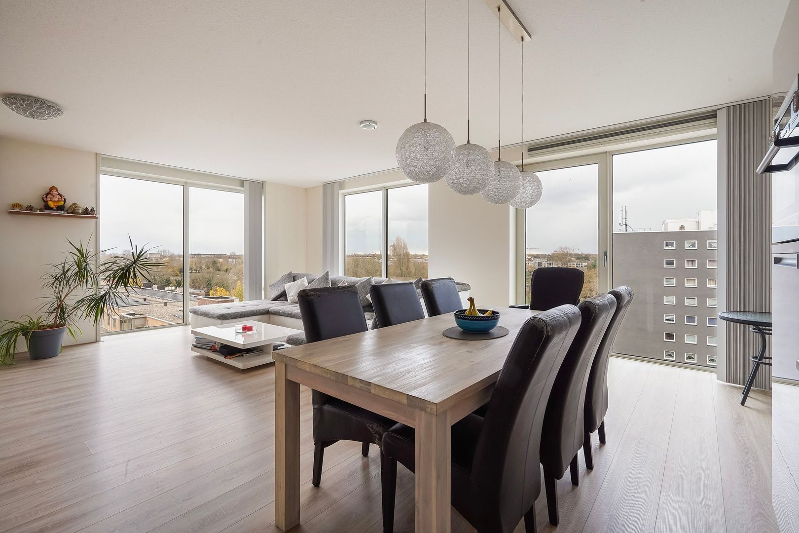 Afgesloten centrale entree met toegang tot de fietsenberging, trappenhuis en lift naar de woningentree op de 7e etage; hal met een grote bergkast en de meterkast; riante woonkamer met veel lichtinval door de hoekligging en toegang tot het royale balkon; moderne open keuken voorzien van een inductiekookplaat, afzuigkap, combimagnetron/-oven, koel-vriescombinatie en een vaatwasser; 1e riante slaapkamer aan de achterzijde; 2e slaapkamer aan de achterzijde met toegang tot het balkon; keurige ruime badkamer met een inloopdouche, wastafel en een inloopdouche; keurig separaat toilet;