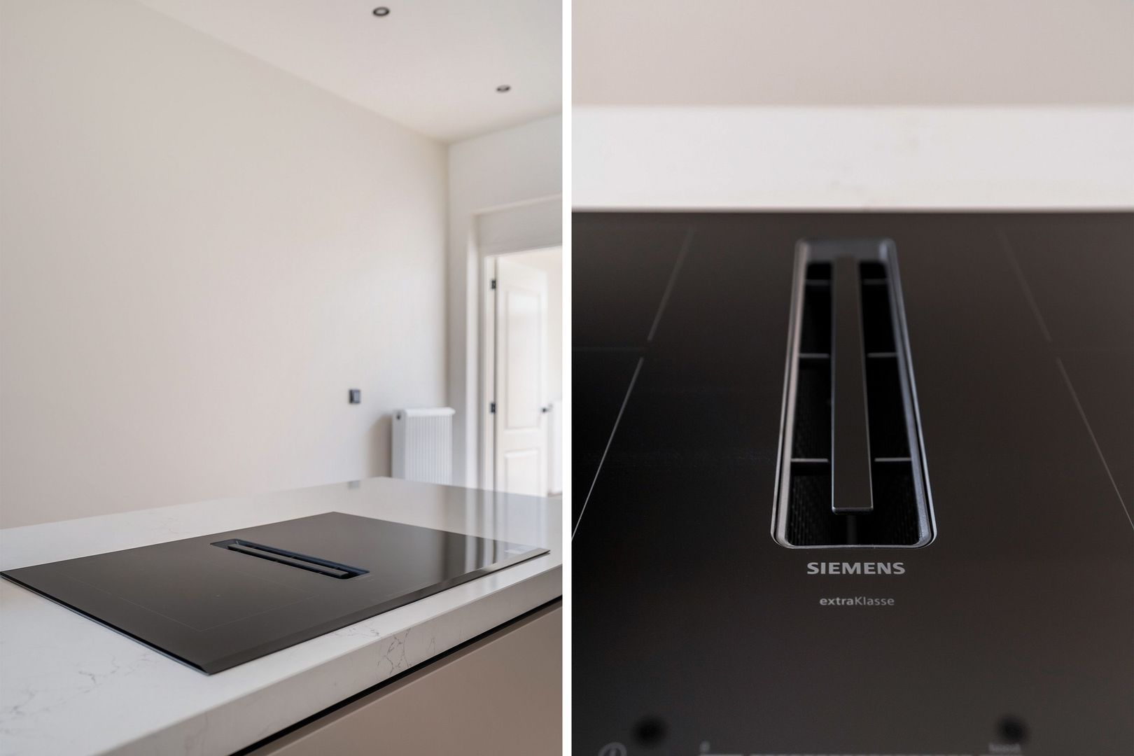 Entrance on the ground floor, hall, toilet, door to spacious kitchen with appliances, spacious living / dining room, bedroom / office, through the living room access to the second bedroom at the rear, bathroom with modern rain shower, hall, toilet, door to laundry room/utility room, third and largest bedroom at the front.