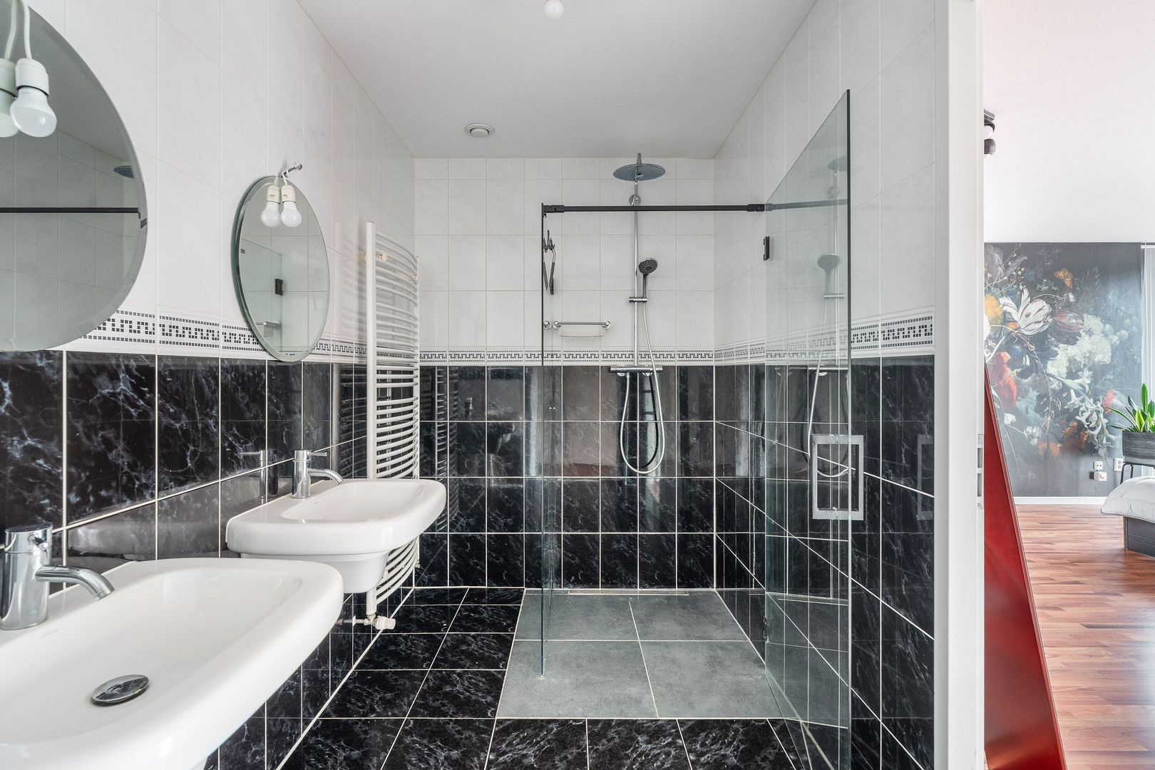 Trap vanuit de hal naar de overloop op de 1e etage; overloop met een werkruimte aan de voorzijde; kast met de wasmachine aansluiting; grote inloopkast; 2e toilet met fonteintje; riante 1e slaapkamer aan de voorzijde met lichtinval van 3 zijden; 2e slaapkamer aan de achterzijde; 3e ruime slaapkamer aan de achterzijde; ruime nette badkamer met 2 wastafels en een inloopdouche;