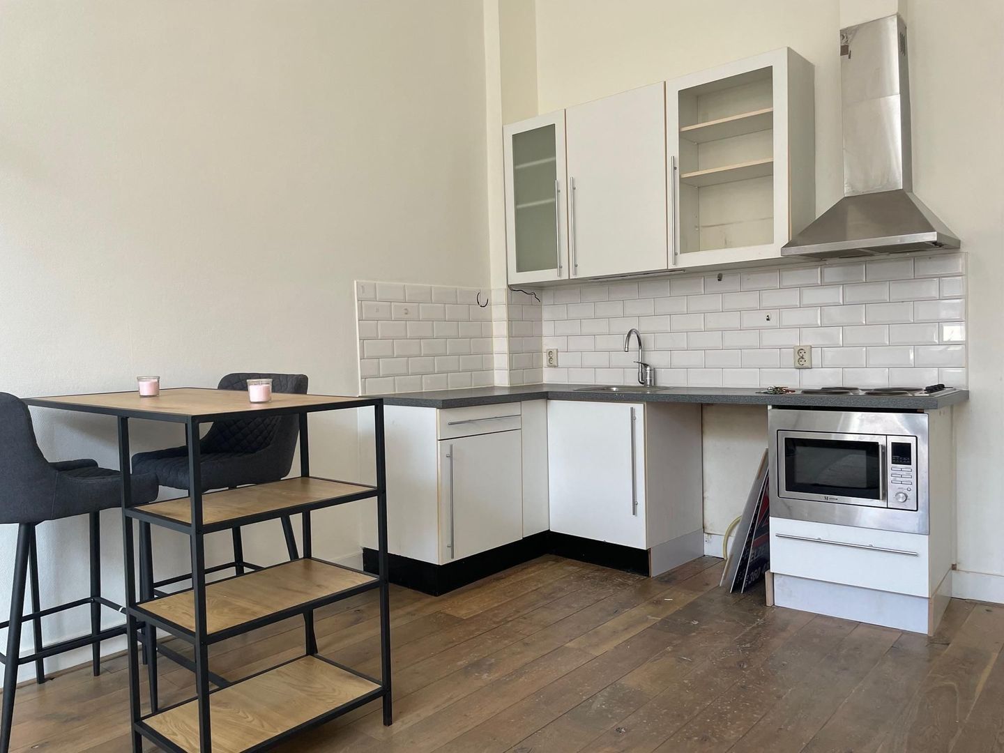 Centrale entree op de begane grond met trappenhuis en gang naar het appartement. Entree appartement; woonkamer met grote hoge raampartijen. Open keuken met diverse ingebouwde apparatuur zoals elektrische kookplaat, afzuigkap, losse onderbouw koelkast en ruimte open voor een oven; via de woonkamer deur naar de inpandige (slaap)kamer. Badkamer met douche, wastafel en toilet. Het complex beschikt over een centrale wasruimte en heeft aan de achterzijde een centrale buitenruimte waar een fiets geplaatst kan worden.