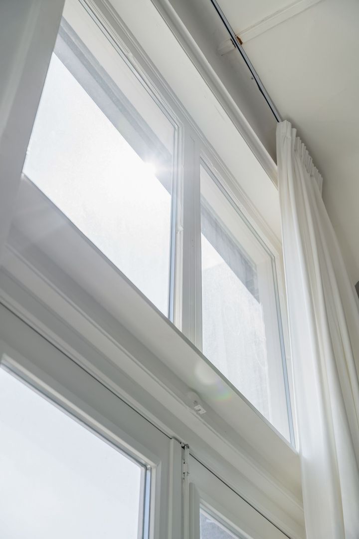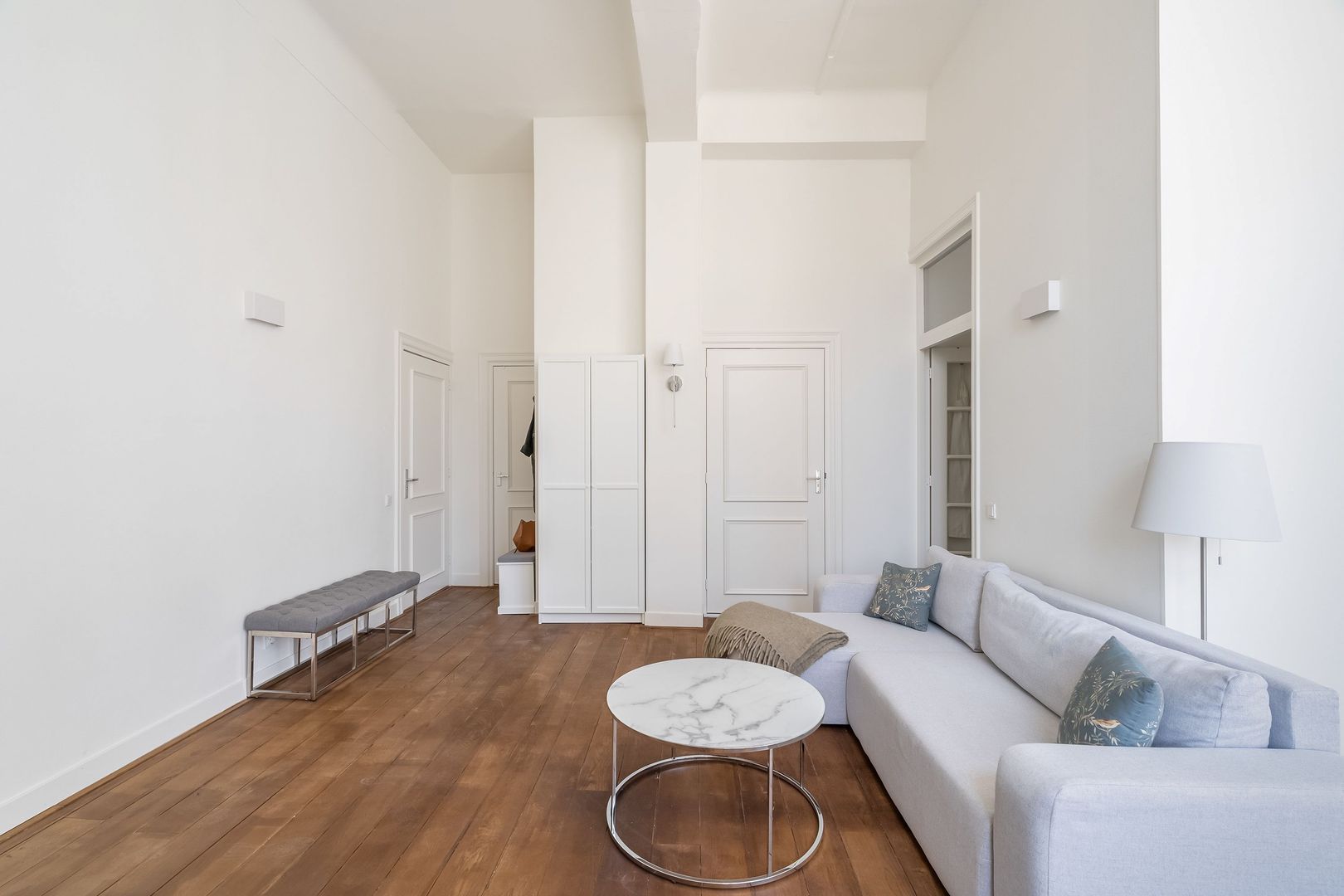 + Lichtrijke woonkamer met hoge raampartijen (plafondhoogte van 4 meter!) en openslaande deuren met Frans balkon (Z-W).